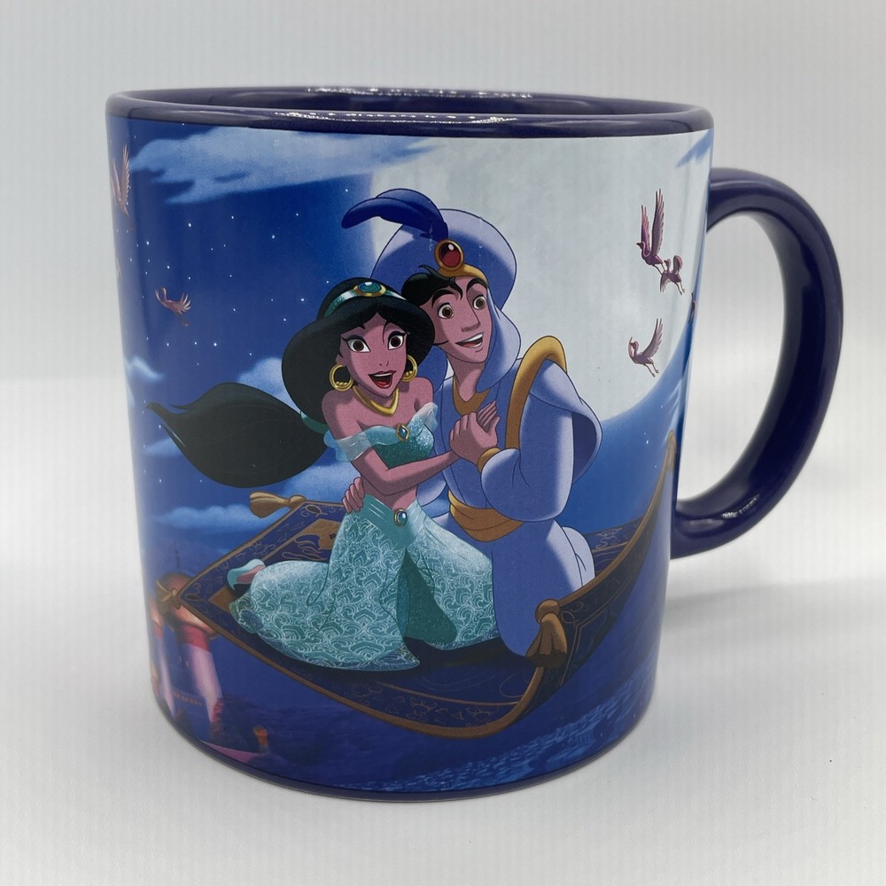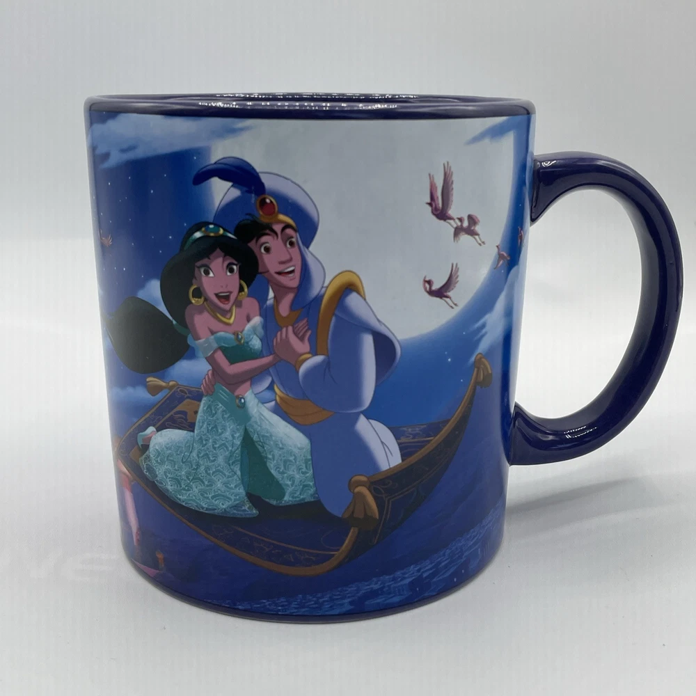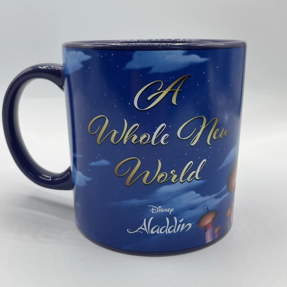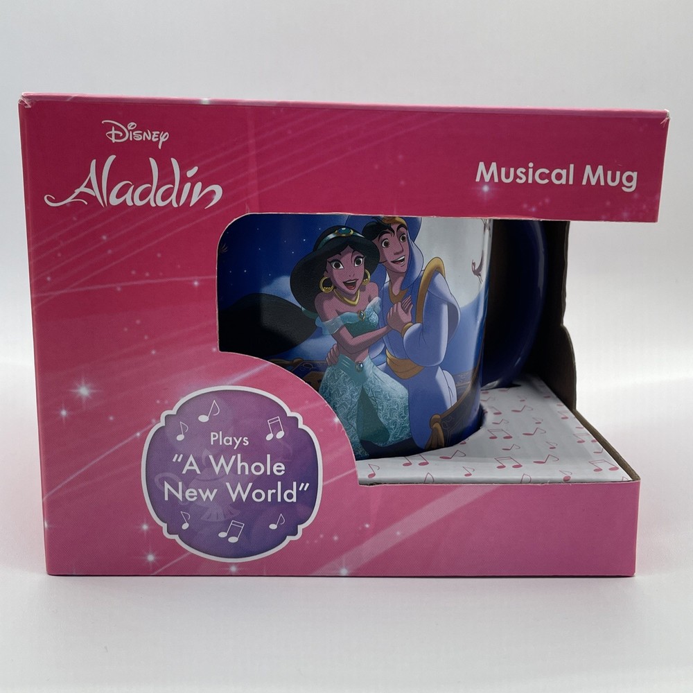 The product is a Disney Aladdin Musical Mug featuring Aladdin from the One Piece set. It has a round shape, blue color, and a capacity of 16 fl oz. The ceramic mug plays the song "A Whole New World" and is part of the Walt Disney brand. It is suitable for all occasions and has a traditional style. The mug is 4 inches in height and weighs 1 lb 13 oz.