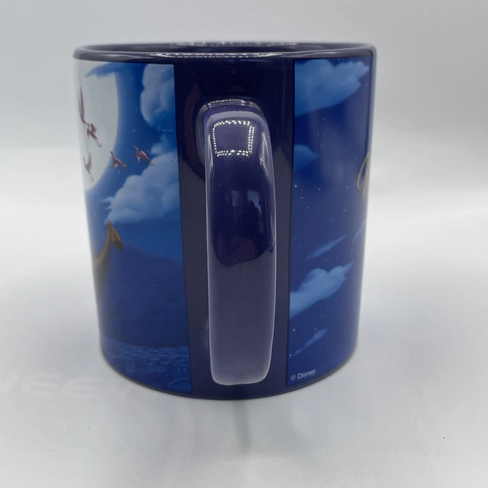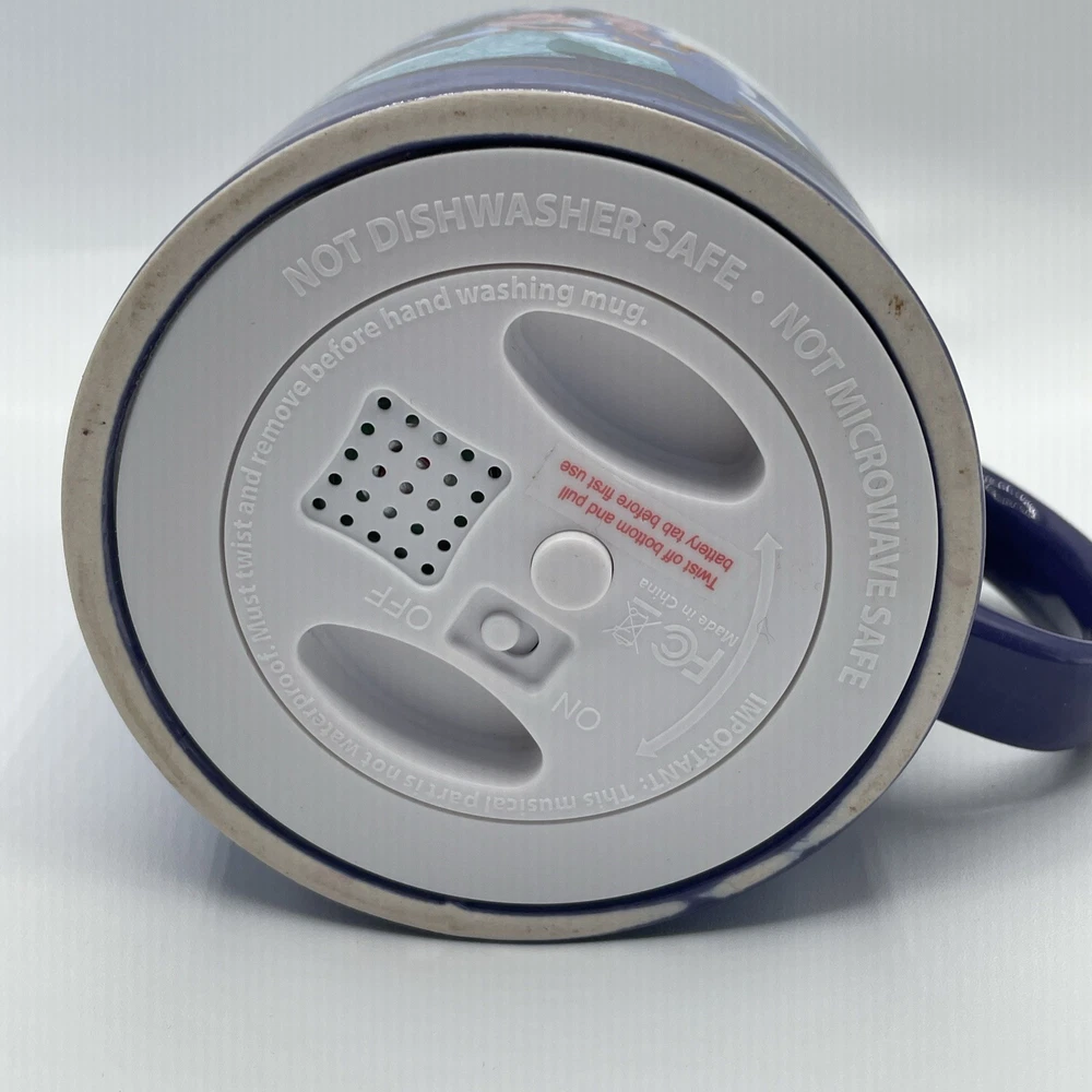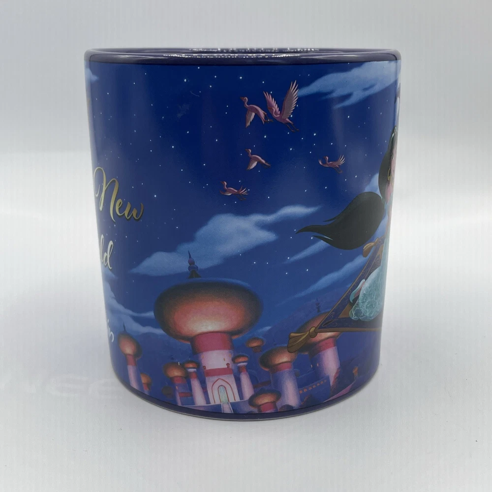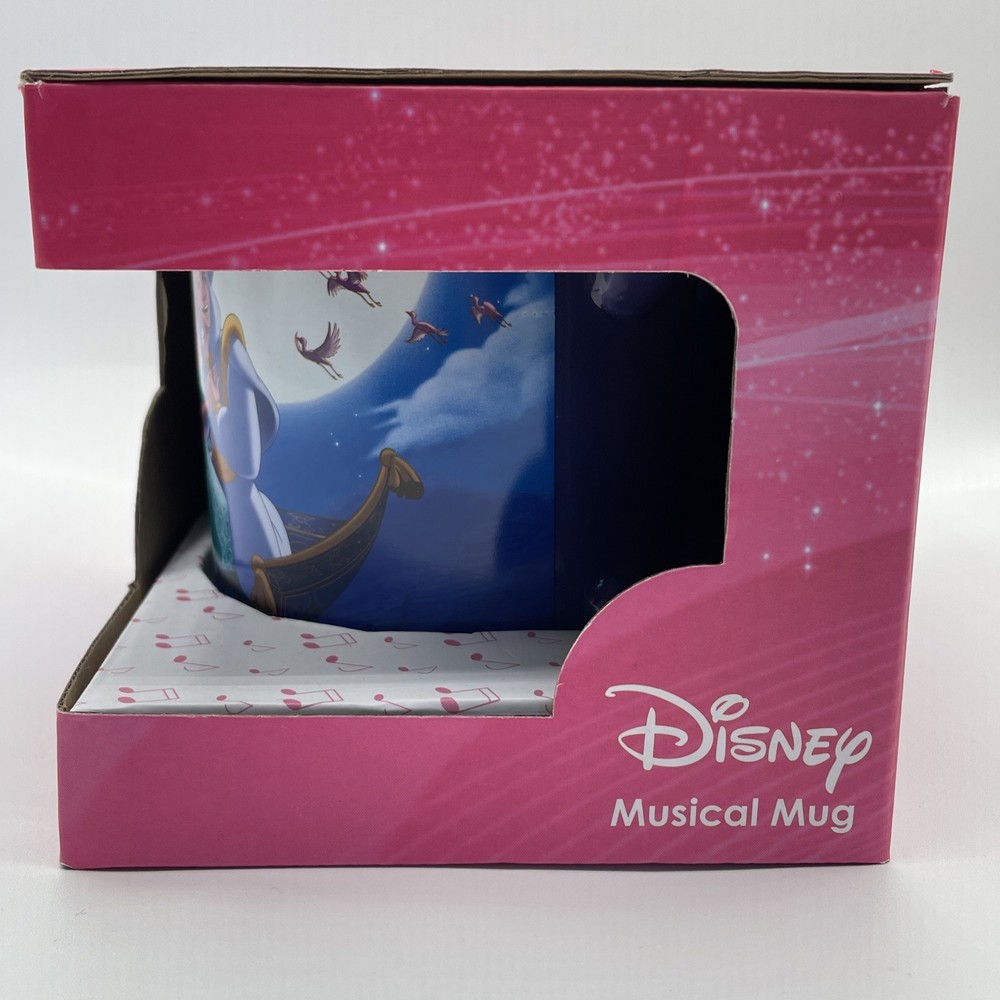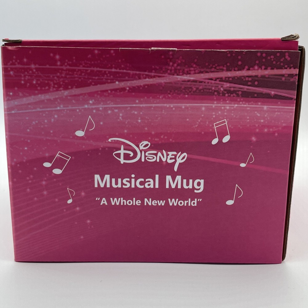 The product is a Disney Aladdin Musical Mug featuring Aladdin from the One Piece set. It has a round shape, blue color, and a capacity of 16 fl oz. The ceramic mug plays the song "A Whole New World" and is part of the Walt Disney brand. It is suitable for all occasions and has a traditional style. The mug is 4 inches in height and weighs 1 lb 13 oz.
