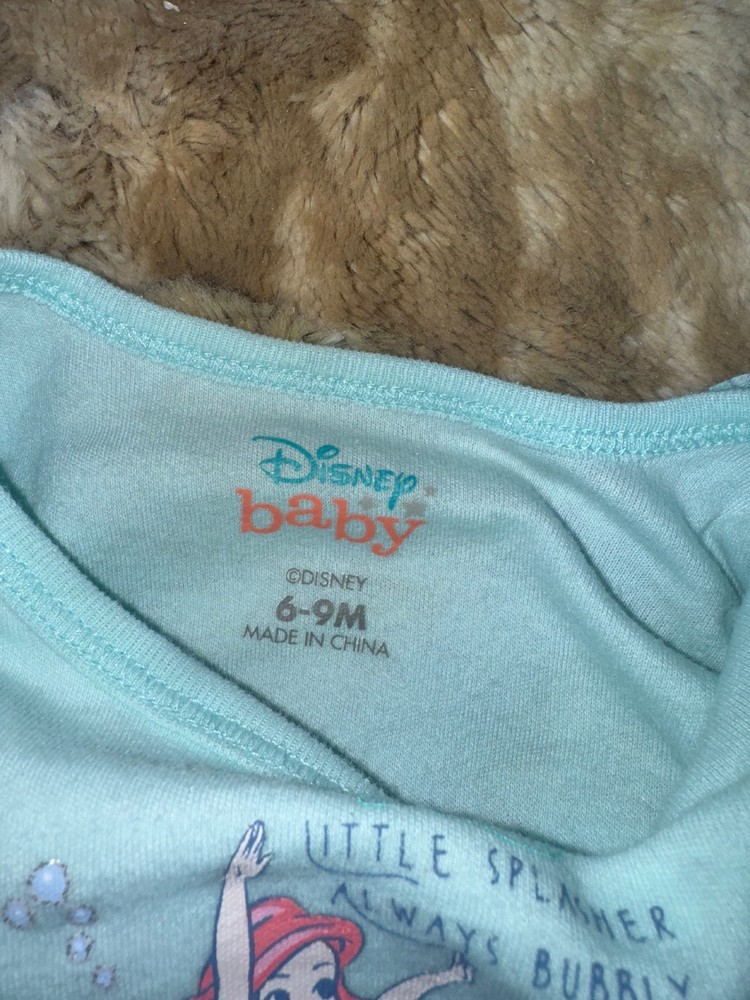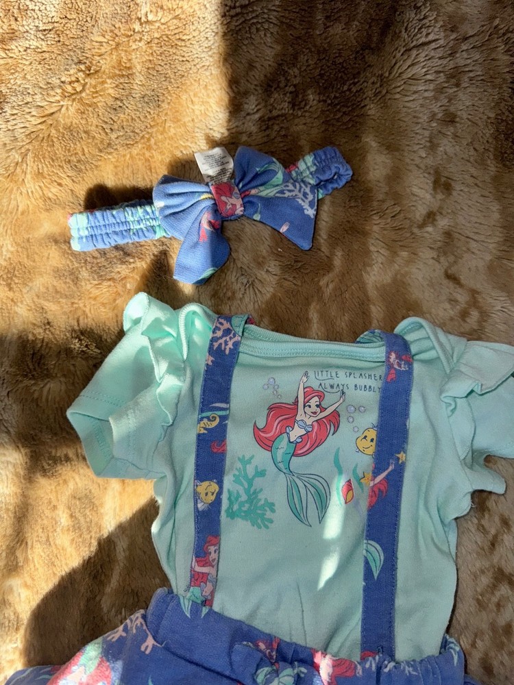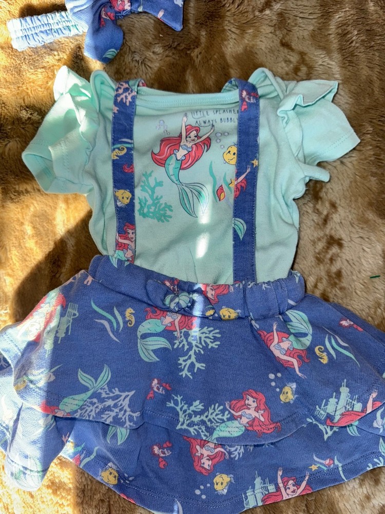 >BRAND< *Disney Baby* >PRODUCT DETAILS< *Baby blue shirt/snap bottoms with Ariel graphic *Blue skirt with suspenders *Matching scrunch bow! >SIZE< *6-9 months >CONDTION< *Great condition, no flaws noted *Smoke free home* *All clothing pieces will be washed and cleaned before shipping out*\