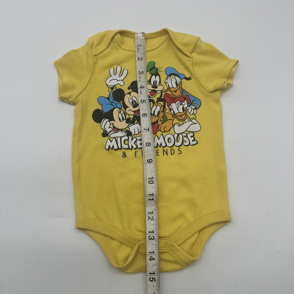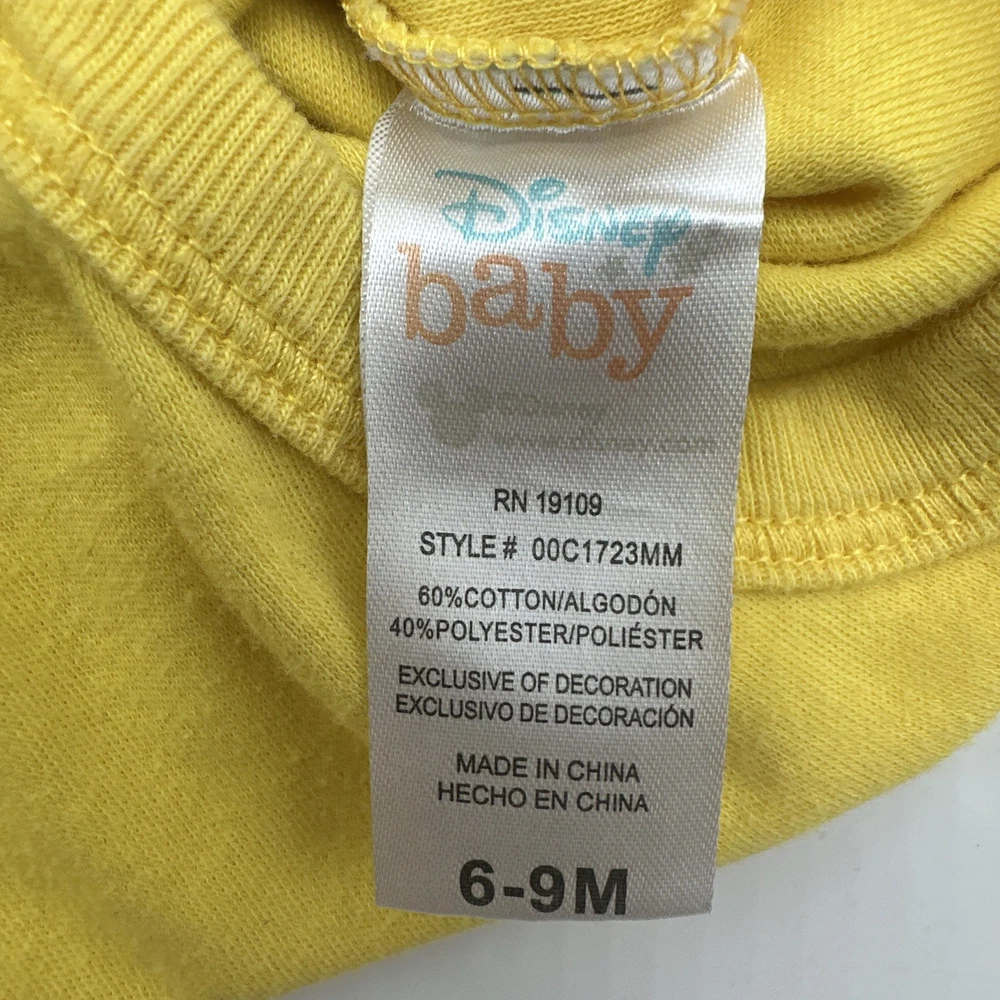 The Disney Baby One Piece Toddler Boys Size 6-9M in Yellow with Graphic Print Logo is a comfortable and stylish outfit suitable for a variety of occasions, such as travel, parties, or casual wear. Made from a blend of polyester and cotton, this one-piece features short sleeves, a crew neck, and snap closures for easy dressing. The cartoon and TV character theme, along with the designer look, adds charm to this classic piece, perfect for boys who love Disney. Ideal for summer, fall, and spring seasons, this bodysuit is a must-have for any toddler boy's wardrobe. Check pictures for flaws and measurements