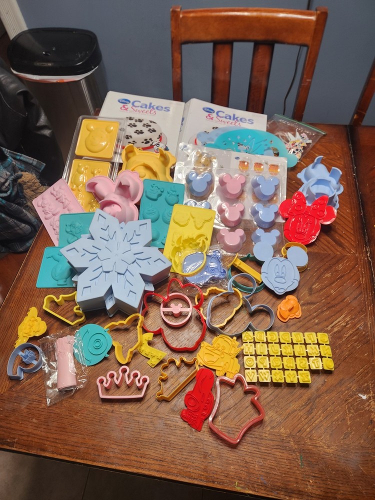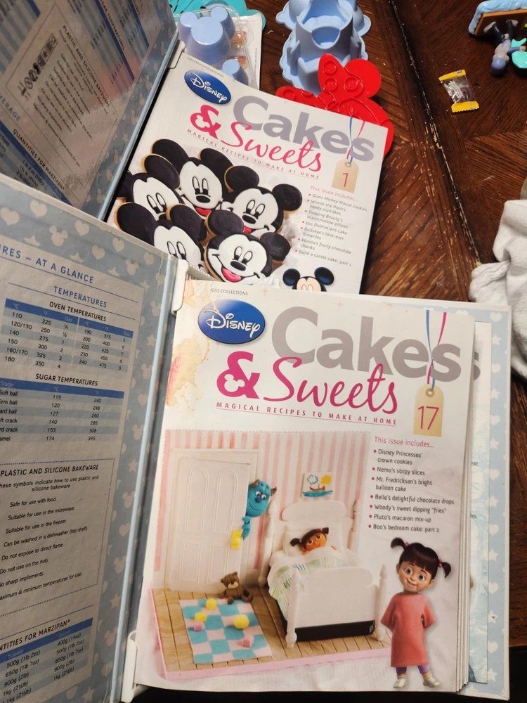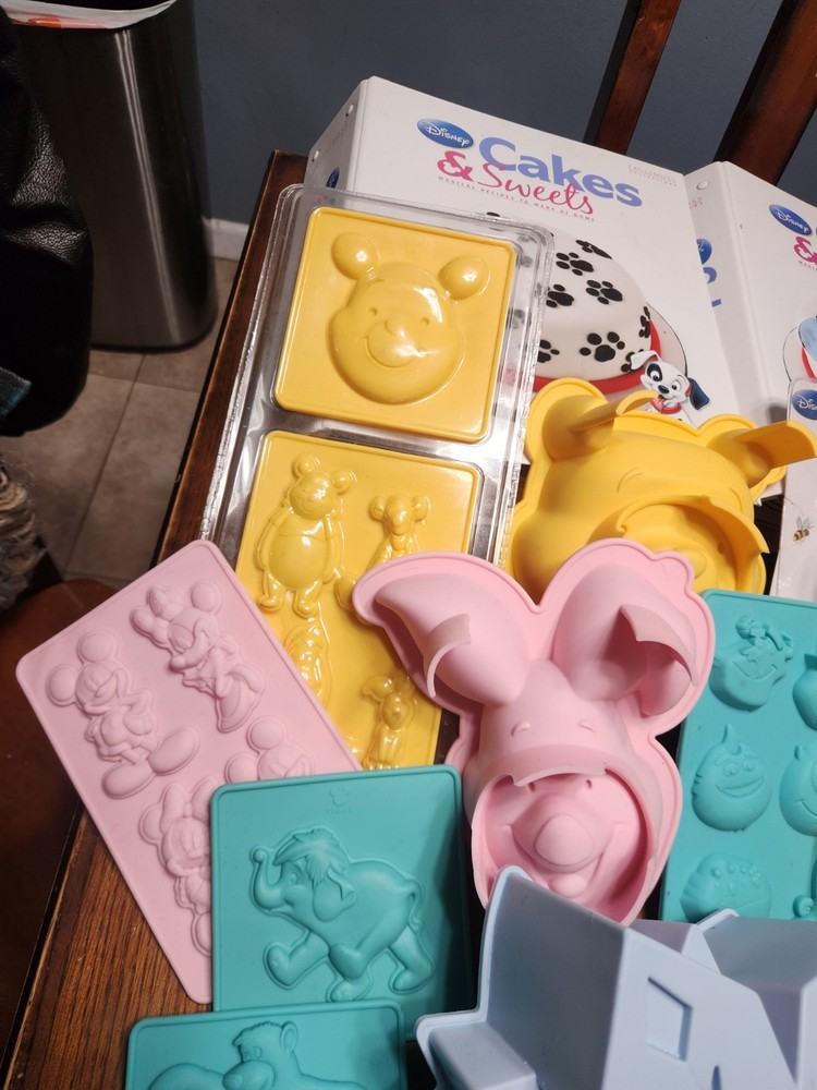 Set includes two binders that has Disney Cakes and Sweets issues 1-25 in two binders. Also included are cutters, molds, stencils and more of Disney Characters. Most if this stuff is brand new and never used, just been in storage for awhile, may have a little dust. what you see in pics is what you get!!!!