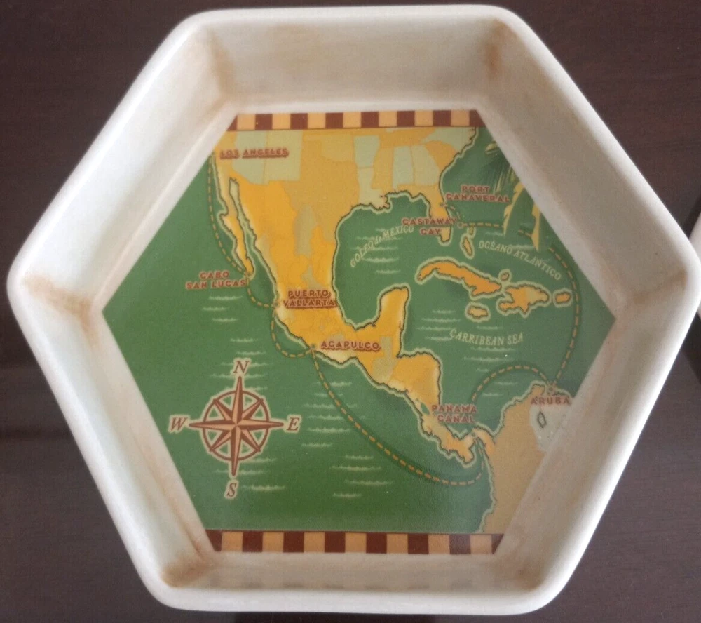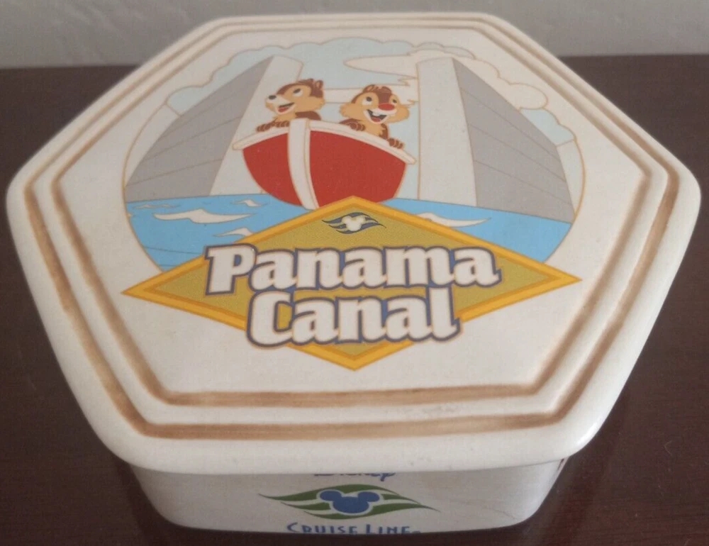 The product is a Disney Cruise Lines trinket box featuring the navigation path of the cruise line ship in 2008 through the Panama Canal. The design includes a magic ship theme and was manufactured in Panama. The item is part of the Disney franchise and falls under the category of collectibles.