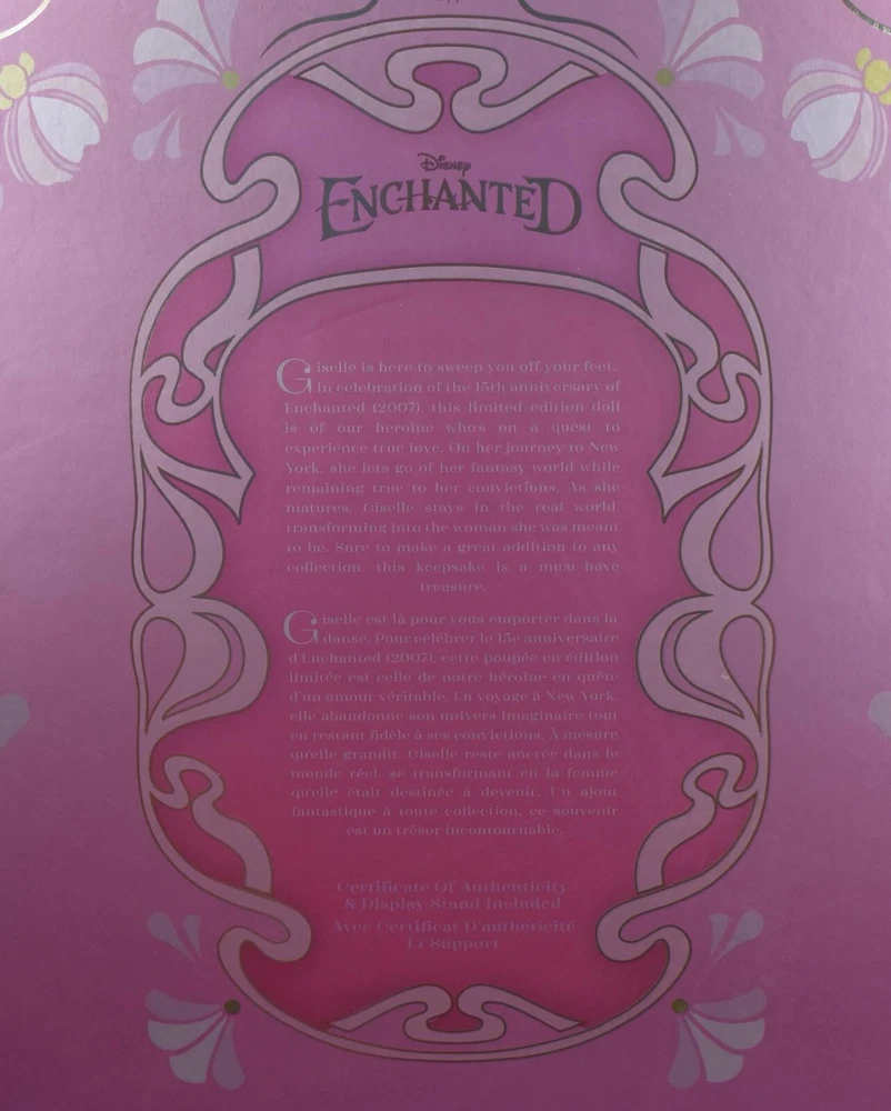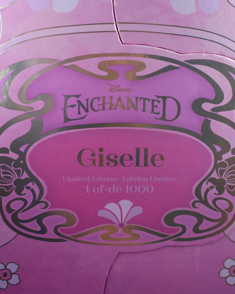Introducing the limited edition Disney D23 2022 17" Giselle Enchanted doll, celebrating the 15th anniversary of the beloved Disneyana collectable. This rare and highly sought-after doll is the perfect addition to any Disney or doll enthusiast's collection. Featuring Giselle, the beloved character from the Enchanted story, this doll is a must-have for fans of the movie and the Disney franchise. With its exquisite design and attention to detail, this doll is sure to enchant collectors of all ages. Don't miss out on the opportunity to own this rare piece of Disney history.