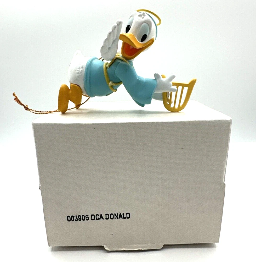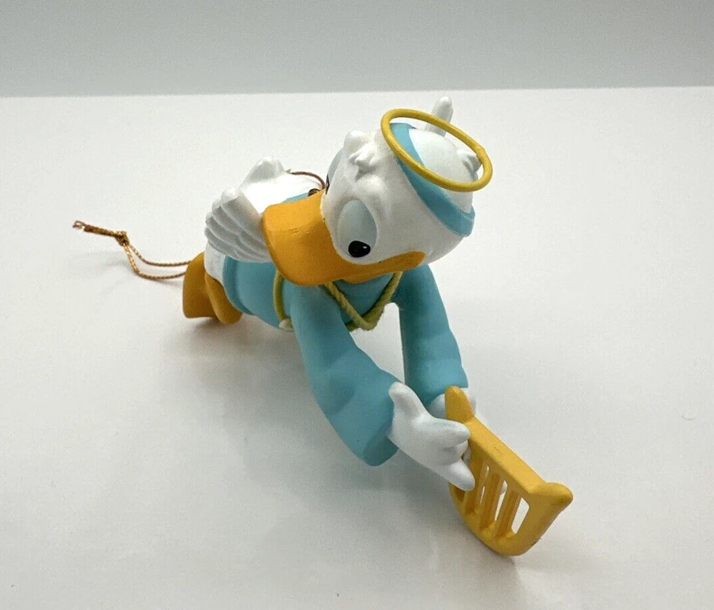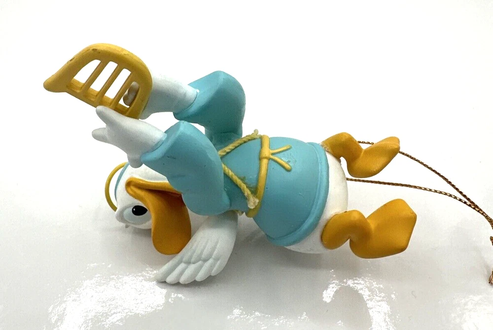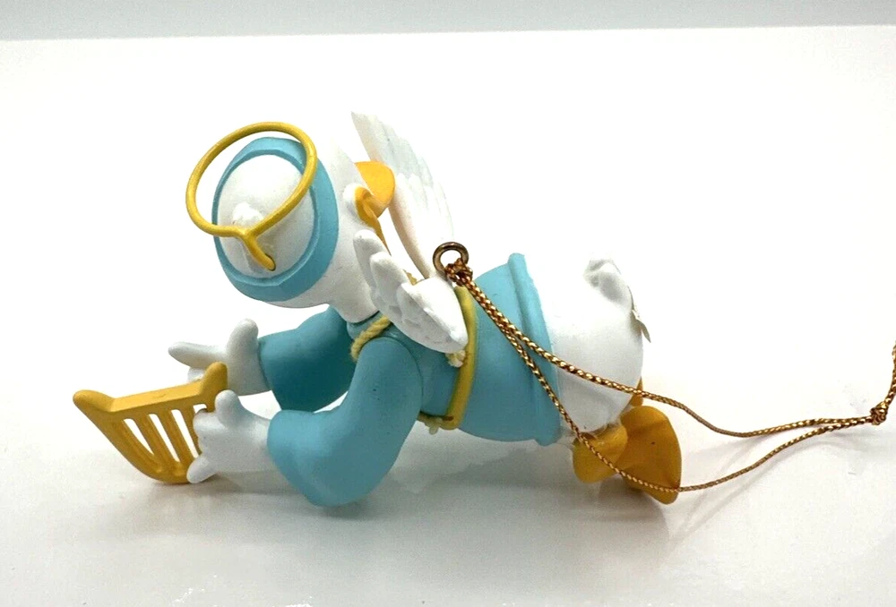 This vintage Disney DCA Donald Duck Flying Angel Christmas Ornament #003906 is a must-have for any collector or fan of the iconic character. The multicolored ornament features Donald Duck in his angelic form, flying through the sky with his wings spread out. The ornament comes with its original box, making it a great addition to any holiday décor or year-round display. The ornament is perfect for Christmas occasions and is sure to bring joy to any Disney enthusiast. The brand is Disney and the type is Donald Duck Angel, making it a unique and sought-after piece. Add this to your collection or give it as a gift to a fellow fan. Pre-owned condition. See photos.