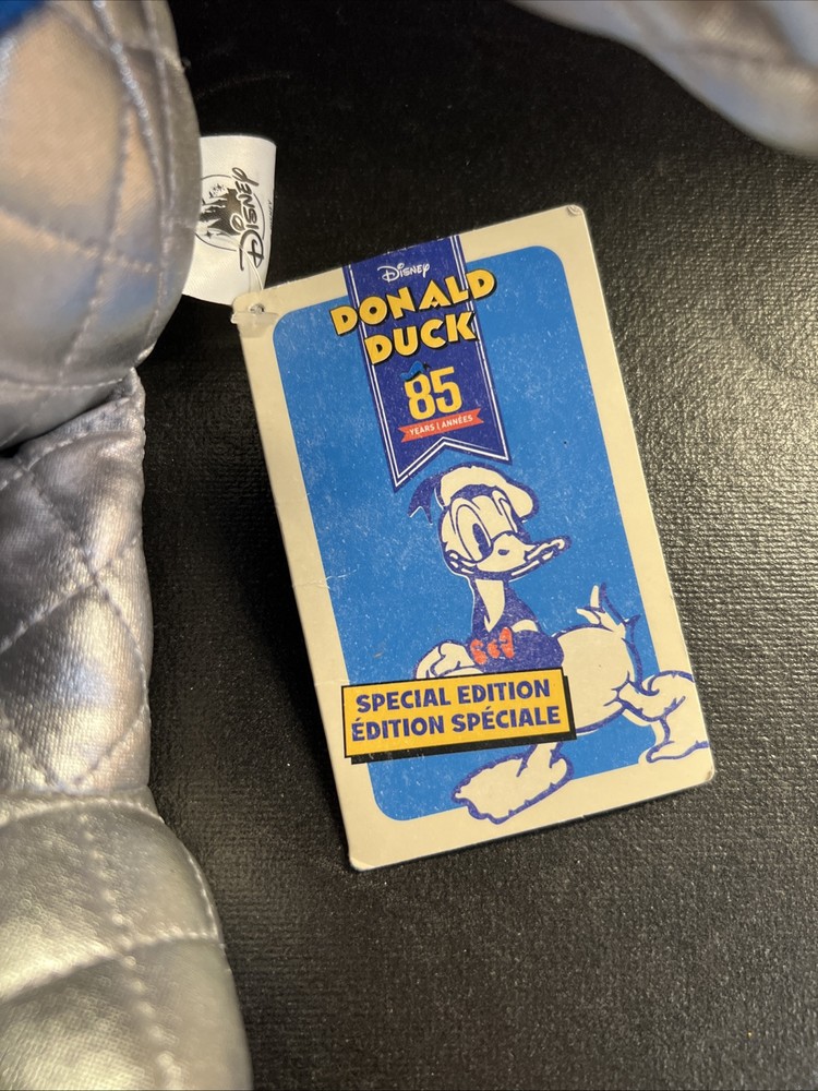 Celebrate a classic with the Disney Donald Duck 85th Anniversary Metallic 15" Plush, a special edition collectible that shines in any Disneyana collection. This plush toy, adorned with shimmering metallic accents, honors the beloved character's enduring legacy and adds a touch of sparkle to your display. Crafted with care and attention to detail, this plush is a testament to the enduring charm of Donald Duck. Perfect for fans and collectors alike, it's a delightful nod to the whimsical world of Disney, ready to take its place as a treasured keepsake in your home or office.