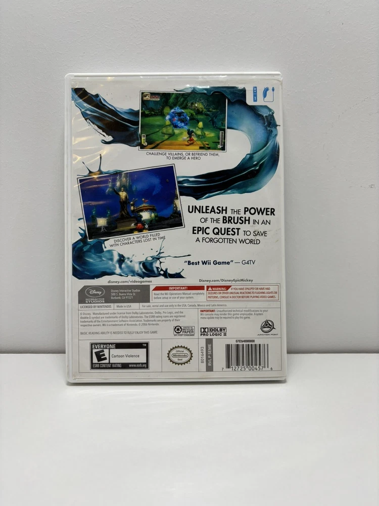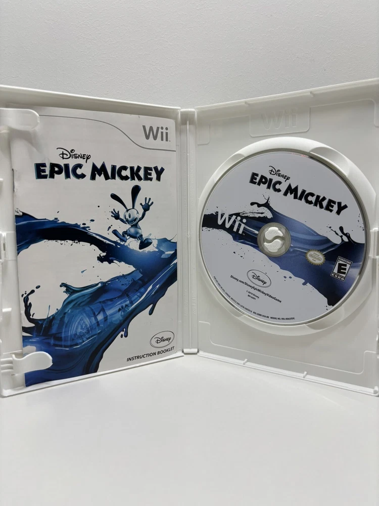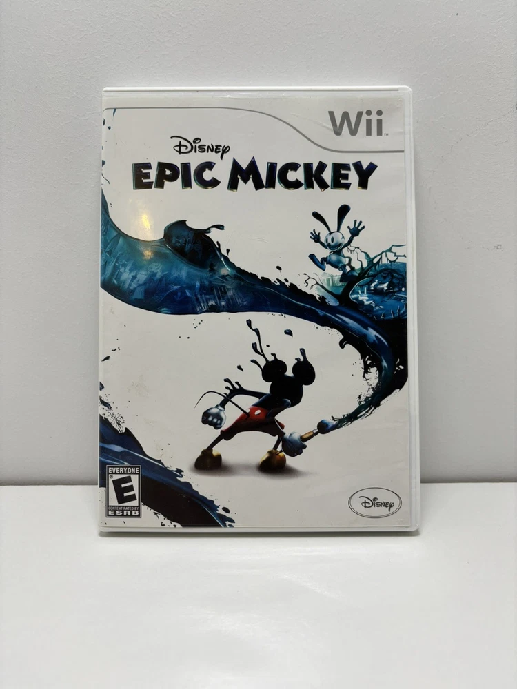This is a complete and tested Nintendo Wii game titled "Disney Epic Mickey." It includes a manual and is part of the Disney Epic Mickey video game series. The game is published by Disney Interactive Studios and falls under the Action & Adventure genre. It is rated E for Everyone and is designed for the NTSC-U/C (US/Canada) region.