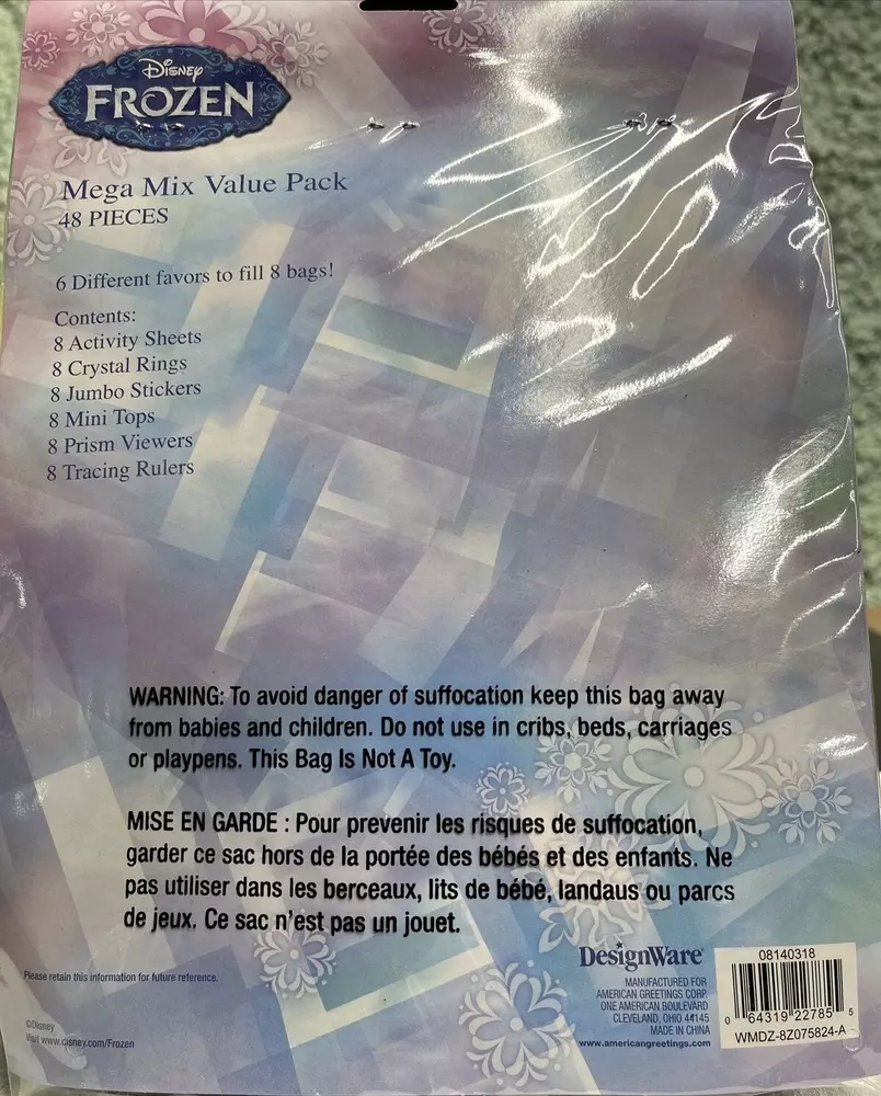 Disney Frozen 48pc Mega Mix Value Pack Party Pack Rings Stickers Tracing Rulers Disney Frozen MEGA MIX VALUE PACK 48 PIECES 6 DIFFERENT FAVORS TO FILL 8 BAGS ! CONTENTS: 8 - ACTIVITY SHEETS 8 - CRYSTAL RINGS 8 - JUMBO STICKERS 8 - MINI TOPS 8 - PRISM VIEWERS 8 - TRACING RULERS BRAND NEW ! BUY MORE SAVE MORE ! NOT FOR CHILDREN UNDER 3 YEARS OLD ! SMALL PART ADVISORY !!!