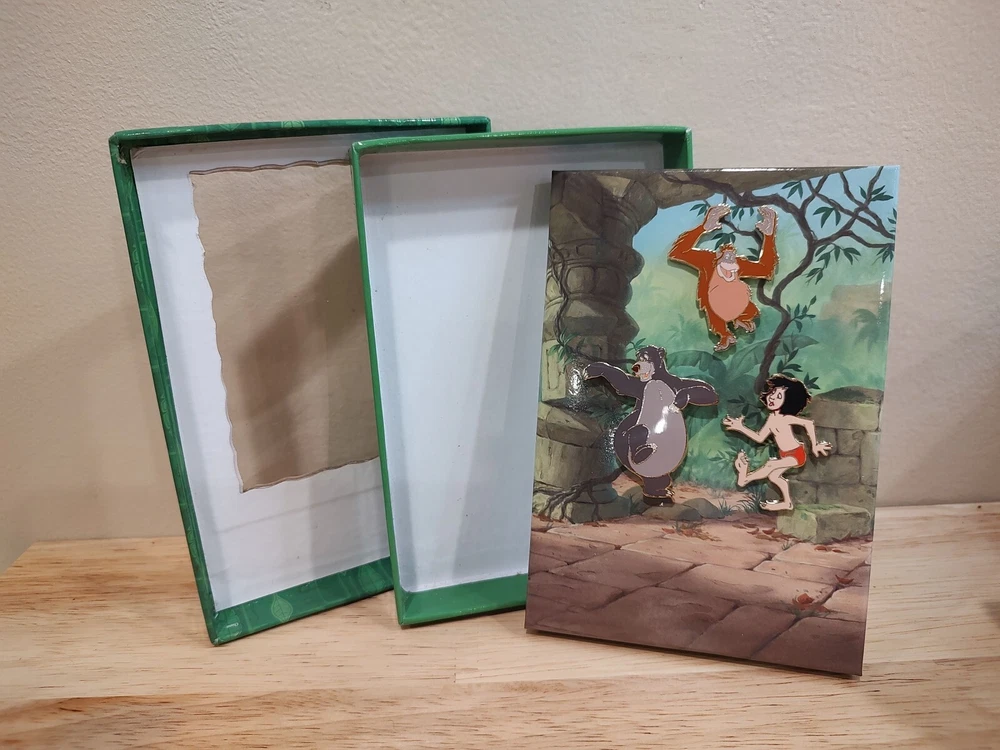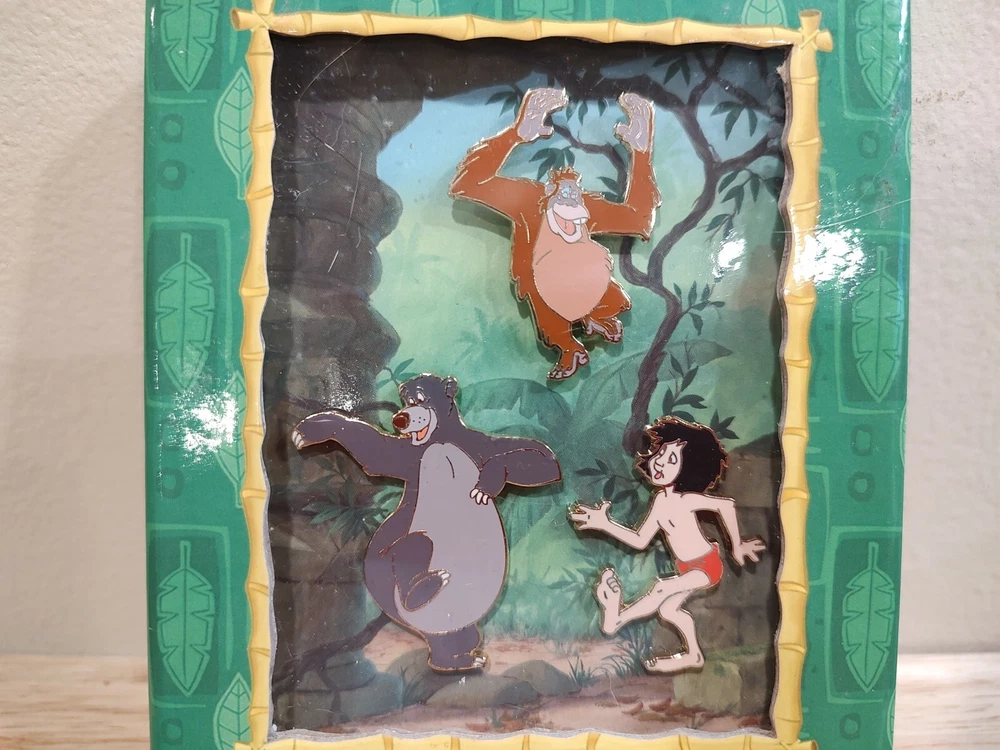 Disney Jungle Book 40th Anniversary Edition Set Of 3 Hat/Pins Moglie Baloo Louie, very nice, box is 6"x4", pins are approximately 1.5"-2" each. Never removed from box.