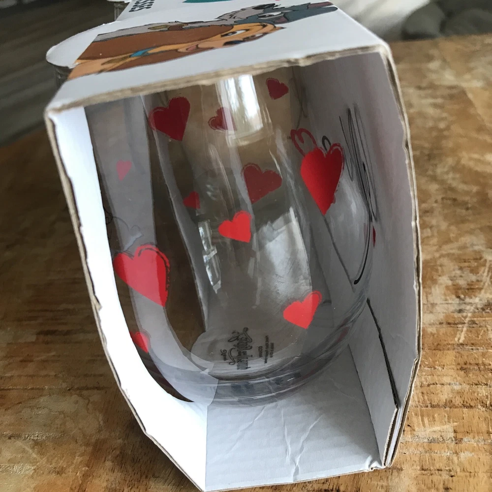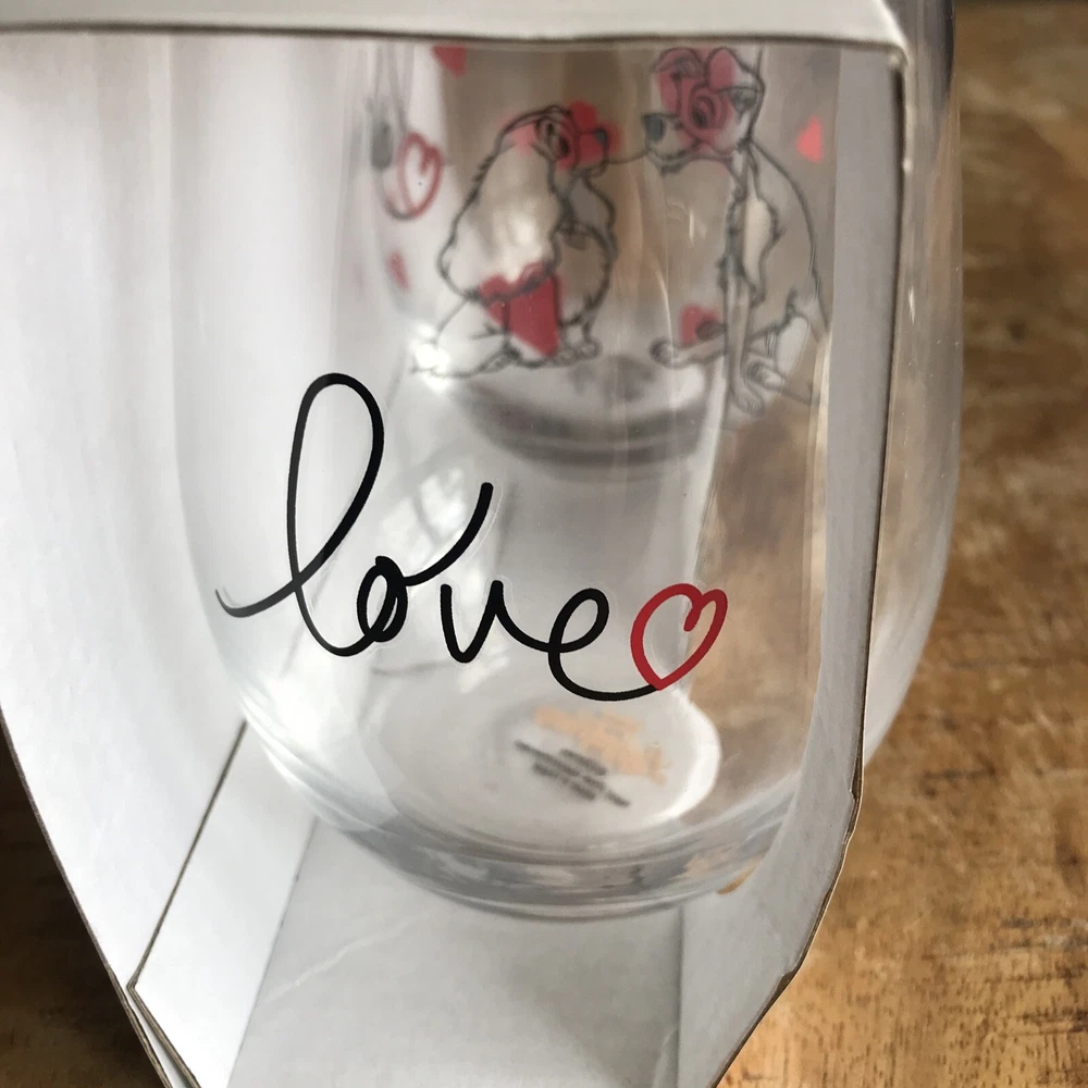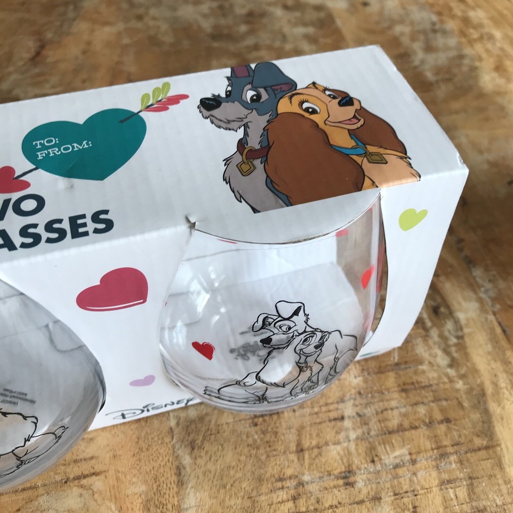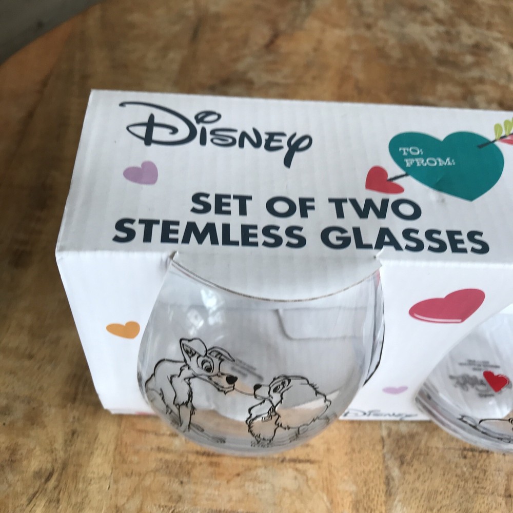 Celebrate Valentine's Day with a touch of Disney magic. This set of two stemless wine glasses features the iconic duo from "Lady and the Tramp," perfect for sharing a romantic toast. Crafted from durable glass and decorated with a charming hearts pattern, these 500 ml glasses are a delightful addition to any table setting. The glasses come complete with a presentation box, making them an ideal gift for Disney fans and collectors alike. Designed with a clear color that showcases the decorations beautifully, this unbranded set is made in China and is sure to be a memorable part of your special occasions.