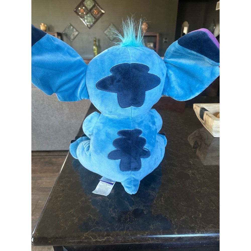 Disney Lilo & Stitch plush toy features the iconic blue extraterrestrial Experiment 626 in a seated pose. Soft polyester construction with vibrant purple ear accents and dark blue back markings makes it a perfect companion for fans of the animated series. This cuddly stuffed animal includes original tags and a tuft of teal hair on top for added personality.