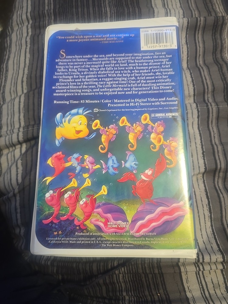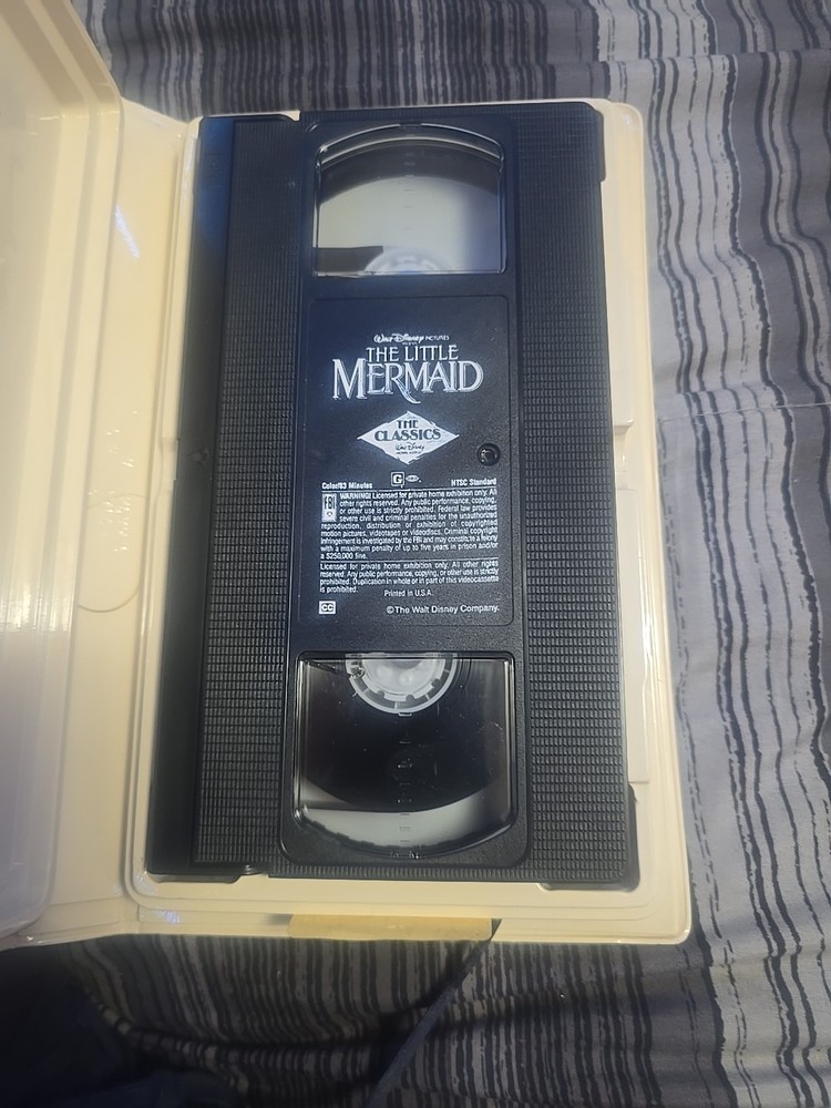 This is a black diamond edition VHS tape of Disney's "The Little Mermaid" from 1989. The cover art is considered banned, featuring the artwork that caused controversy upon the movie's original release. Directed by John Musker and Ron Clements, the film is an animated classic in the genre of animation & anime, with René Auberjonois in a leading role. The VHS tape is in NTSC signal standard and is rated G.