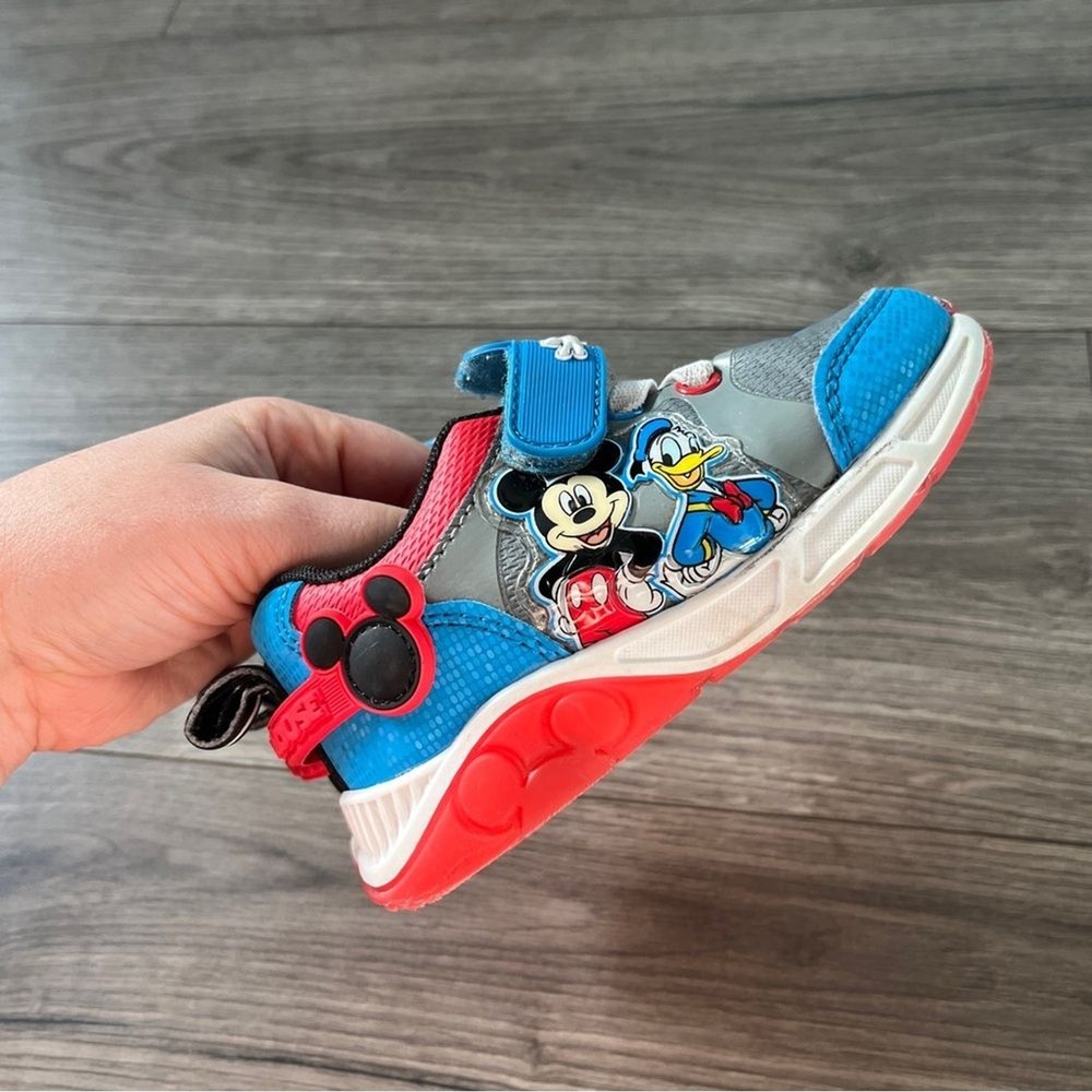 Disney Mickey Mouse Donald Duck Kids Shoes Red Blue Black Size 7 Light Up These Disney Mickey Mouse kids shoes feature a fun and colorful design with red, blue, and black accents. Perfect for little fans of Mickey, these shoes offer comfort and style for everyday adventures. See pics for general wear. In good preowned condition