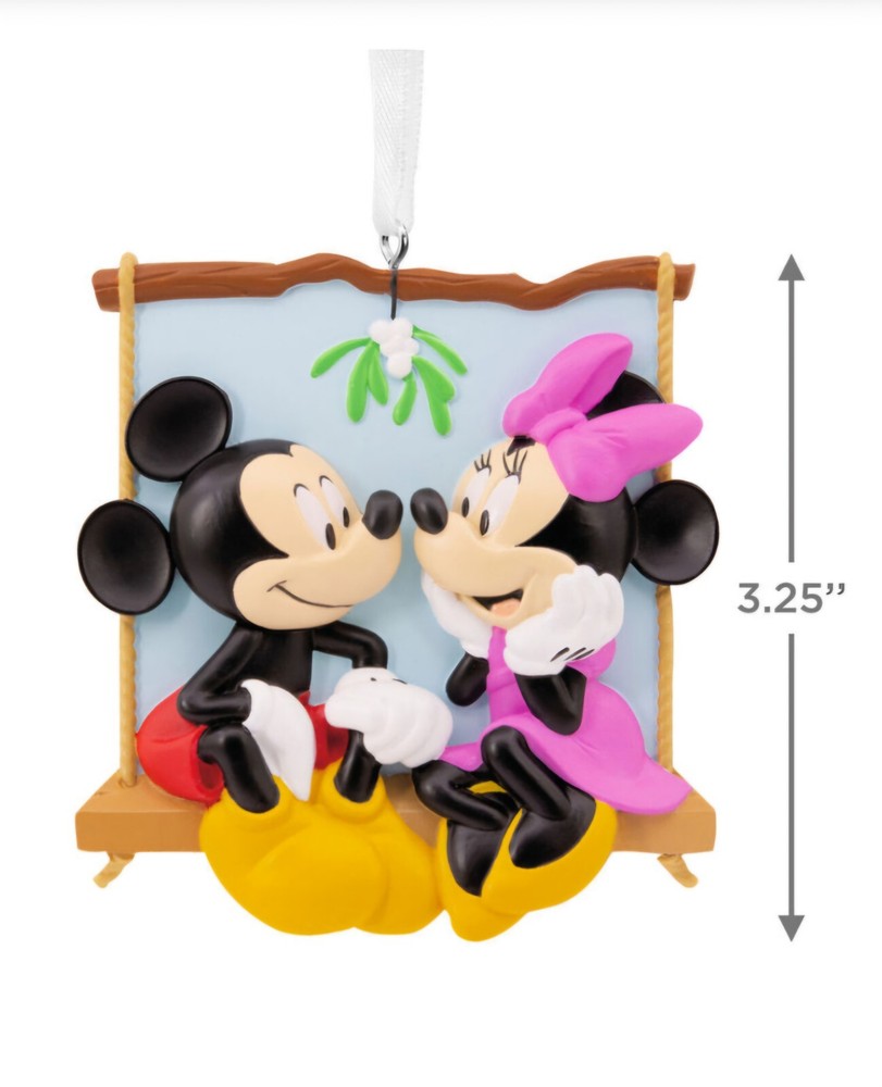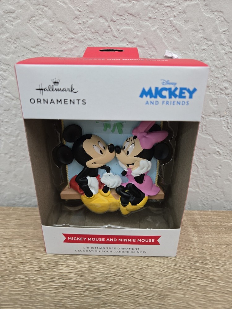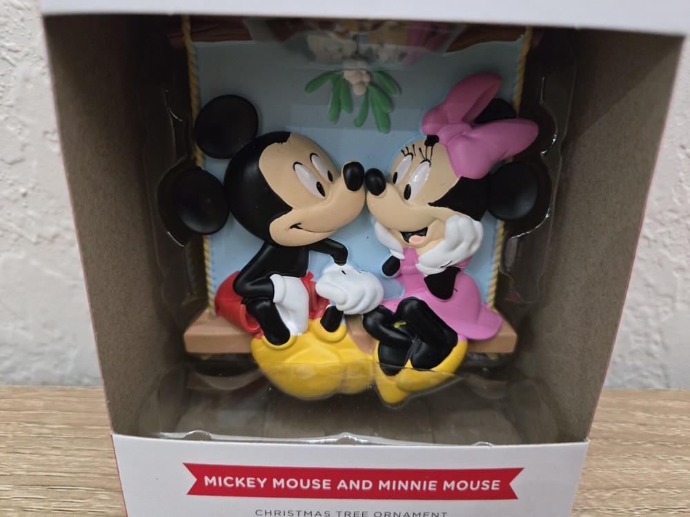 *Free shipping with USPS Ground Advantage. Ships ASAP. Packaged with care. Smoke-free home.* Hallmark Disney ornament featuring Mickey Mouse and Minnie Mouse on a swing under mistletoe, showcasing love. The small multicolor ornament is part of the 2024 collection and comes in an unopened box. It is a festive Christmas decoration with a Disney theme, perfect for hanging on a tree. The ornament is officially licensed by Disney and manufactured by Hallmark.