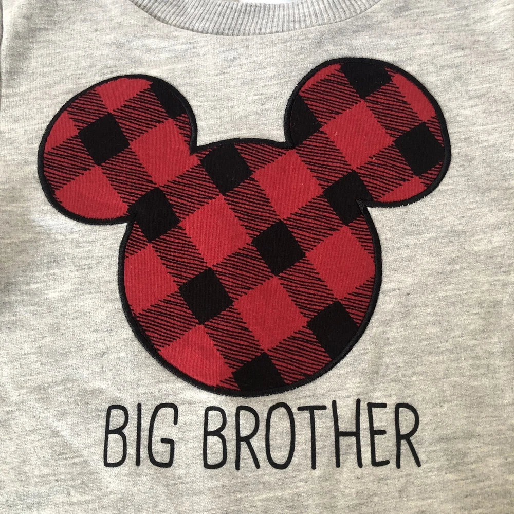 Disney boy's / youth BIG BROTHER soft, gray long sleeve sweatshirt ~ size 4 * NEW w / tag, fleece lined. red & black plaid Mickey. Fabric is not too light, not too heavy. Machine wash