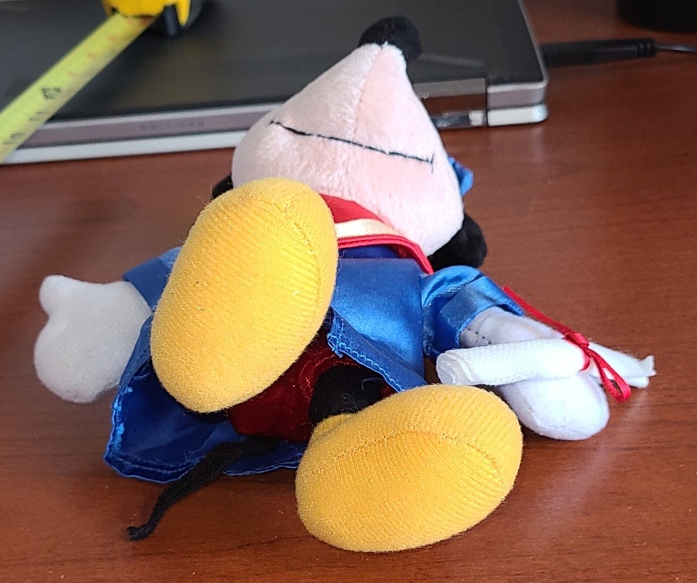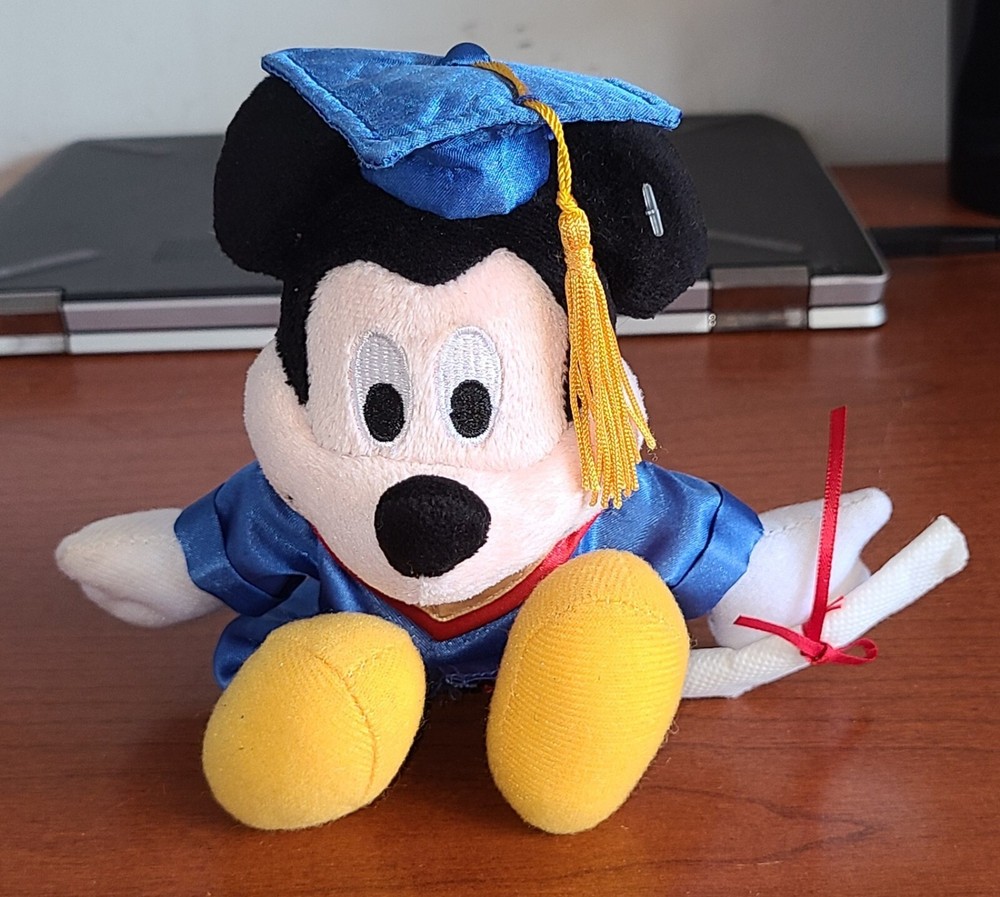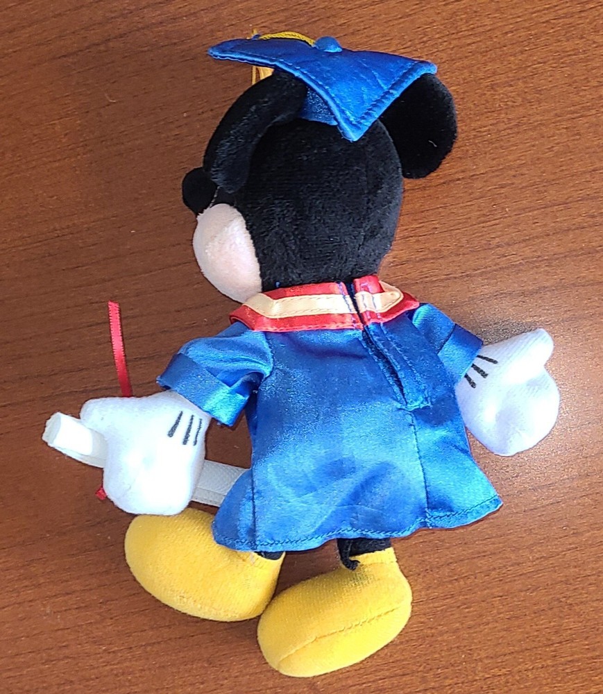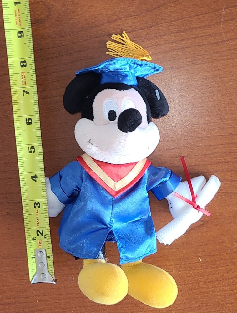 Celebrate Mickey Mouse's graduation with this adorable plush cap and gown set! The 8" cap features the iconic Disney character in his classic pose, while the gown is made of soft and cozy material. Perfect for collectors and fans of all ages, this set is a must-have for any Disneyana collection. The brand is Disney and the character/story/theme is Mickey Mouse.