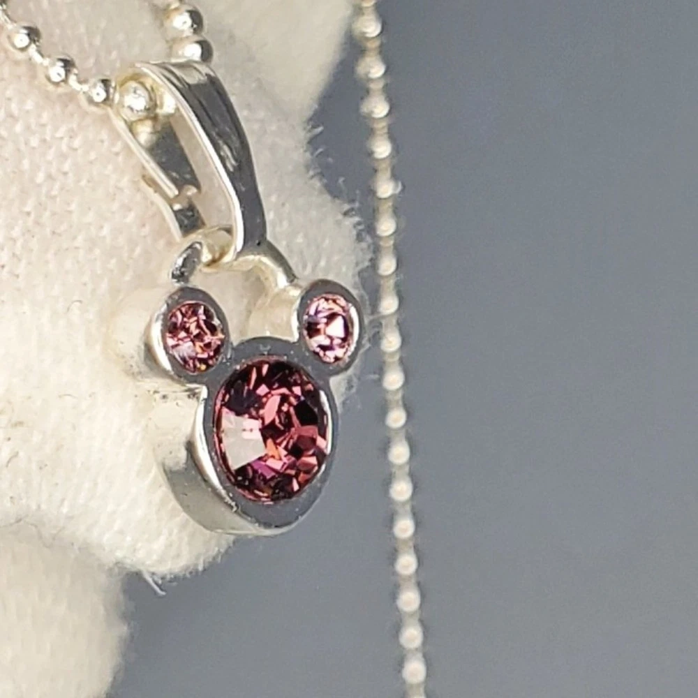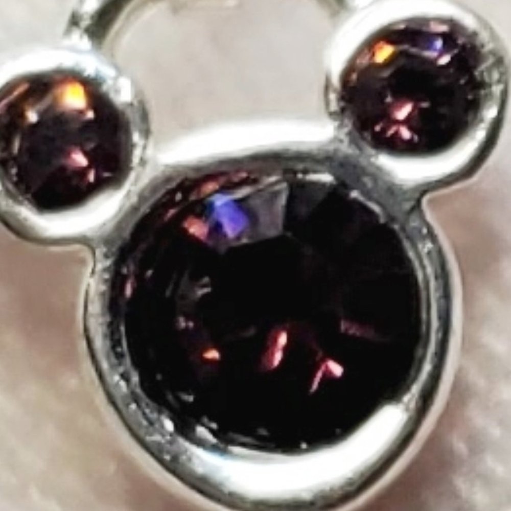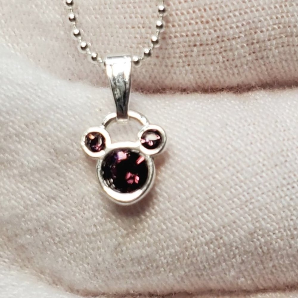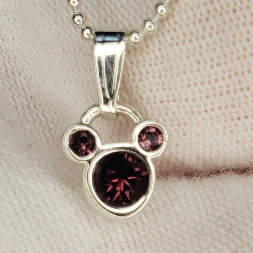 Embrace the magic of your birth month with our Disney Mickey Mouse July Birthstone Necklace. This exquisite piece features a stunning purply maroon birthstone gem encased in a silver-toned pendant, showcasing the iconic Mickey Mouse. Delicate rhinestones set within the silver-toned metal add a touch of elegance and sparkle, making this necklace a perfect gift for anyone born in July. It comes with a stylish silver-toned ball chain that beautifully complements the pendant. The adjustable chain ensures a comfortable and personalized fit for every wearer. With the Disney stamp on the back, this necklace guarantees authenticity as a genuine Disney collectible, reflecting the highest standards of quality and craftsmanship. Celebrate your birth month in style and let the iconic Mickey Mouse add a touch of silver-toned splendor to your jewelry collection. Size: Measurements photographed are in Millimeters Condition: Well worn Have a magical day Pet-free, smoke-free home.