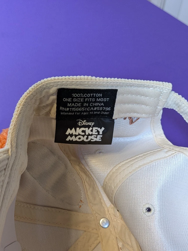 Item Specifics Condition: New with tags (NWT) Brand: Disney / Bioworld Style: Dad Hat / Baseball Cap Theme: Fall / Halloween / Pumpkin Spice Material: 100% Cotton Corduroy Color: Cream / Tan / Orange Size: Adjustable (One size fits most) Description New With Tags! Authentic Disney x Hot Topic Mickey Mouse Pumpkin Spice Dad Cap Celebrate the cozy vibes of fall with this adorable Mickey Mouse corduroy hat! This is the perfect accessory for Disney Parks trips, pumpkin patch outings, or just enjoying your favorite PSL. Key Features: Premium Material: Soft, cream-colored cotton corduroy body that feels great and looks perfect for autumn. Iconic Details: Features a centered Mickey Mouse Pumpkin Spice Latte (PSL) embroidered patch. 3D Elements: Topped with two fuzzy, plush 3D Mickey ears designed to look like mini pumpkins. Back Embroidery: Beautifully detailed embroidered autumn leaves and an acorn on the back for an extra touch of seasonal charm. Adjustable Fit: Includes a metal slider buckle at the back to ensure a comfortable, custom fit for most adults. Condition: Brand new with original Hot Topic tags still attached. Ships in a box to ensure the 3D ears arrive in perfect shape!