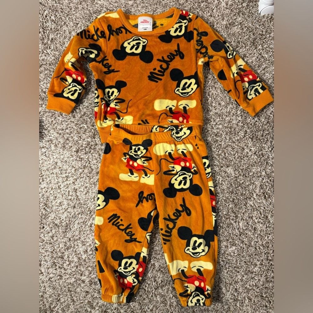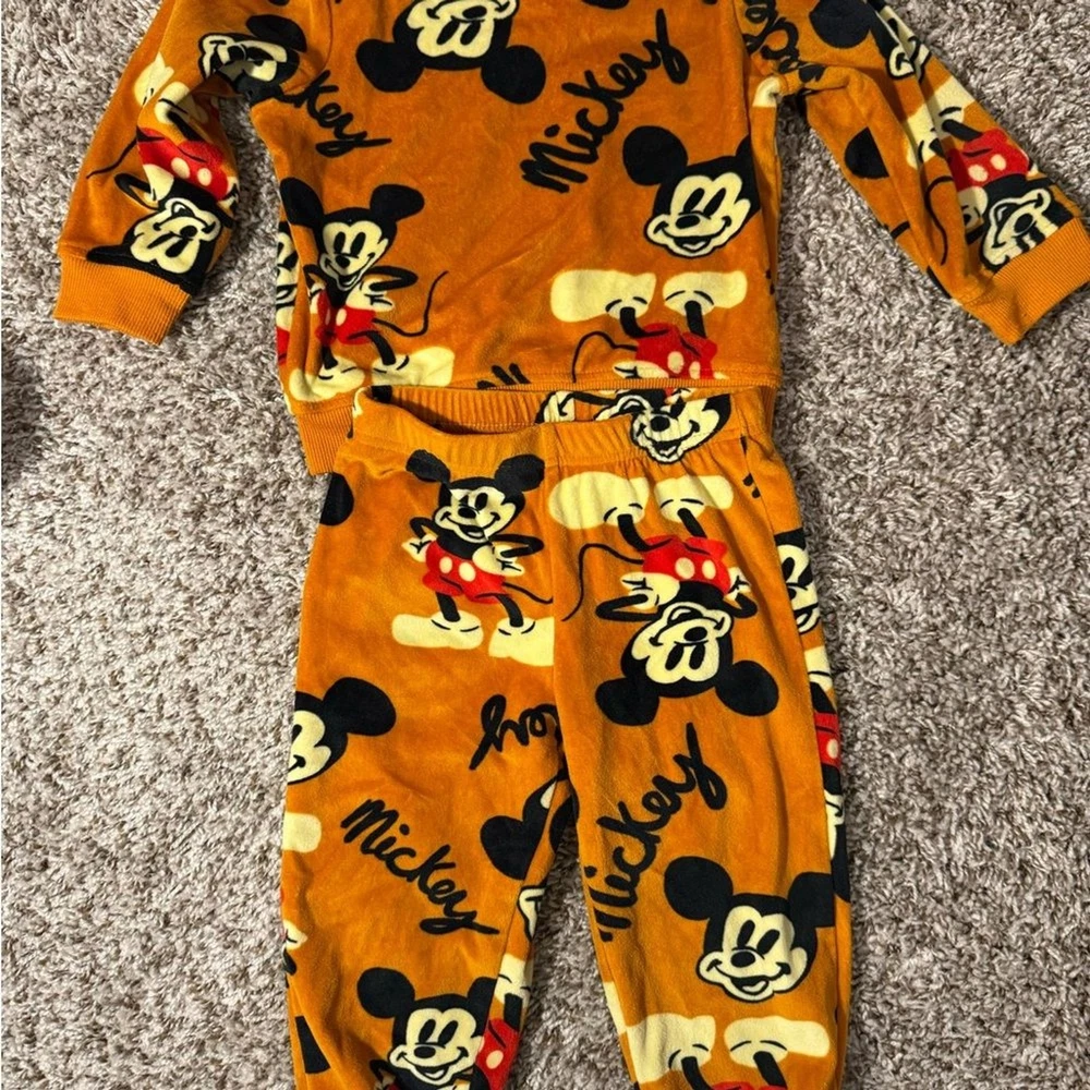 Disney Mickey Mouse fleece outfit set in size 18M. Includes a fleece long-sleeve top and matching pants with bold Mickey graphics. Cozy, cute, and ideal for cooler weather. Gently worn and in great condition. Ships fast — usually within 24 hours.