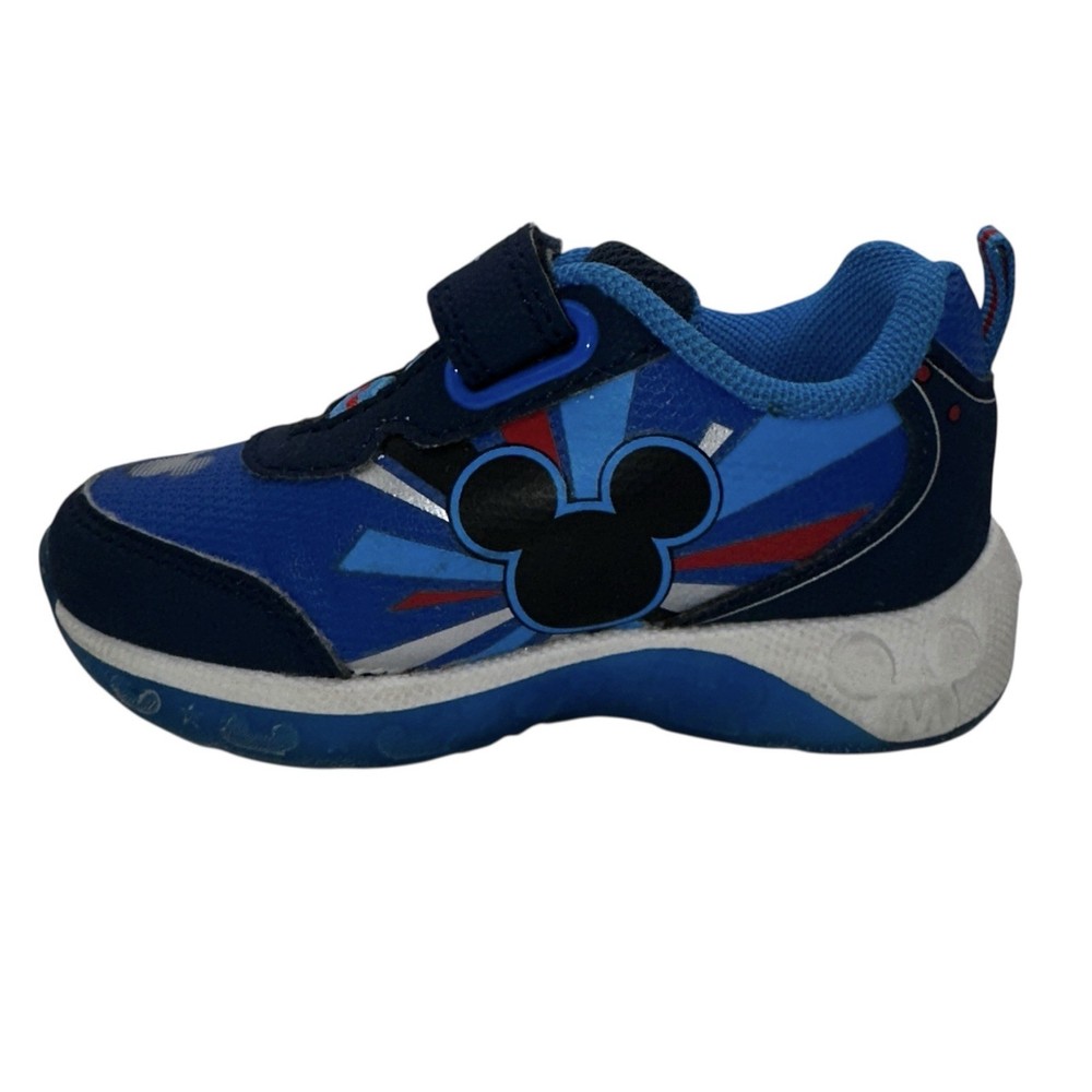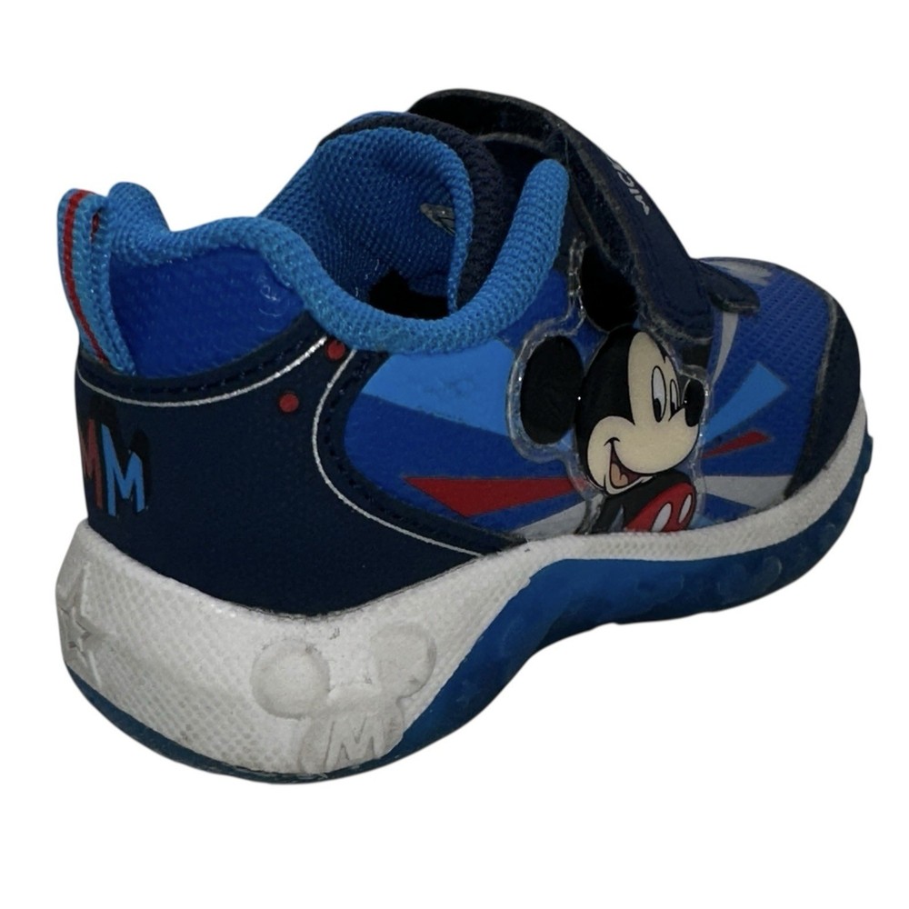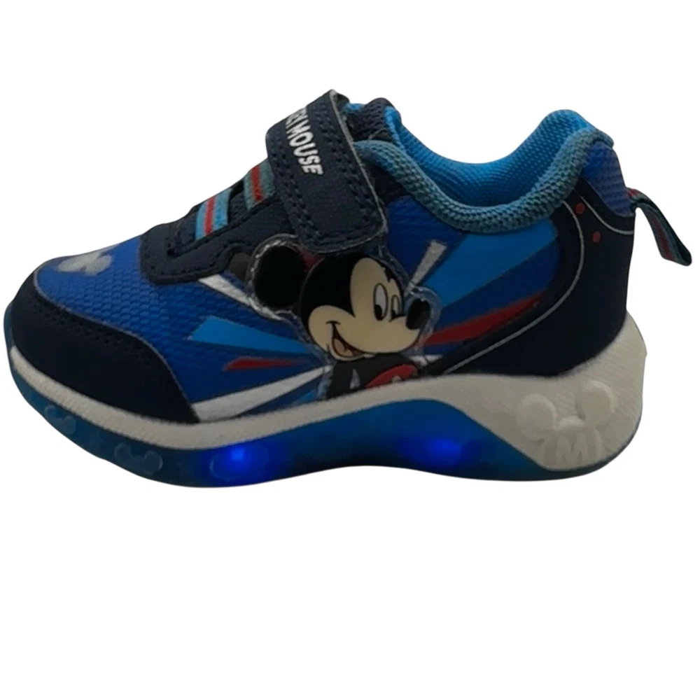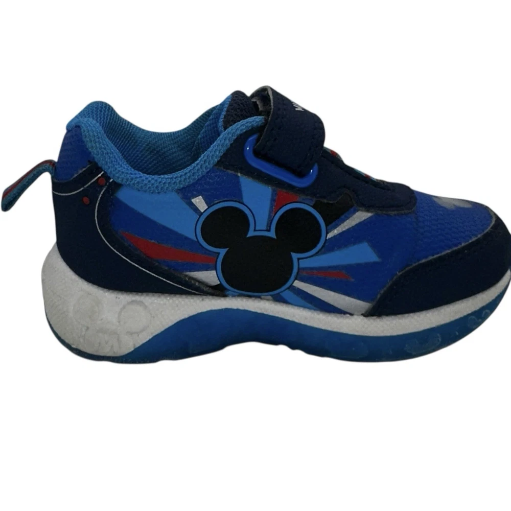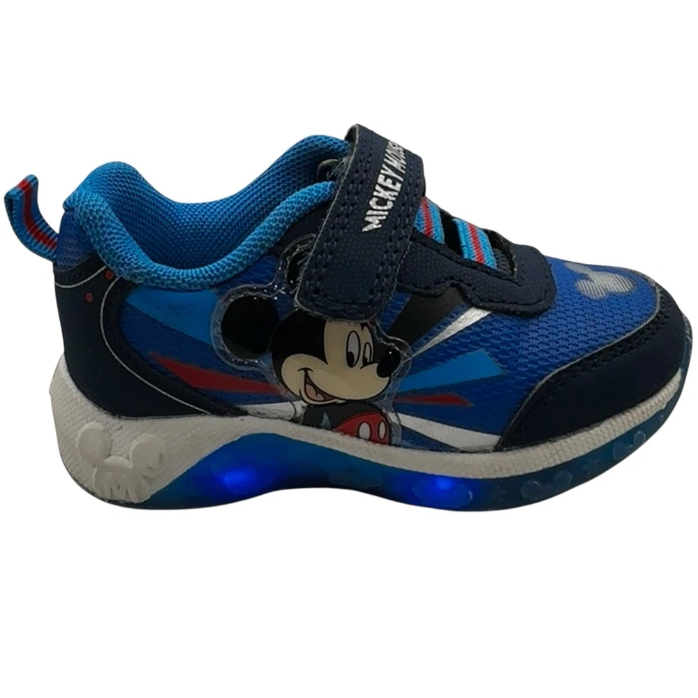 These Disney Mickey Mouse toddler sneakers in size 6 are a stylish and fun choice for young boys. The shoes feature a blue color with a Mickey Mouse character design, making them perfect for fans of the beloved Disney character. The light-up feature adds an extra element of whimsy, while the hook & loop closure ensures a secure fit. These athletic sneakers are sure to make any toddler feel like a superstar with their cool design and functional lights.