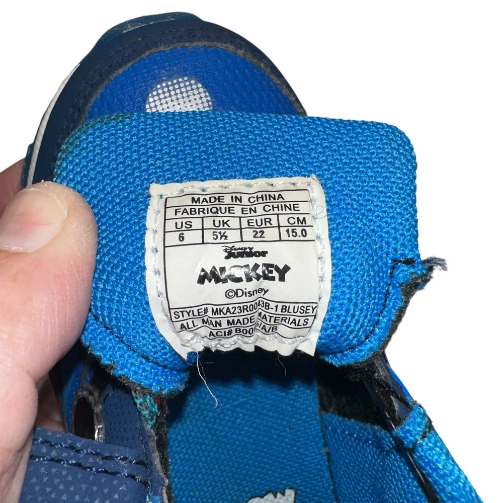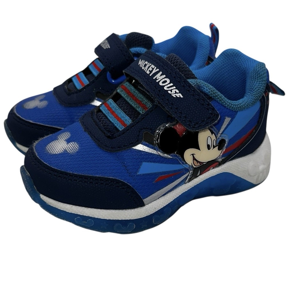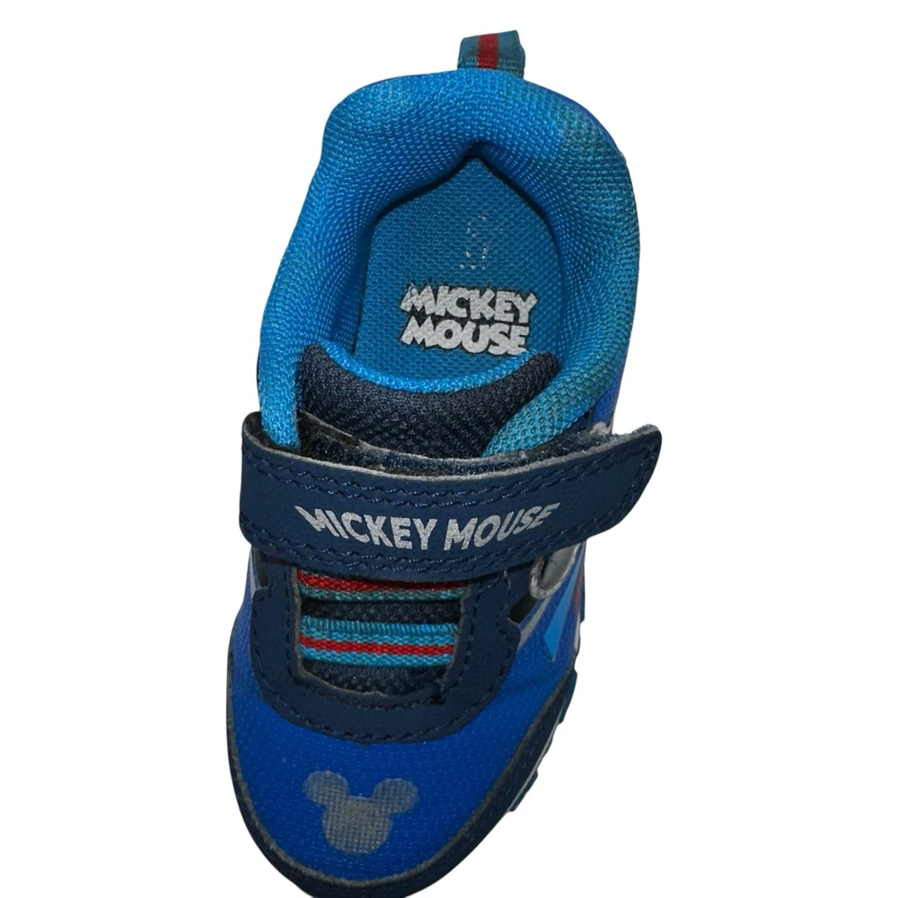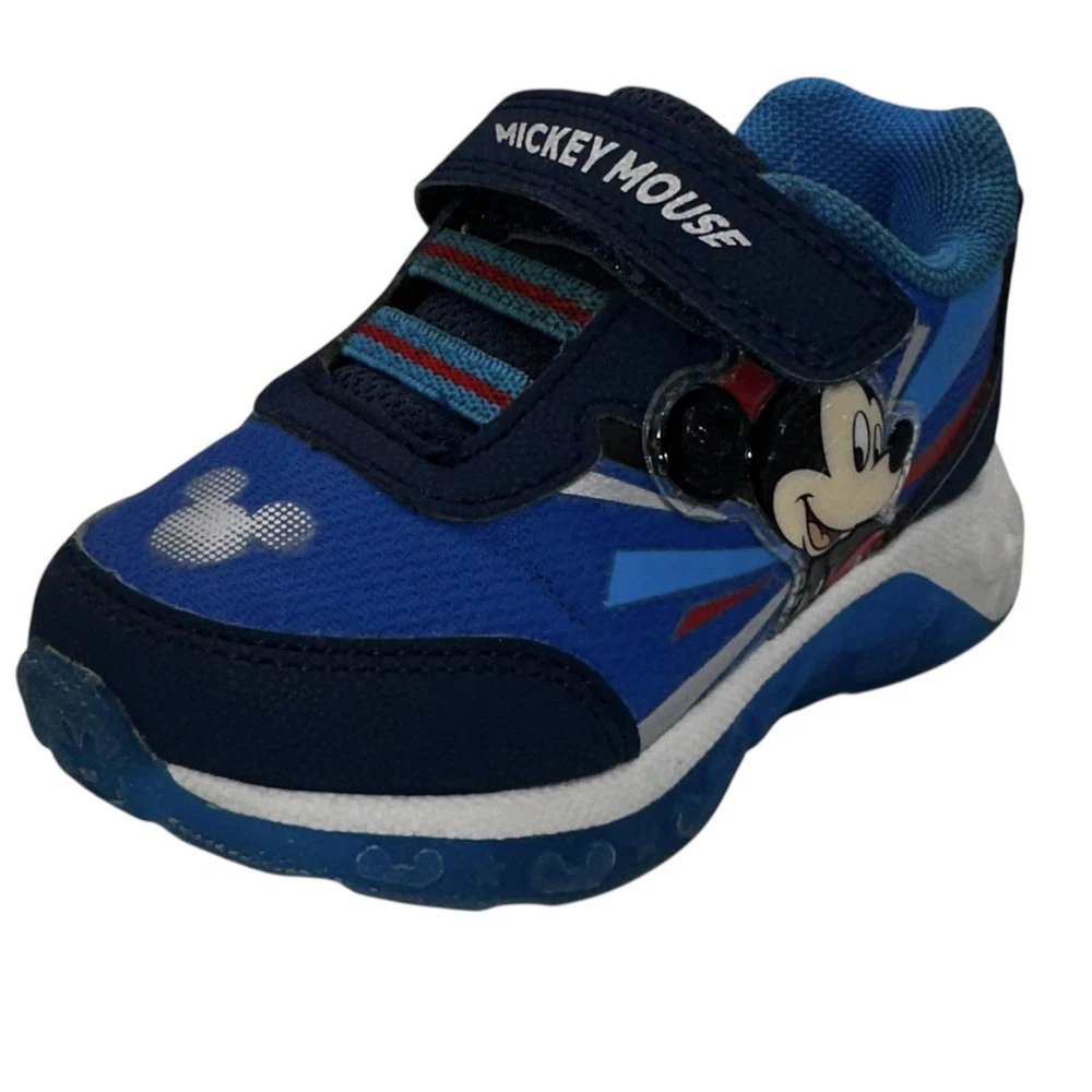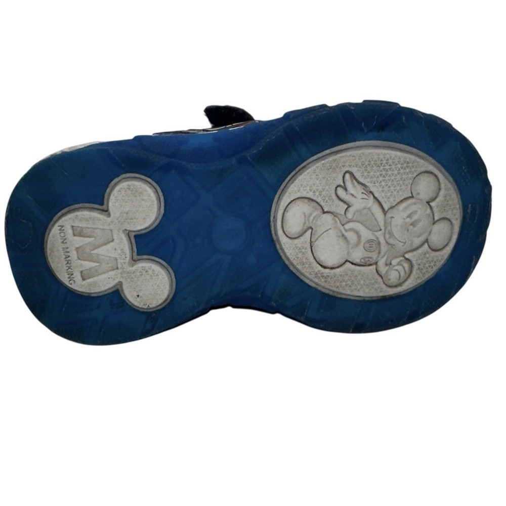These Disney Mickey Mouse toddler sneakers in size 6 are a stylish and fun choice for young boys. The shoes feature a blue color with a Mickey Mouse character design, making them perfect for fans of the beloved Disney character. The light-up feature adds an extra element of whimsy, while the hook & loop closure ensures a secure fit. These athletic sneakers are sure to make any toddler feel like a superstar with their cool design and functional lights.