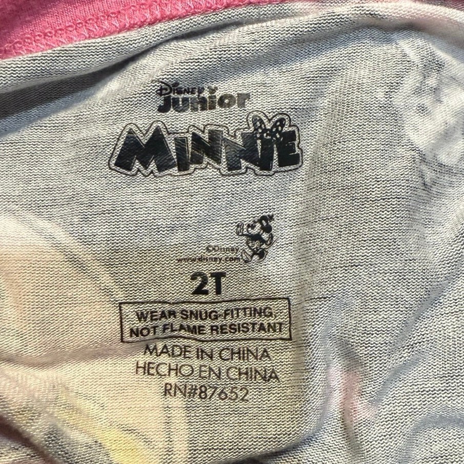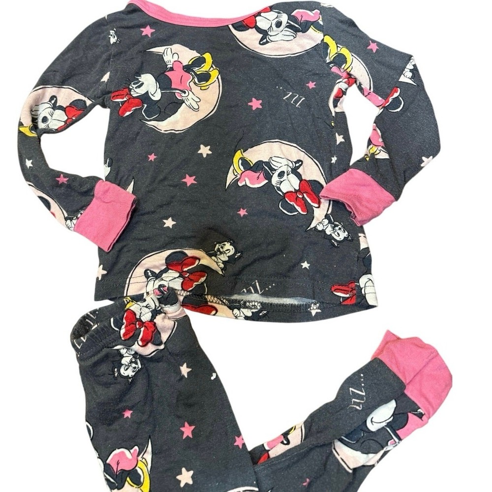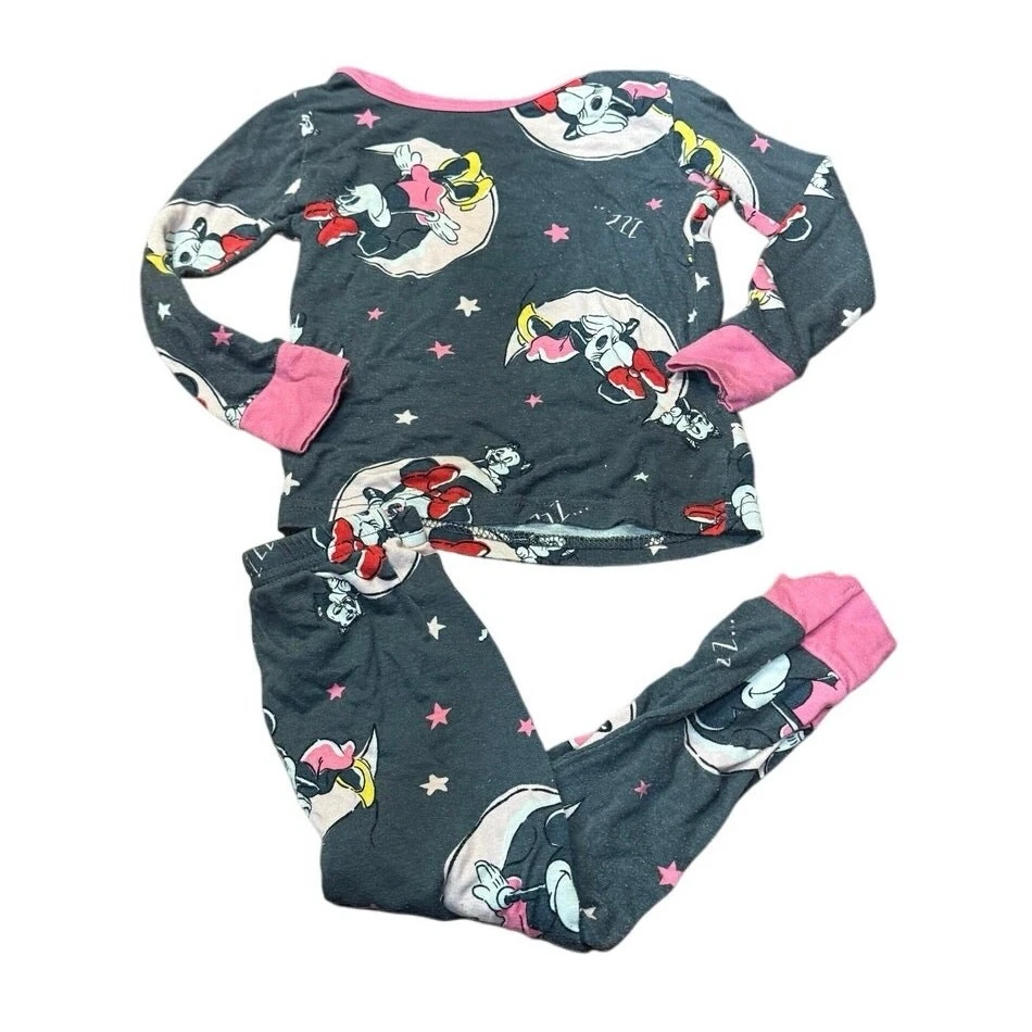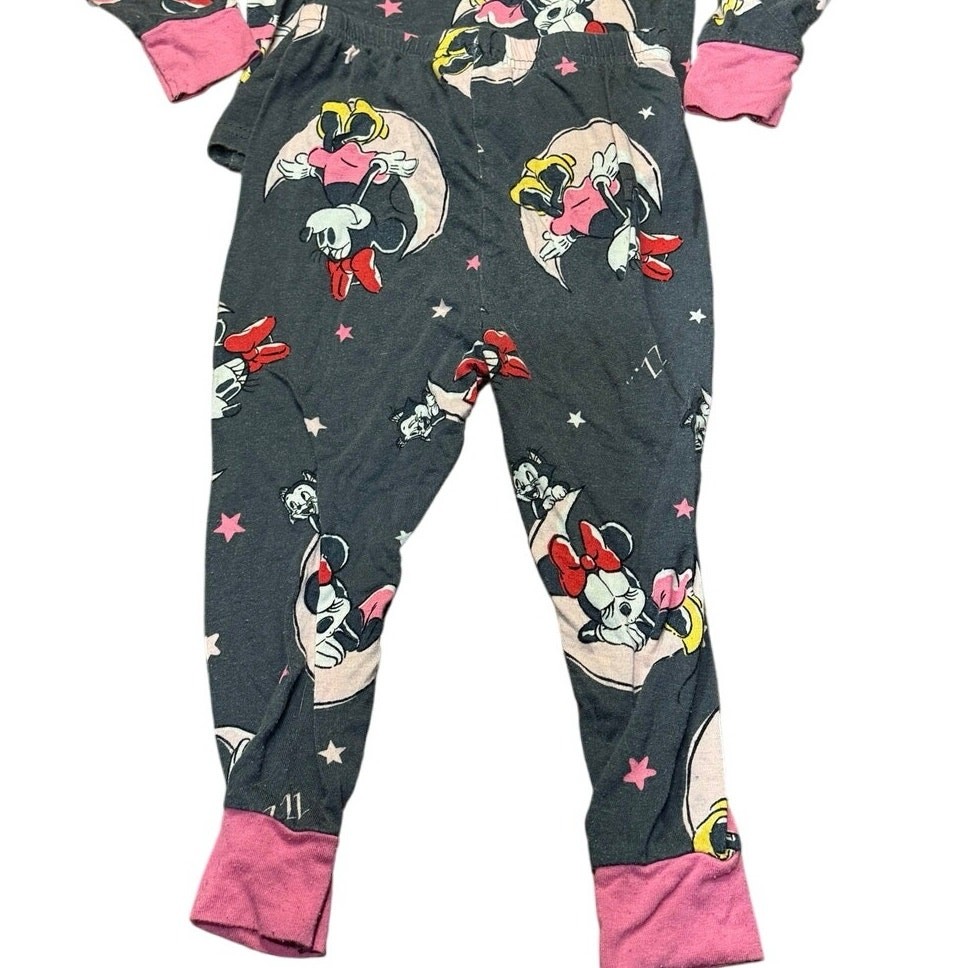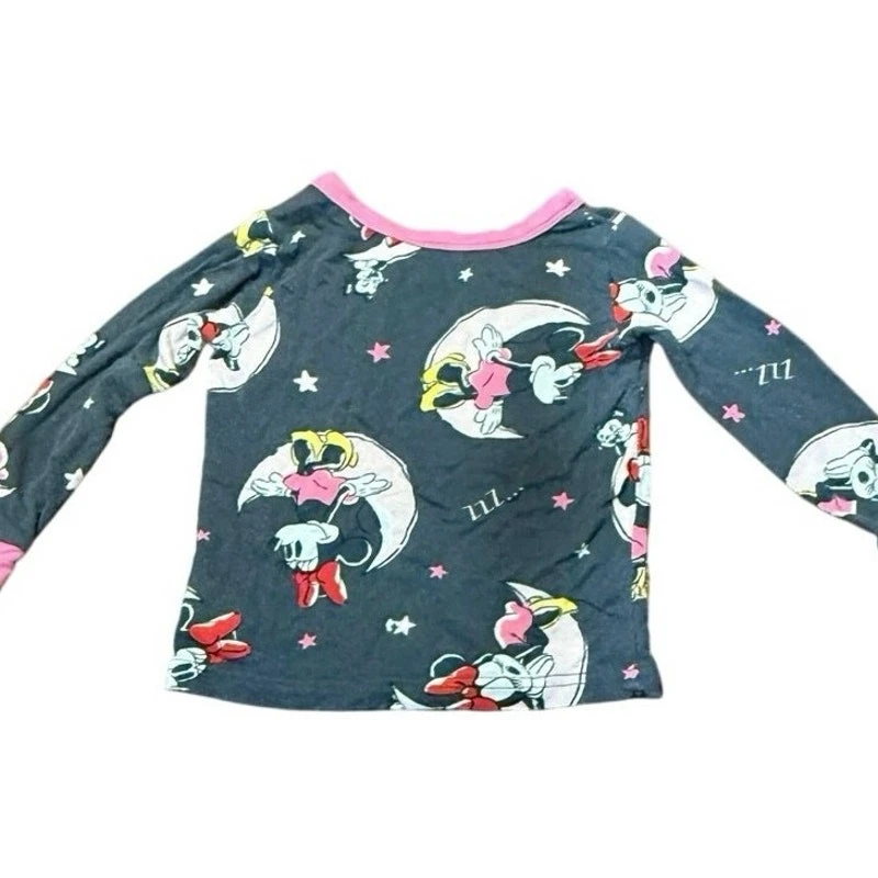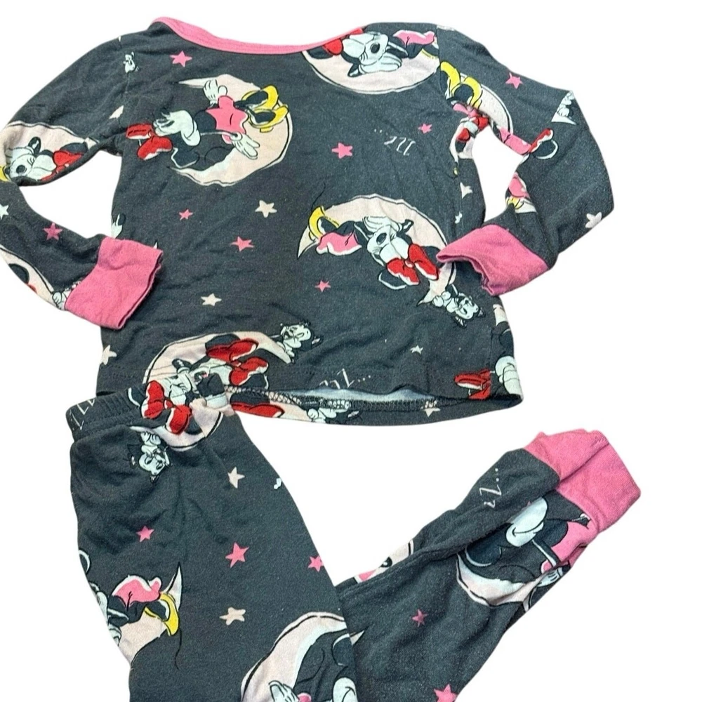 Pre Loved toddler pajama set. Item shows signs of wear and pilling, especially common with viscose material. No holes or stains noted. Please see photos for details—this set was worn by a toddler and reflects normal wear Adorable Disney Minnie Mouse 2-piece pajama set for toddlers, size 2T. Features an allover Minnie print in pink, yellow, and white on a dark gray background. Includes a long sleeve top and matching pants with pink cuffs and trim. Made from soft, breathable 100% viscose for cozy comfort. Pullover style top with crewneck and elastic waistband pants. Machine washable. This set shows pilling from wash/wear but has no holes or stains. Perfect for play, snuggles, or a Disney-themed bedtime! I do my absolute best to capture every little detail, but I’m only human (and a pretty busy mom!). Please review photos and ask questions—no returns, just love!