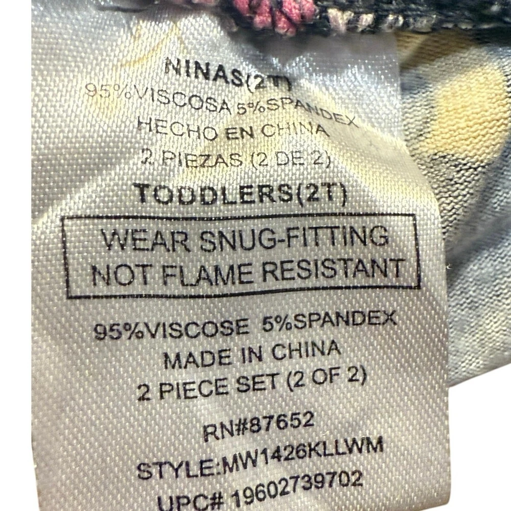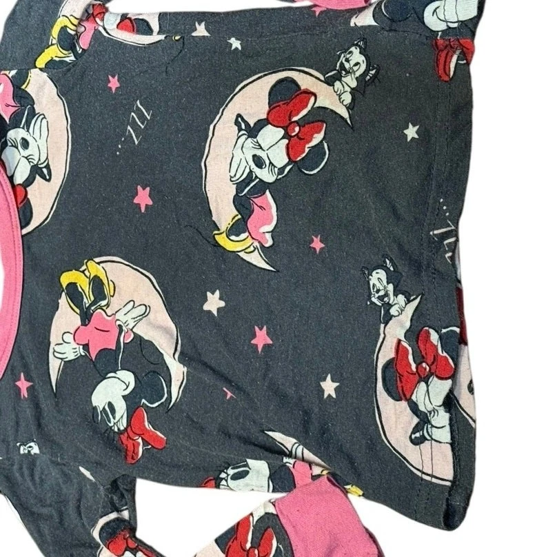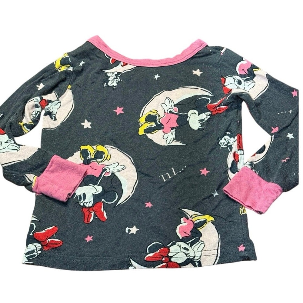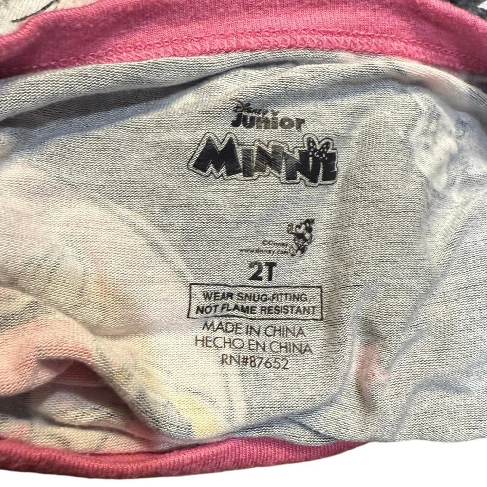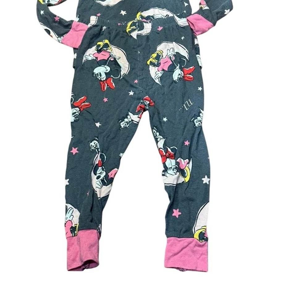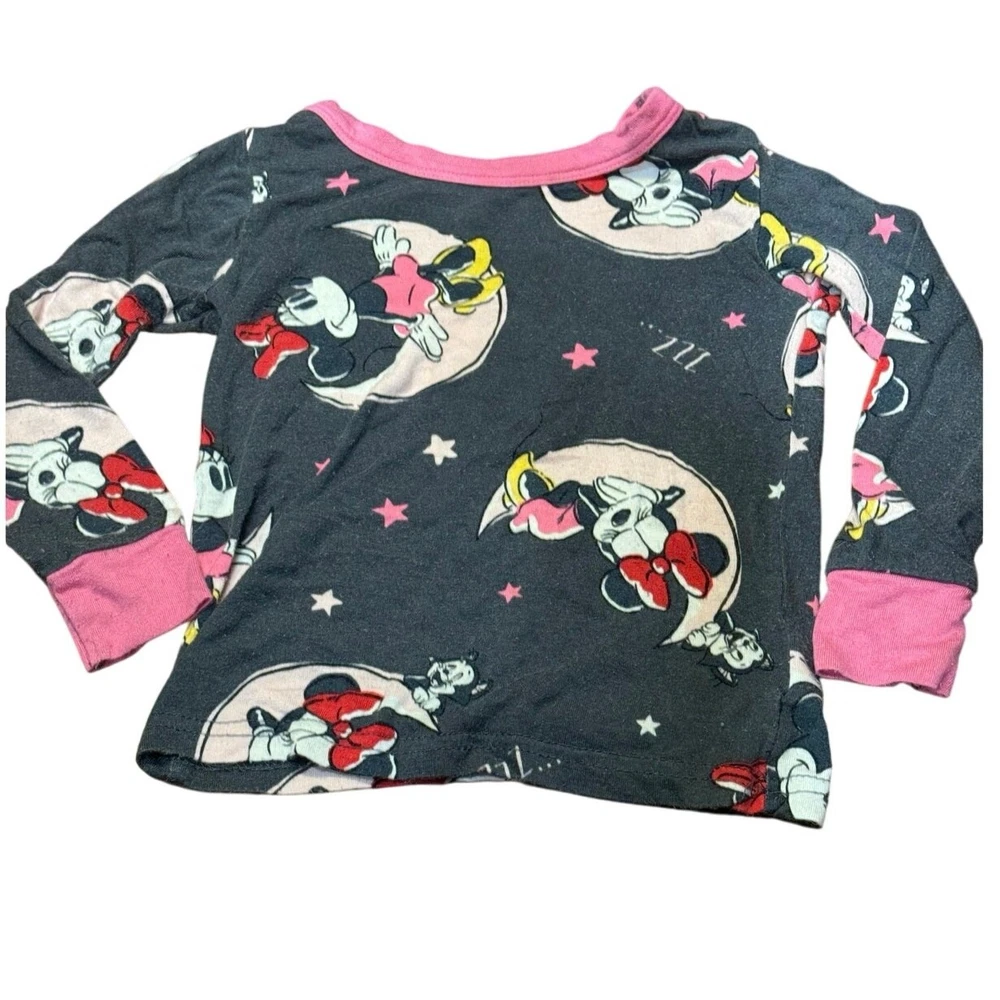 Pre Loved toddler pajama set. Item shows signs of wear and pilling, especially common with viscose material. No holes or stains noted. Please see photos for details—this set was worn by a toddler and reflects normal wear Adorable Disney Minnie Mouse 2-piece pajama set for toddlers, size 2T. Features an allover Minnie print in pink, yellow, and white on a dark gray background. Includes a long sleeve top and matching pants with pink cuffs and trim. Made from soft, breathable 100% viscose for cozy comfort. Pullover style top with crewneck and elastic waistband pants. Machine washable. This set shows pilling from wash/wear but has no holes or stains. Perfect for play, snuggles, or a Disney-themed bedtime! I do my absolute best to capture every little detail, but I’m only human (and a pretty busy mom!). Please review photos and ask questions—no returns, just love!