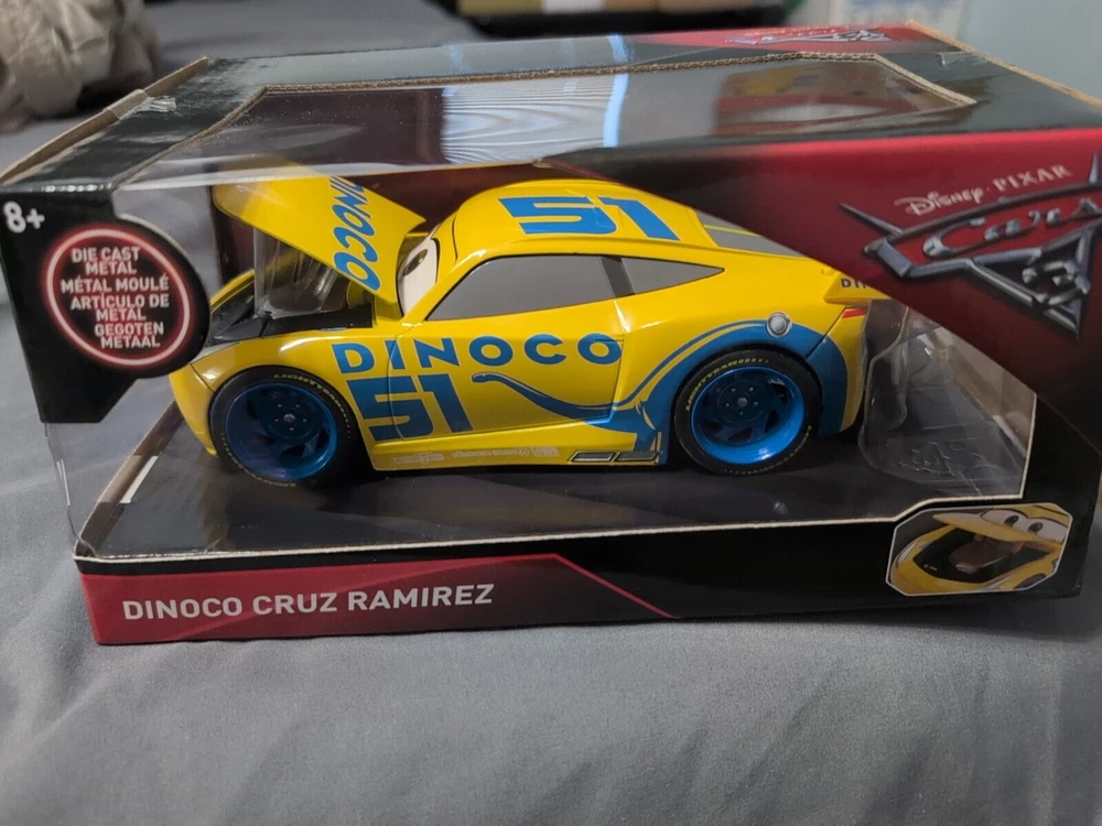 The Disney PIXAR Cars 3 Dinoco Cruz Ramirez by Jada Toys is a 1:24 scale diecast car model from 2017. This toy vehicle features Cruz Ramirez from the Cars 3 movie, making it a great collectible for both boys and girls who enjoy Disney Pixar Cars. Made in China, this product is part of the Character Family Disney Pixar Cars.