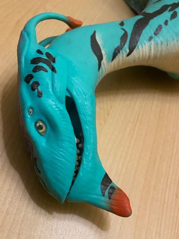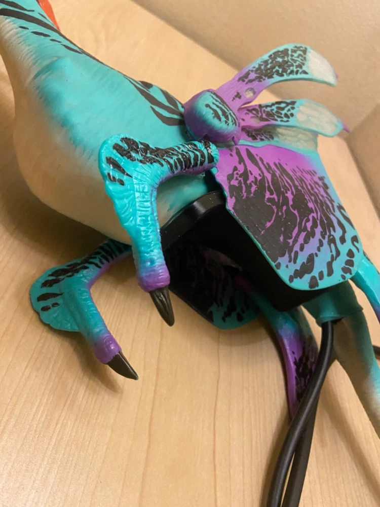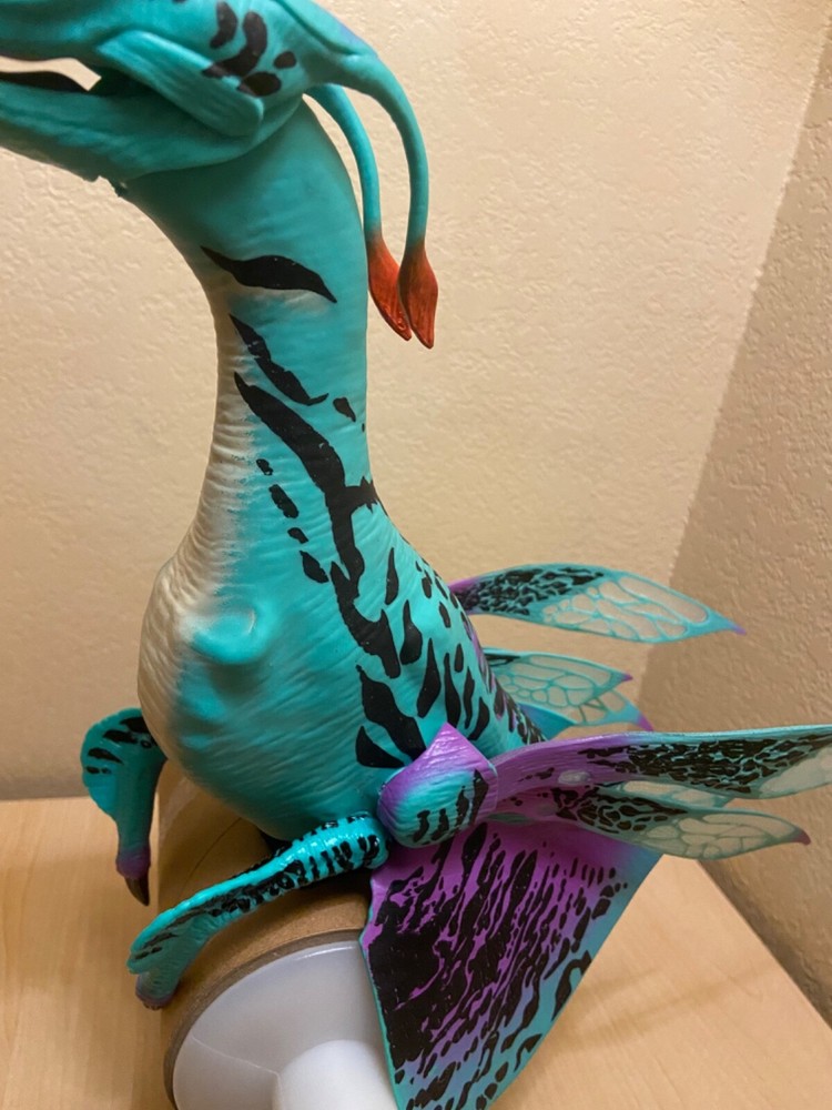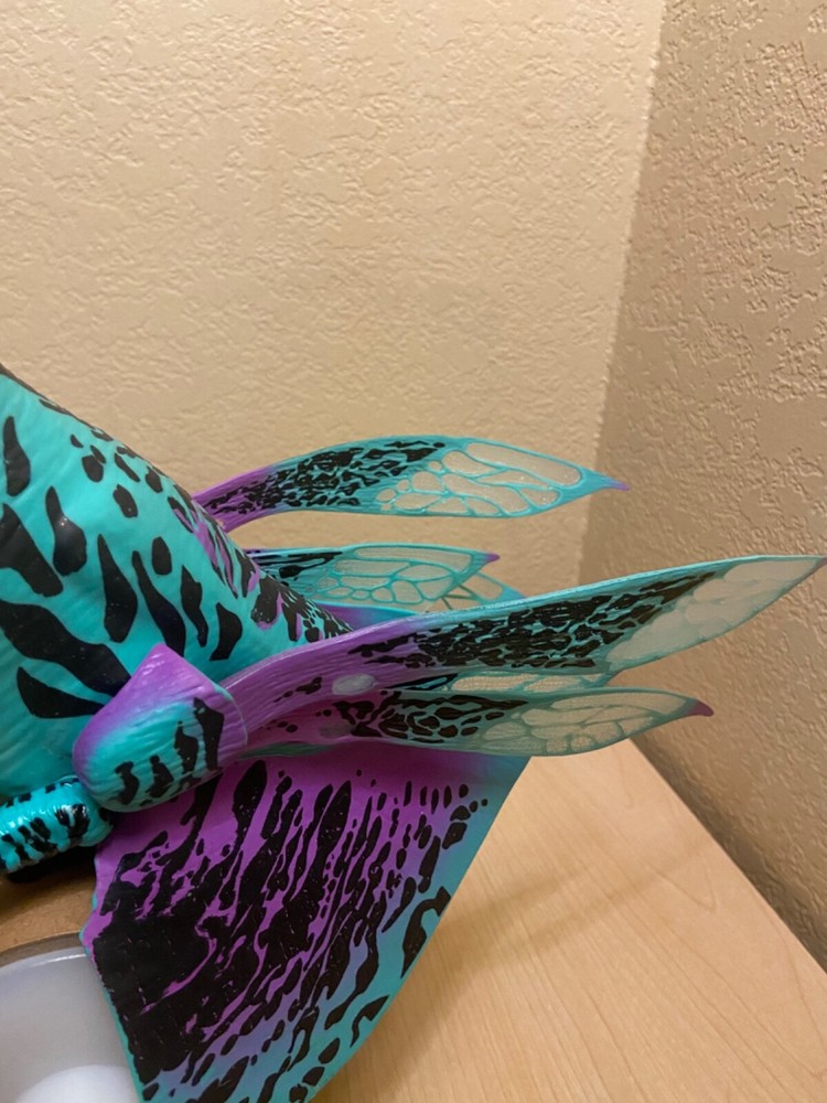 TAKES TWO AAA (Triple A) Batteries. SEE PHOTO FOR LOCATION of ON & Off Switch which you must remove or move or slide magnet & is located above belly & is a little hidden under silicone skin: Again see photo for location. SEE VIDEO Disney Pandora Avatar ACE Banshee Rookery Dragon…Blue, Turquoise, Black, Purple, orange with yellow eyes, Interactive Puppet with Magnet Excellent Used Condition!! WORKS GREAT!! SEE VIDEO Buyer pays estimated calculated shipping & handling