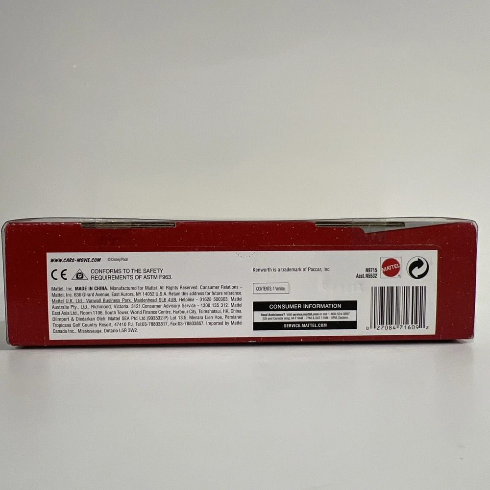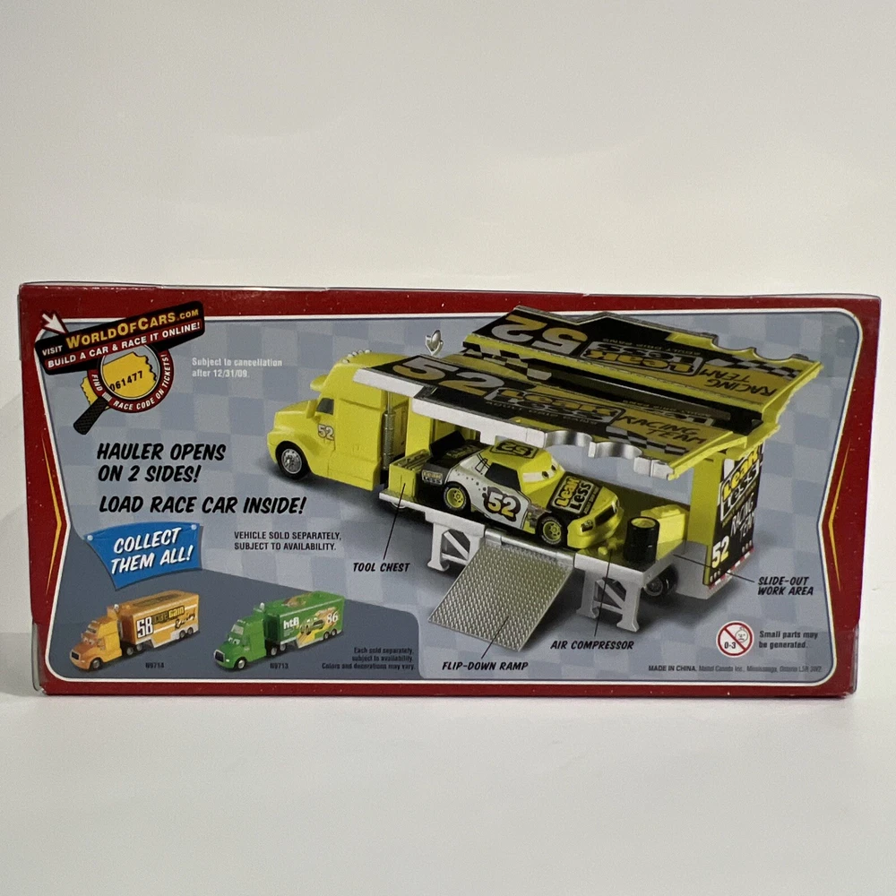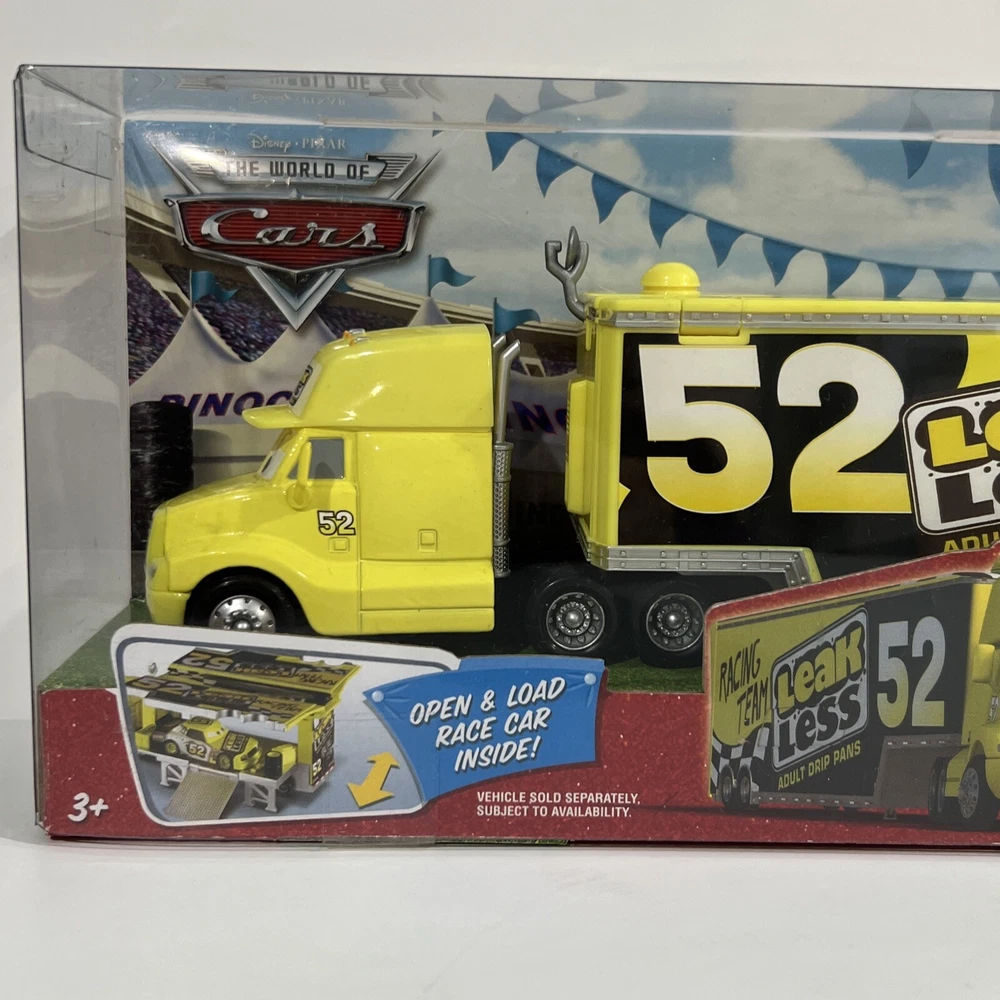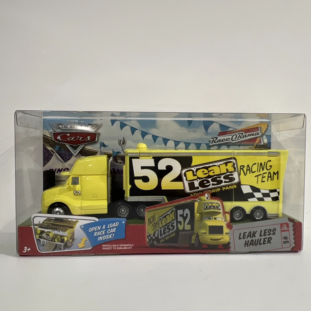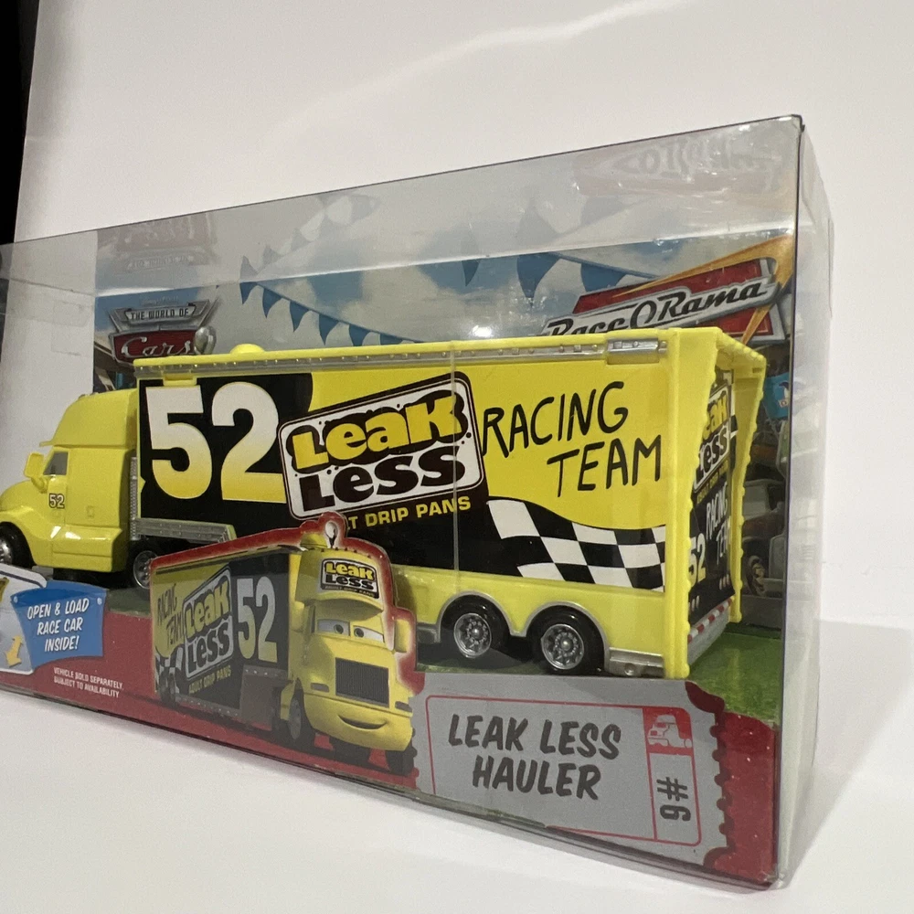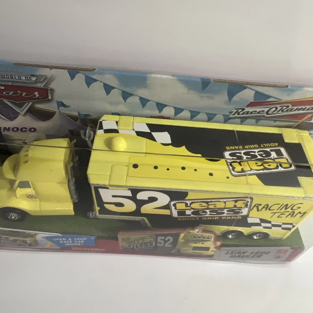 This Disney Pixar Cars Hauler “LEAK LESS”, from the original Cars Movie, is part of THE WORLD OF CARS RACE O RAMA Series. It features #52 LEAK LESS, the semi truck/hauler, which is part of the Leak Less Race Team. This 1:55 scale vehicle was manufactured by Mattel in 2010. It is an authentic Mattel reproduction in its original packaging, and not one of the foreign-made knockoffs. This item is in excellent condition. It comes in its original packaging and has not been opened. It has been carefully stored in a dry, smoke-free, pet free environment. See pictures for details. I will combine shipping for multiple purchases.