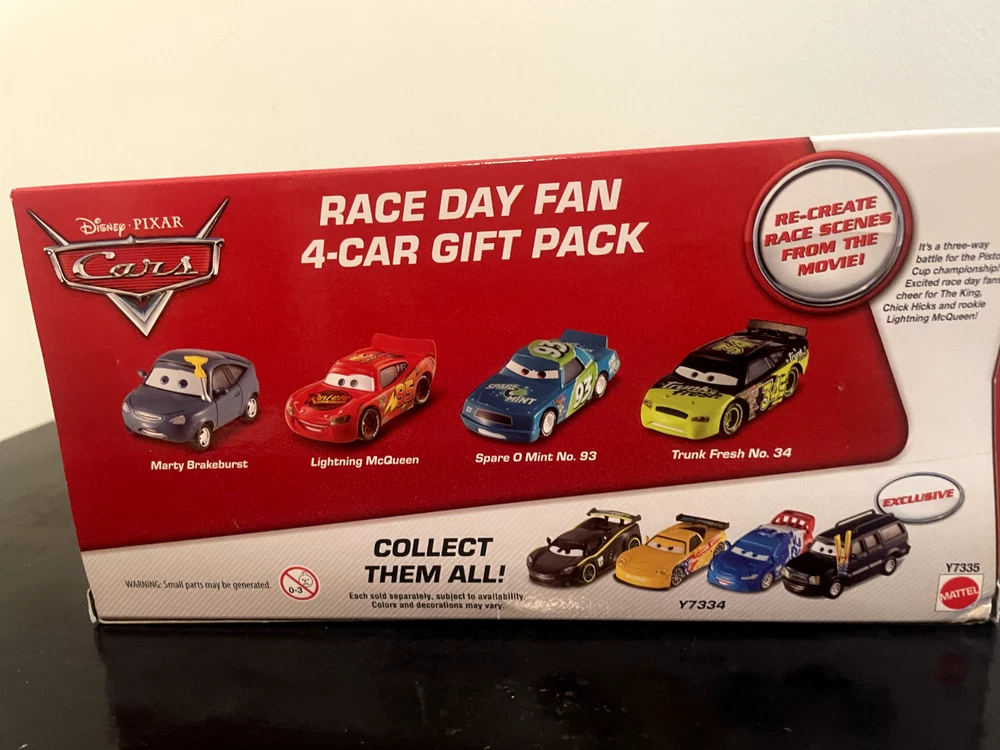 Disney Pixar Cars Race Day Fan 4-Car Die Cast Set with Marty Brakehurst, Lightning McQueen, Spare O Mint #93 and Trunk Fresh #34. NIB Excellent Condition. Packaged with Care.