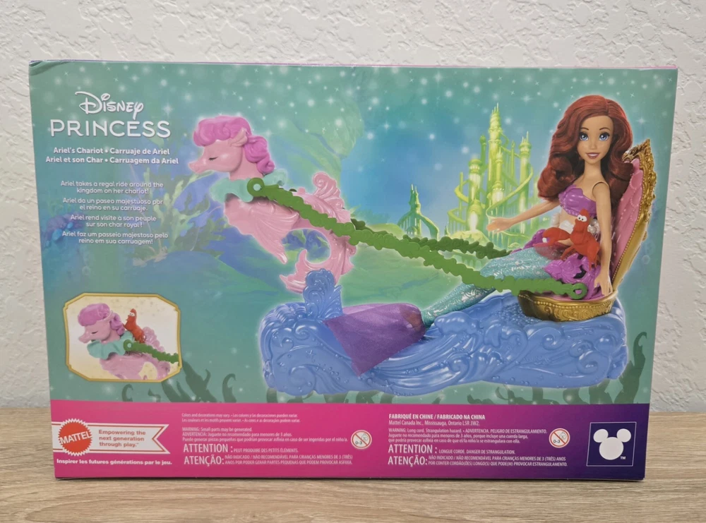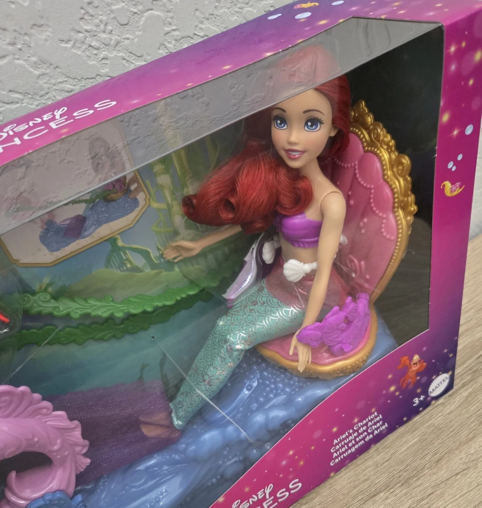 *Free shipping with USPS Ground Advantage. Ships ASAP. Packaged with care. Smoke-free home.* Please note minor imperfections on box as shown in the attached pictures. The playset is not damaged. This Disney Princess Ariel's Chariot playset comes with an Ariel doll and Sebastian character, perfect for all occasions. The doll has wavy red hair, blue eyes, and light complexion. The set includes removable clothes, a back and forth chariot movement, and is packaged in its original unopened box. The playset is part of the Disney Series and is manufactured in China with plastic materials. It is recommended for ages 3+ and is a great addition to any Disney or Little Mermaid collection. This doll playset is perfect for imaginative play and creates a magical underwater world for Ariel and her friends.
