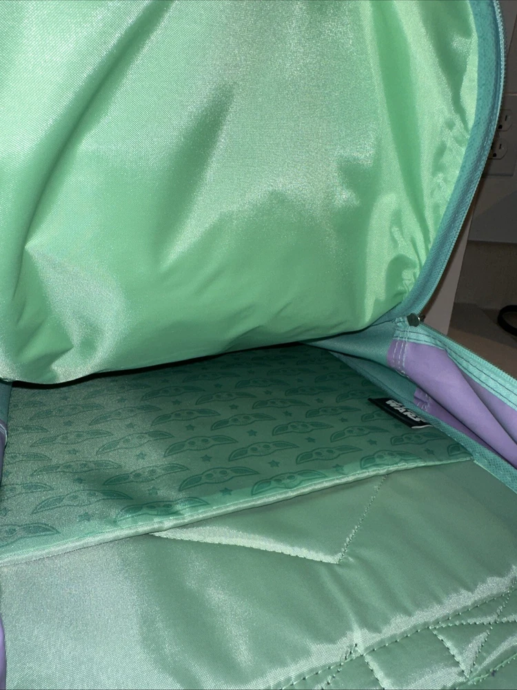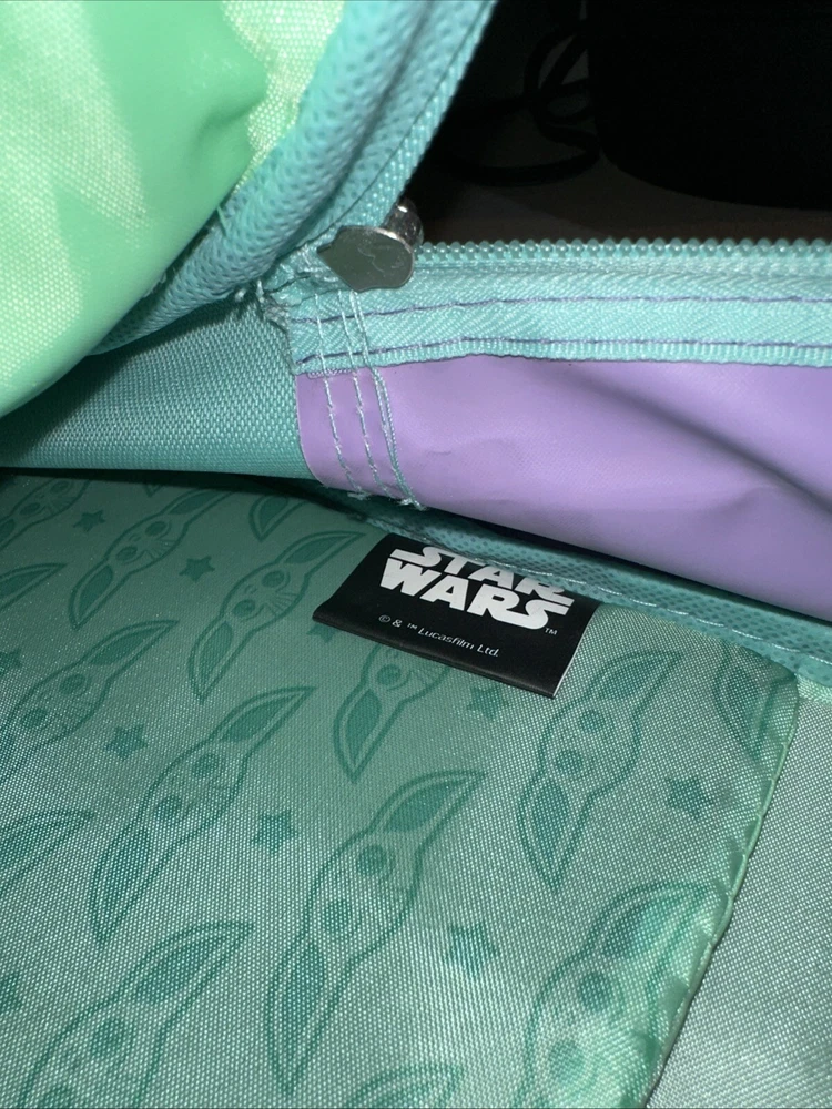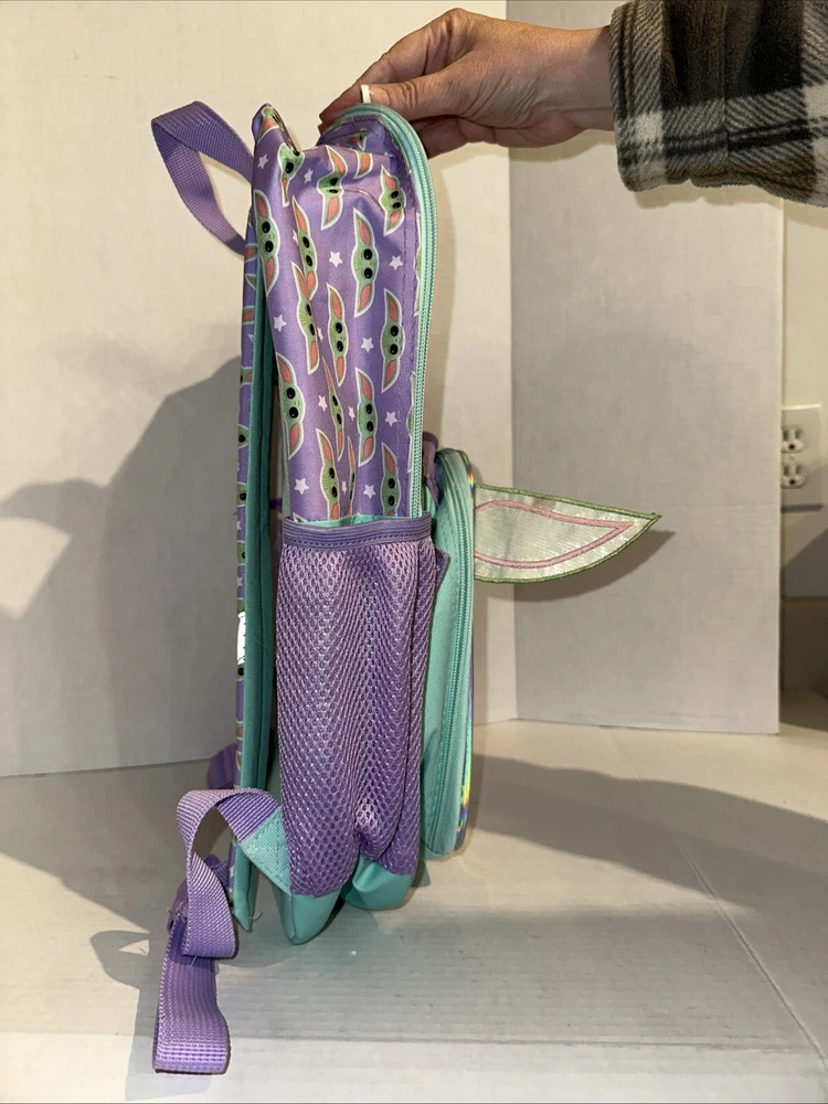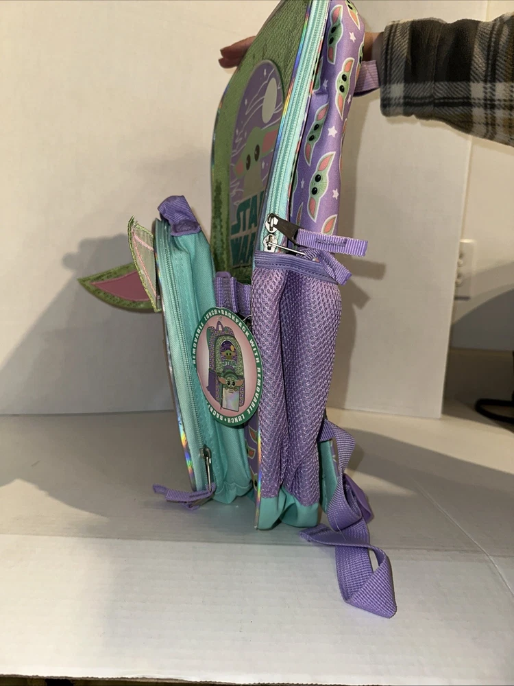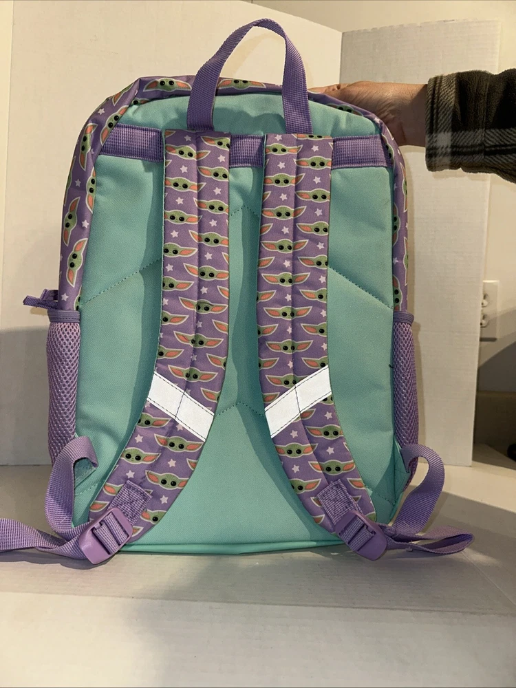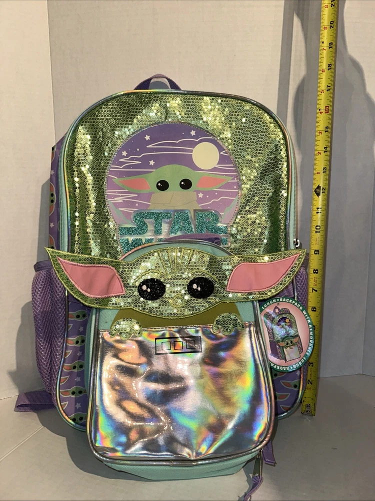Style: Backpack Character Family: Star Wars Brand: Disney Accents: Sequin Closure: Zip Bag Width: 12 in Theme: Stars Bag Depth: 4 in Department: Unisex Kids Color: Purple And Green Bag Height: 18 in Material: 100% Polyester Size: Large
