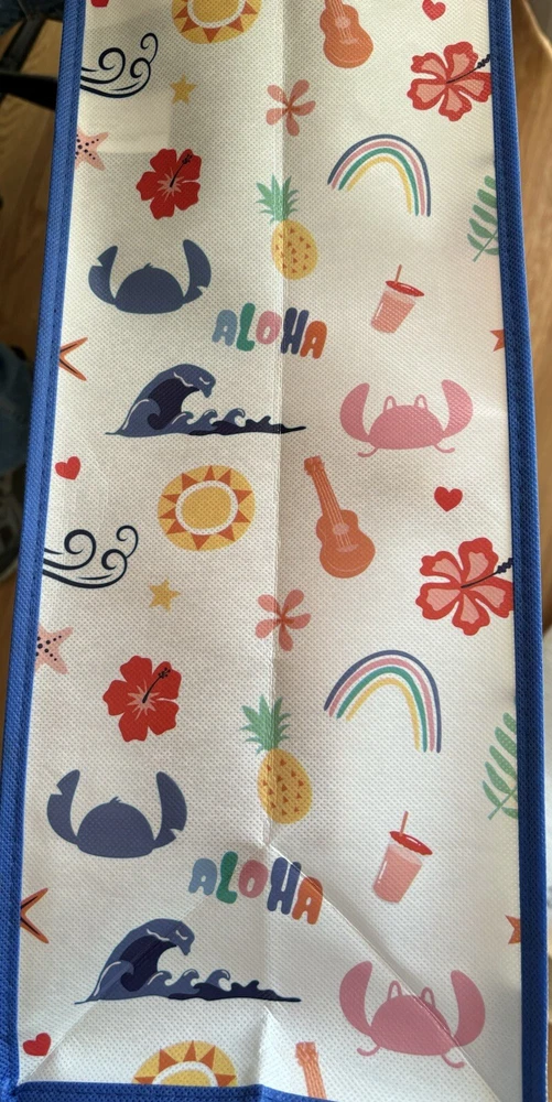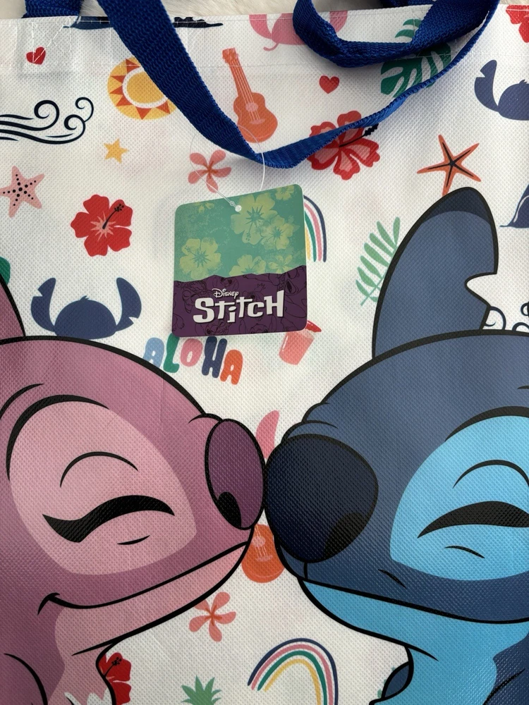 Bring home the magic of Disney with this X-Large reusable tote bag featuring Stitch and Angel. Perfect for shopping or a day at the beach, this multicolor bag is made by Legacy Licensing Partners and is an officially licensed Disney product. With its spacious interior and sturdy construction, this bag is a must-have for any Disney fan. Made in China and part of the Disneyana franchise, this bag is a great addition to any collection. The bag measures 19 1/2 by 18 by 7 inches.