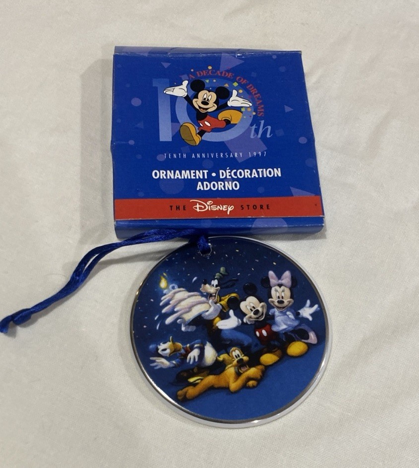 Celebrate Disney's 10th anniversary with this rare and collectible porcelain Christmas ornament featuring a birthday cake design with Mickey Mouse. Released in 1997, this Disneyana collectible captures the magic and nostalgia of the beloved franchise. Perfect for any Disney fan or collector, this ornament is a unique addition to your holiday decorations or display. Made of high-quality porcelain, this ornament is a timeless piece that celebrates the iconic character and story of Mickey Mouse.