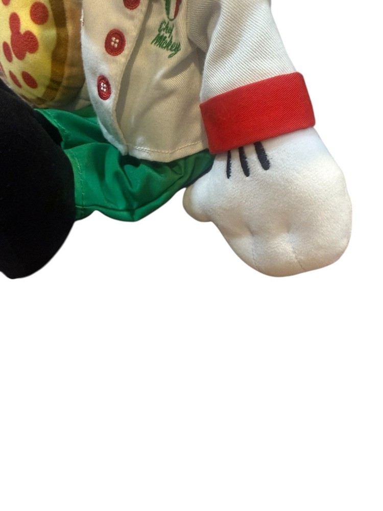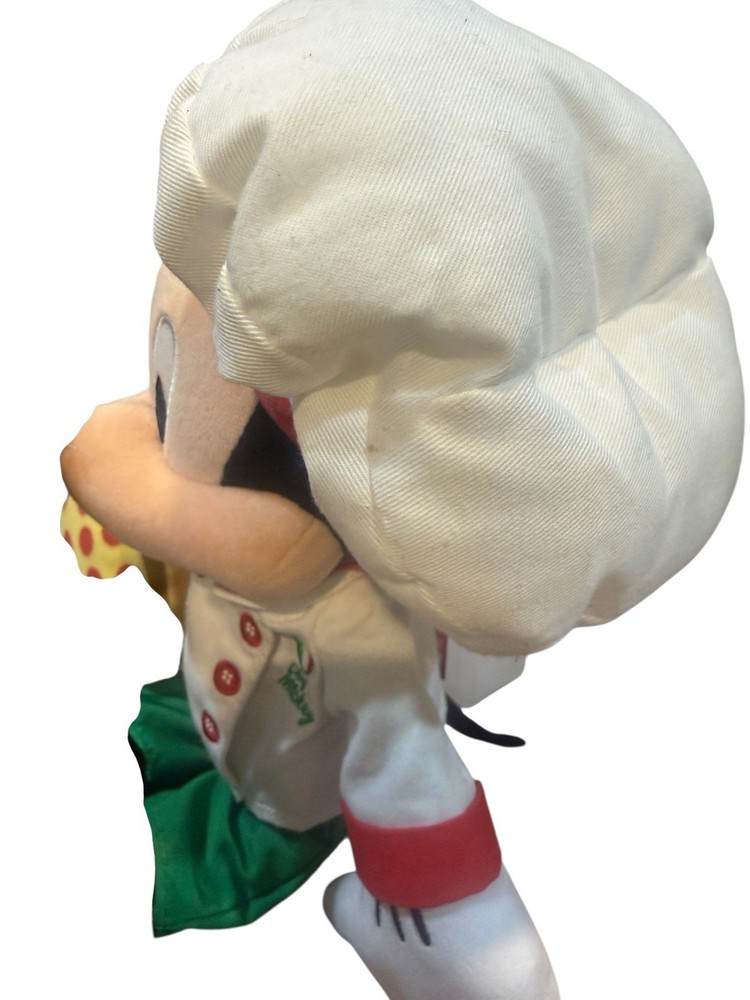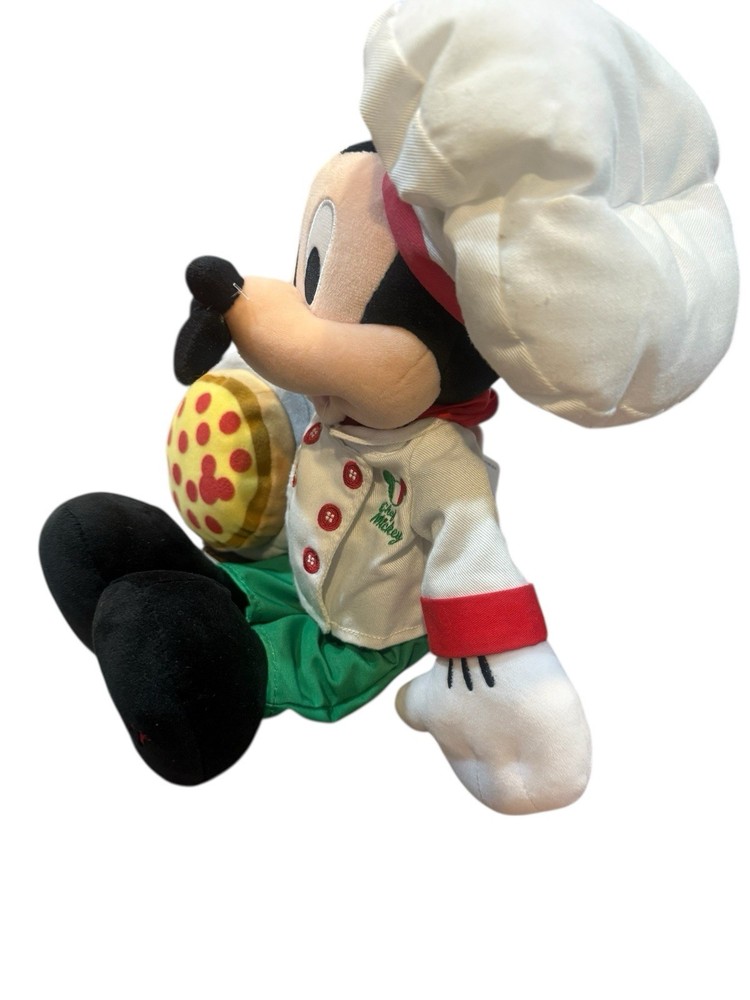 Bring the magic of Disney’s Epcot World Showcase home with this adorable Mickey Mouse Chef Plush from the Italy Pavilion! This limited-edition collectible, originally released in 2017 as a Disney Store Italia and Walt Disney World exclusive, features Mickey dressed as a charming Italian pizza chef. He’s ready to serve up some fun with his non-removable white chef’s jacket embroidered with “Chef Mickey” and an Italian flag, red and green accents, a “Mickey’s Pizzeria” neckerchief, and a tall chef’s hat. In his hand, he holds a soft plush pizza accessory complete with pepperoni toppings that hide a subtle Mickey shape. Key details: • Detachable magnetic mustache for customizable play. Still attached with plastic • Soft, huggable plush construction with bean-filled bottom for easy posing • Measures approximately 15 inches tall (including hat) – perfect for display or cuddling • Materials: Polyester, plastic pellets, polyurethane foam, plastic stiffener, and ethylene vinyl acetate foam • Embroidered “Disney Store Italia” on one foot, highlighting its exclusive origin • Tail and classic Mickey ears add to the authentic Disney charm This plush is in excellent pre-owned condition with no stains, rips, or odors – it looks just like new! It’s a great addition to any Disney collection, a fun gift for Mickey fans, or a nostalgic souvenir from Epcot’s cultural celebrations. Originally priced at $29.99, production was limited and it’s no longer available through official Disney channels, making this a rare find. Please review all photos for exact details, as they are part of the description. Smoke-free home. Ships carefully packaged to preserve its condition. Thanks for looking!