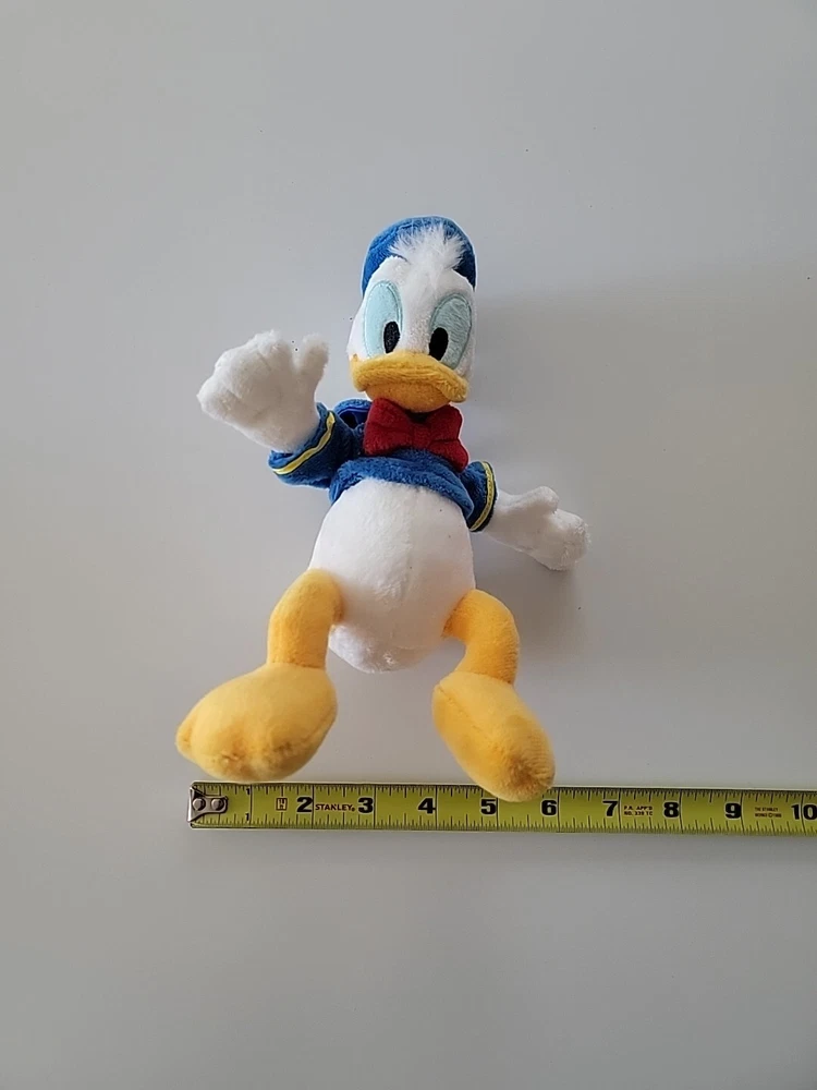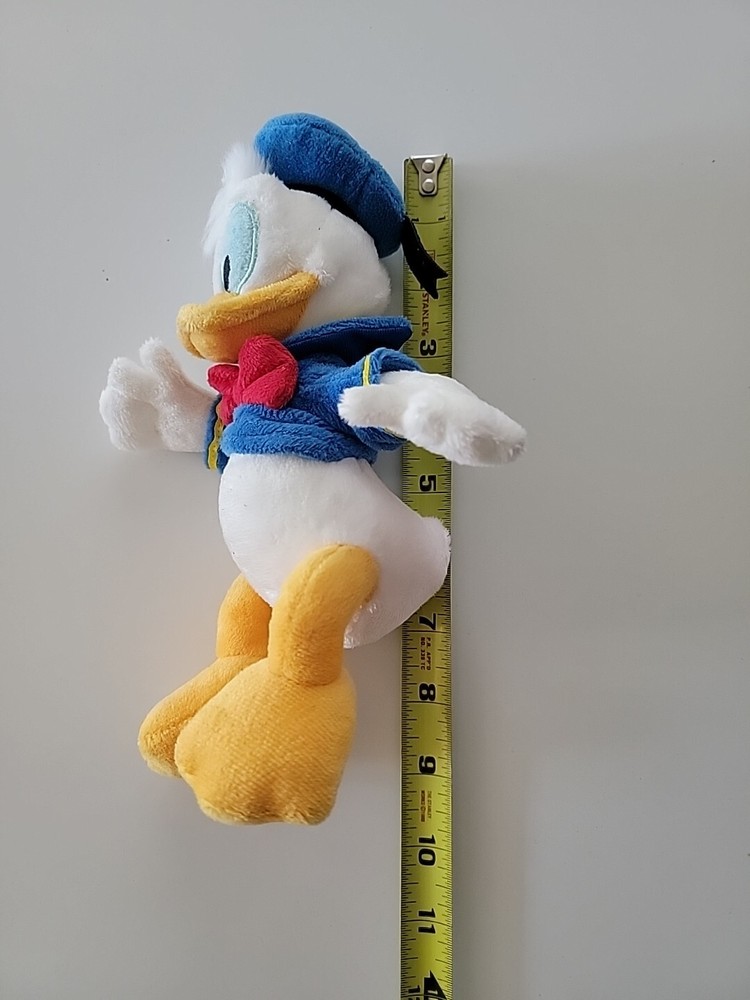 This is a small 9" Donald Duck plush stuffed animal toy from the Disney Store, featuring Donald in a sailor suit. It is part of the Disney franchise and is perfect for collectors of Disneyana and fans of the character. The plush toy is made by Disney and is primarily white in color, making it a cute and cuddly addition to any Disney collection.