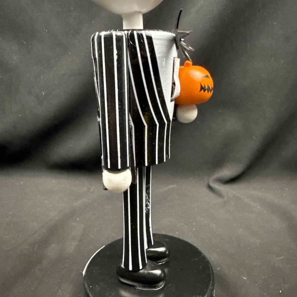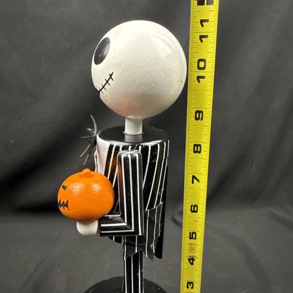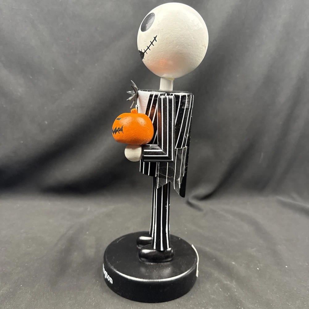 The product is a Disney The Nightmare Before Christmas Jack Skellington Nutcracker, standing at 11 inches tall holding a pumpkin and made of quality wood. This limited edition collectible features the iconic character Jack Skellington in a classic German nutcracker mini retro design, perfect for holiday decor. The nutcracker is reusable every season durable and comes in a decorative standing position, adding a touch of whimsical charm to any collection or seasonal display.