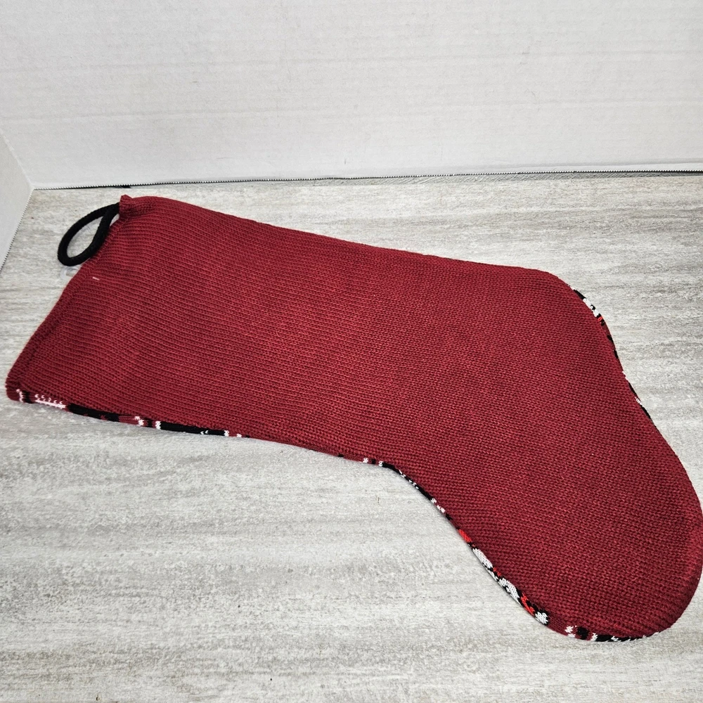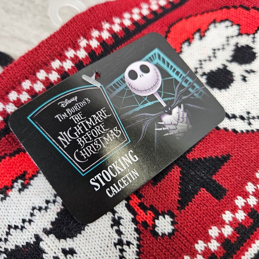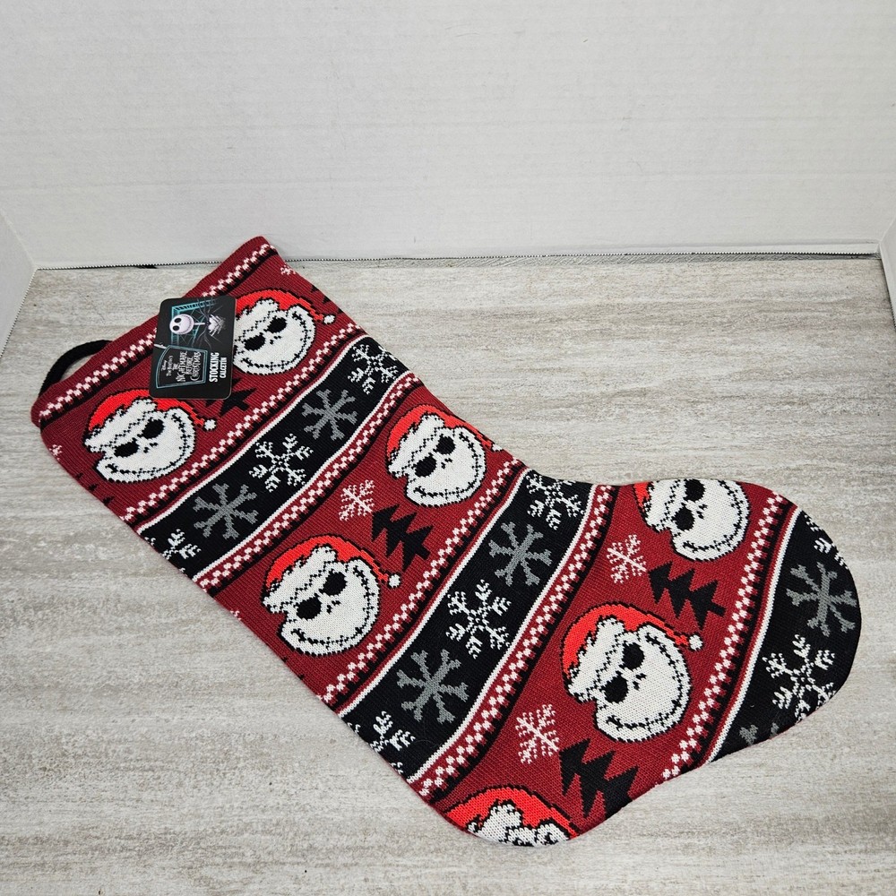Embrace the spooky charm of Halloween Town with this festive stocking, bringing a touch of Tim Burton's iconic "The Nightmare Before Christmas" to your holiday decor. Adorned with a repeating pattern of Jack Skellington sporting a Santa hat, interspersed with classic snowflakes and pine trees, this stocking is a playful nod to the beloved film. The rich red background, accented with black and white knit details, creates a visually striking and festive piece perfect for hanging by the fireplace. Imagine the delight of discovering your holiday treats tucked inside this uniquely themed stocking, adding a memorable touch to Christmas morning. Ideal for fans of the movie, this stocking is perfect for adding a whimsical and slightly gothic flair to your Christmas celebrations or as a special gift for a fellow enthusiast. Measurements: • Length: 18.11 in • Width at opening: 7.87 in • Width at foot: 19.69 in Type: Christmas Stocking Occasion: Christmas Set Includes: Christmas Stocking Department: Adults Material: Fabric, Cloth, Polyester Character: Jack Skellington Number of Items: 1 Character Family: The Nightmare Before Christmas Theme: Holiday Shape: Tree Pattern: Striped Item Length: 18 in Item Height: 18 in Keywords: Jack Skellington, Christmas stocking, Tim Burton, Nightmare Before Christmas, Holiday decor, Festive knit, Santa hat, Snowflake pattern, Gift idea, Disney fan, Gothic Christmas, Halloween Town, Winter holidays