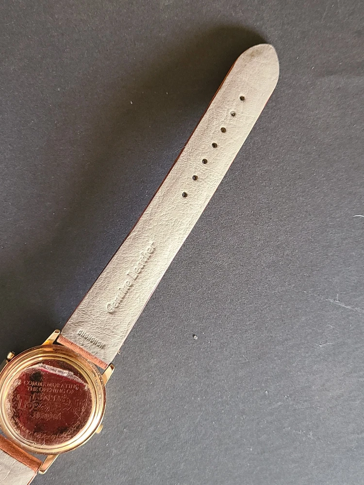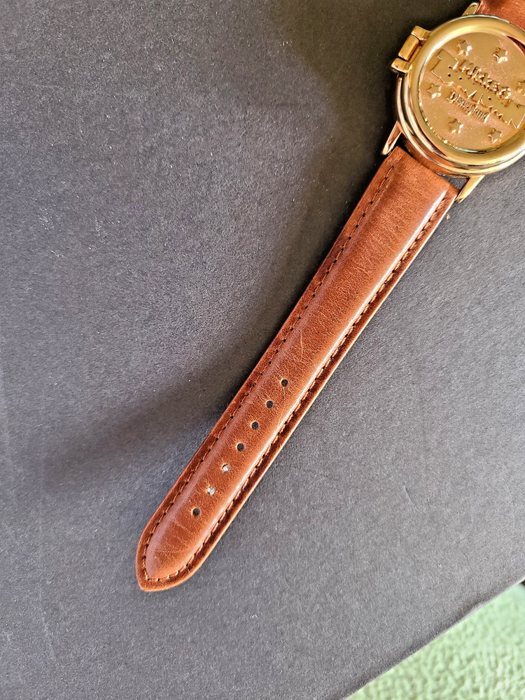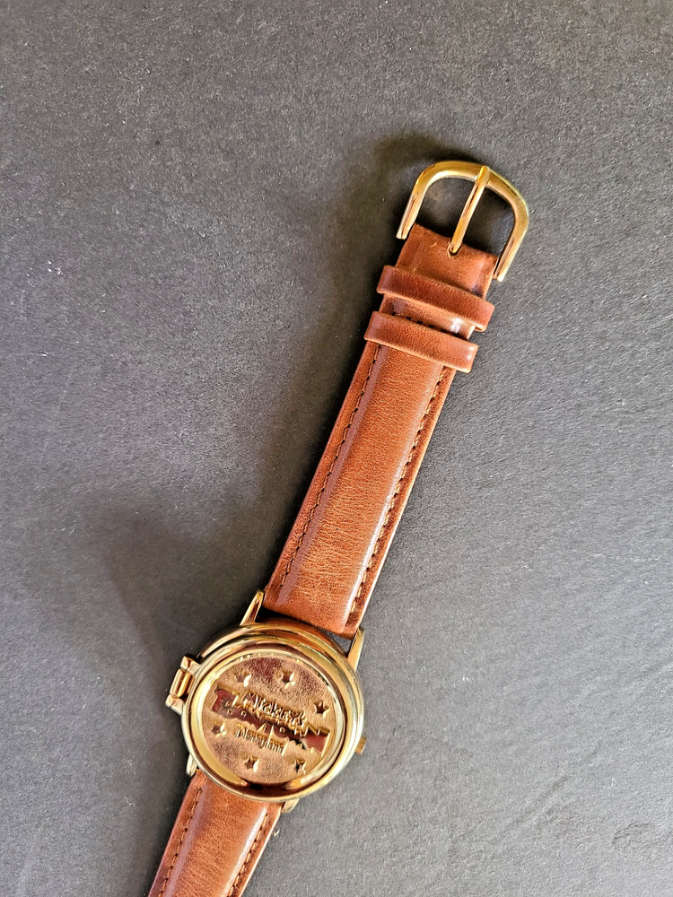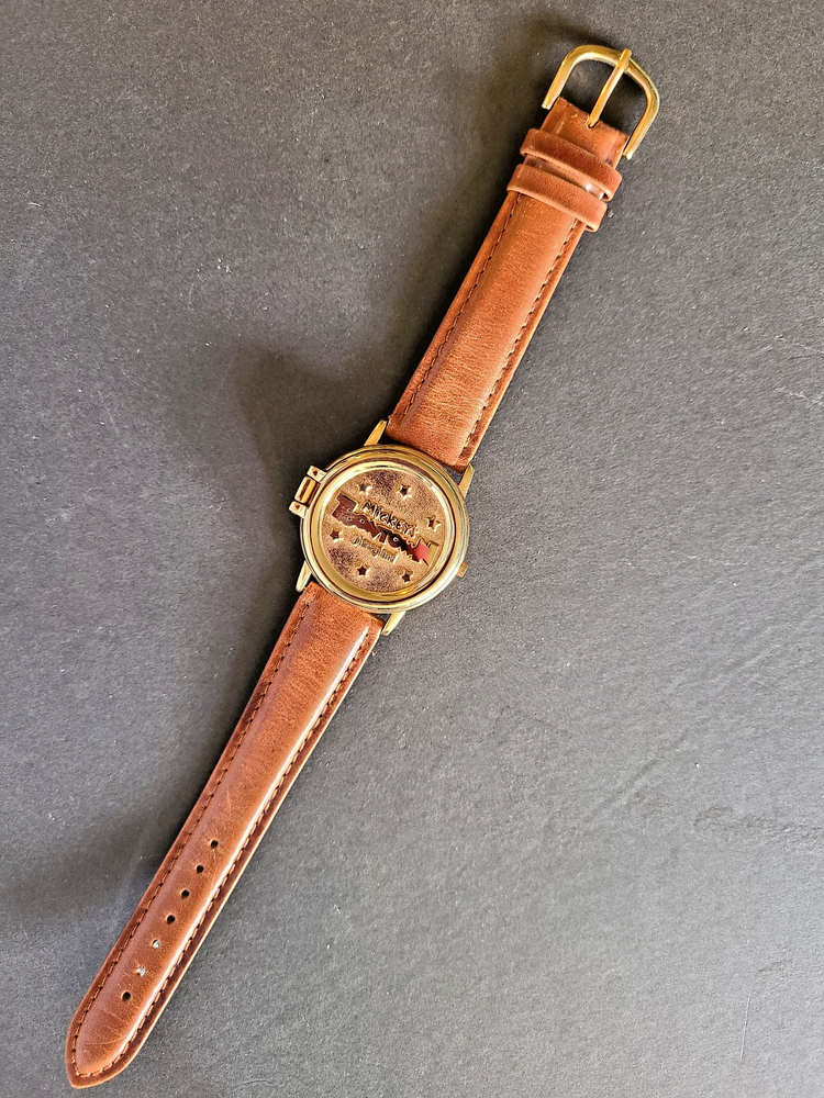 This listing features one of Disneyana watch collectors’ most coveted items ~ a rare Fantasma Disney Toontown Opening Day from 1993. These models are VERY hard to find, especially in this fabulous condition. Stainless steel caseback reads “Commemorating the Opening of Mickey's Toontown, Disneyland.” The watch is in beautiful condition, never worn. On the back of the watch, the plastic protective covering is starting to become undone. The gold-toned metal cover has "Mickey's Toontown Disneyland" with six gold stars. Press the button on the side and the cover swings open and the watch element springs out! The colorful dial featuring Mickey, Minnie, Goofy, and Donald Duck. Red circles on the underside of the crystal mark the hours. This whimsical beauty sports the original brown leather band. A new battery placed and the watch is running strong. It ships without box or papers. Protect yourself and your money! You work hard for your dollars, don't give them away to just anybody. We have been trusted eBay sellers for almost 25 YEARS and our feedback reflects the high level of customer satisfaction you can expect from us! Read your auctions carefully before bidding. We NEVER ship out watches that aren't running or need batteries (unless stated otherwise in ad, such as with a vintage watch or one sealed in original packaging). And all of our items are official merchandise from the licensed manufacturer, not cheap knock-offs. Please note that all pictures and ad content are COPYRIGHT and may not be used without permission. We have a generous return policy! When you buy from someone listing a watch that "just needs a battery" or sold "as is", check their return policy! If you receive an item that is not working you will be stuck with a non-working watch. Our watches have a new battery professionally placed before shipping, unless the item is still in original packaging and needs a battery. SMOKE-FREE ENVIRONMENT 9