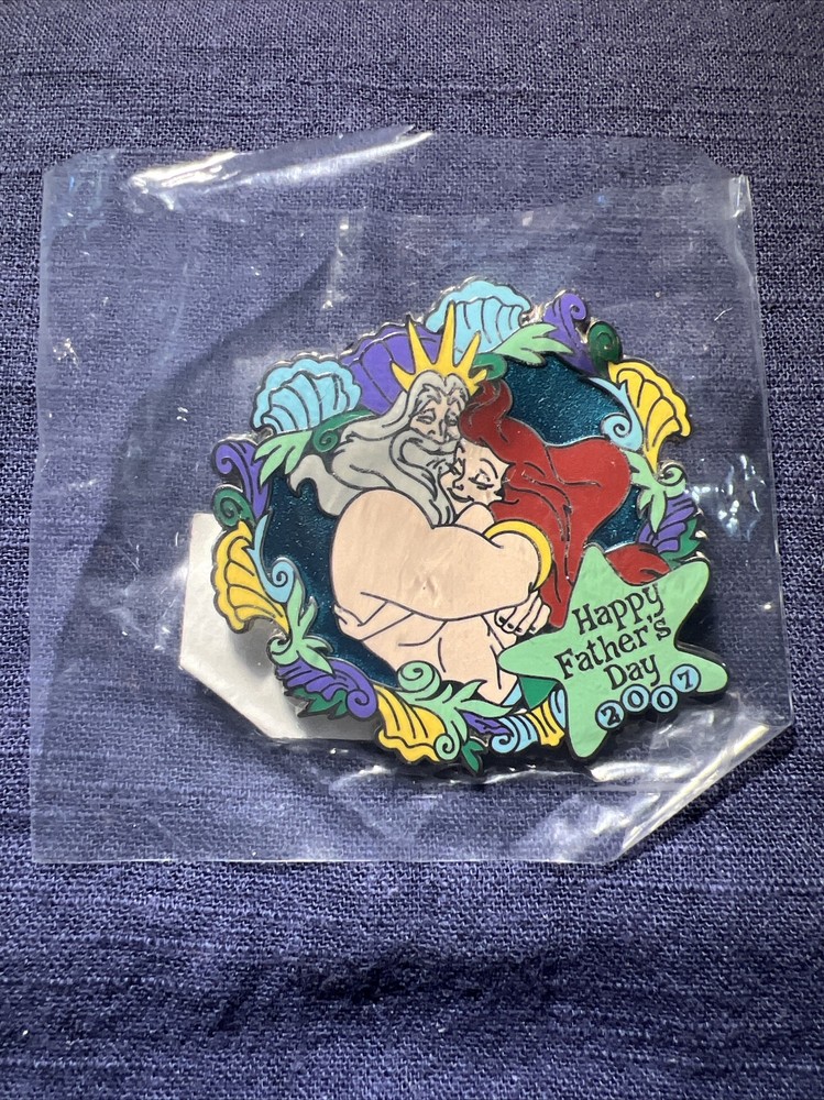 This pin features Ariel and King Triton from The Little Mermaid. King Triton and his daughter Ariel celebrate Father's Day 2007 in this Limited Edition, Cast Exclusive pin. Pins reads: "Happy Father's Day 2007" This pin will be released at Company D locations, and will only be sold to Cast Members and certain other employees of the Walt Disney World® Resort.