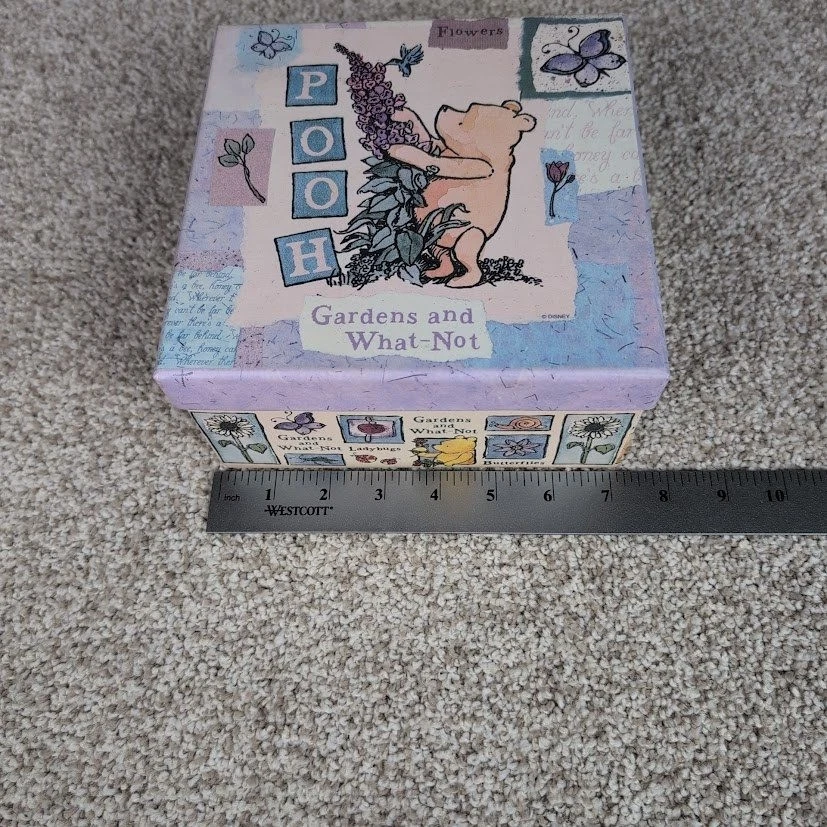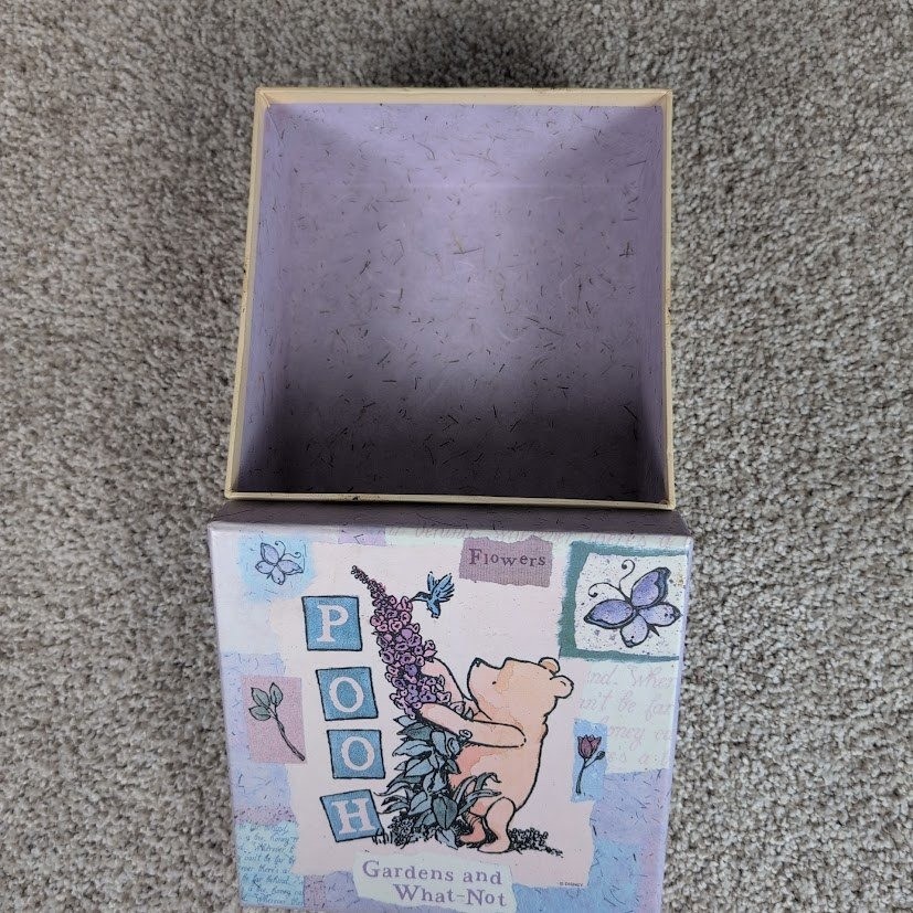 Vintage Winnie the Pooh Gardens and What-Not memories box See Pictures for measurements Perfect decor for a nursery or kids room Some wear and tear on the bottom From Smoke Free/Cat Friendly Home Keywords: Winnie the Pooh, Disney, Box, Gardens and What-Not, Flowers, Butterflies, Collectible, Decorative Box, Pooh Bear, Storage Box, Disneyana, Vintage Disney