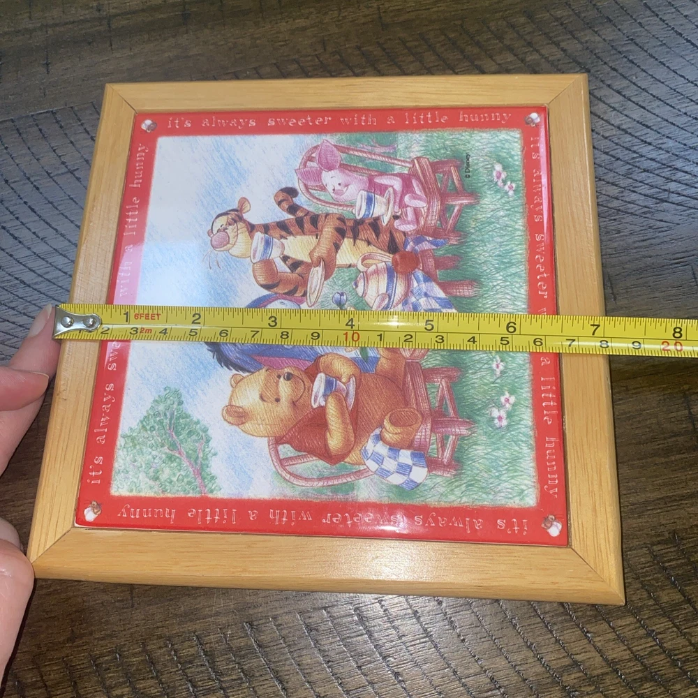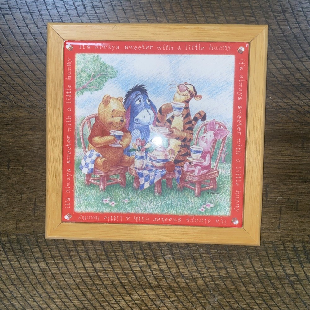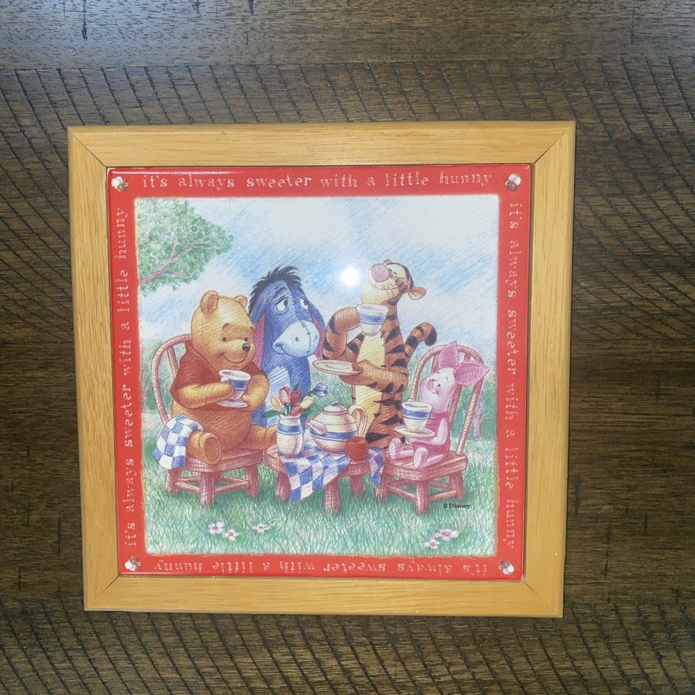 These collectible Winnie the Pooh and Friends and Piglet wall plaques or trivets feature beloved characters from Disney's Winnie the Pooh franchise, including Piglet, Pooh, Eeyore, and Tigger. Measuring at 7” by 7” these picnic Winnie the Pooh and Piglet art can be hung on the wall or used as trivets. They are a must-have for any Disney or Winnie the Pooh collector. Made in Taiwan, these pieces are a great addition to any collection and sure to bring joy to any fan. These are in good used condition. Any scuffs or marks are shown in photos.
