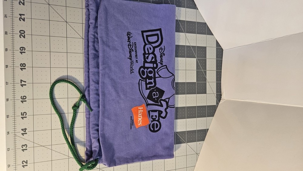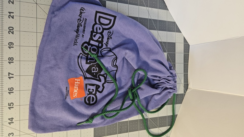 The Walt Disney World Design-a-Tee Drawstring Bag is a collectible item inspired by the iconic Disney franchise. it is made of a purple jersey material and closes with a drawstring. Perfect for fans of all ages, this drawstring bag is a fun and whimsical way to commemorate a magical day at Walt Disney World.