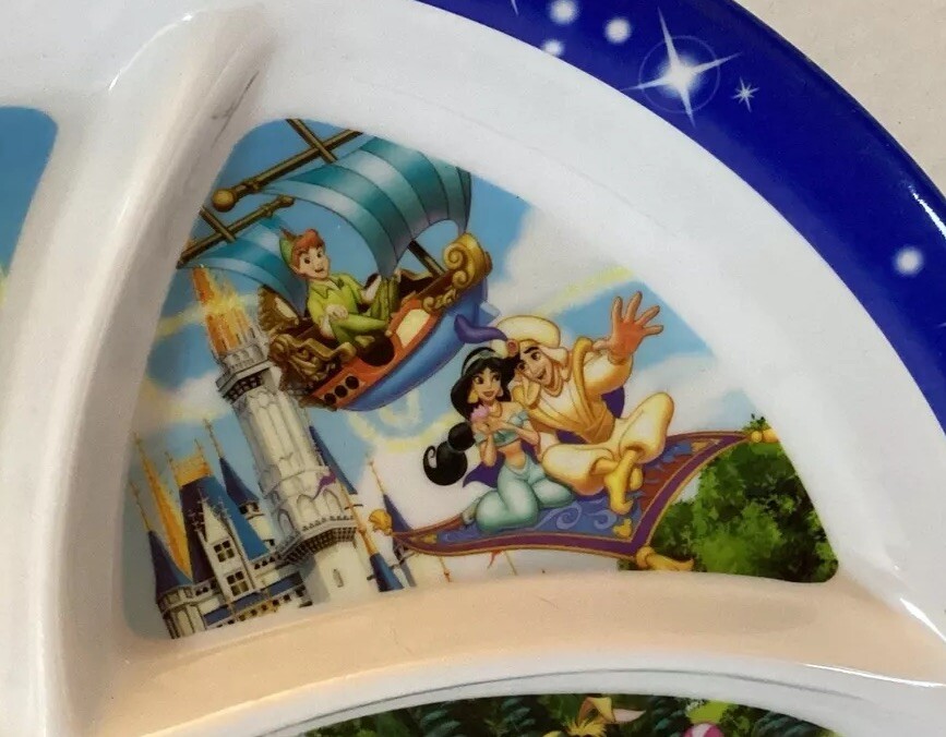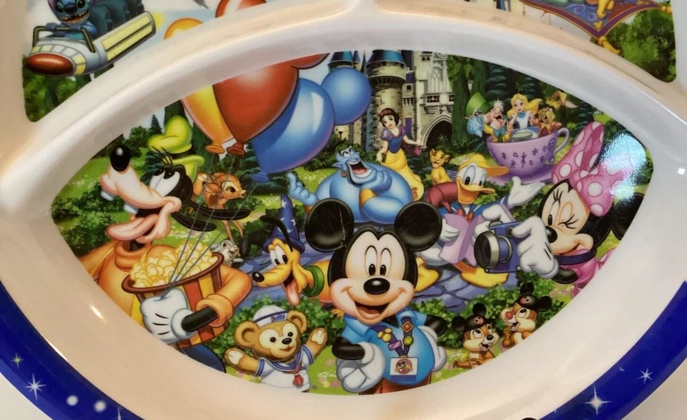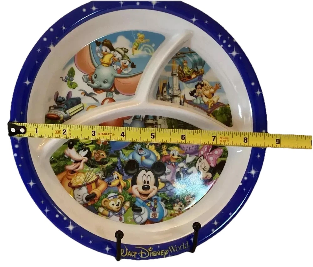 This product is a souvenir divided plate featuring Mickey Mouse and Dumbo, sold at Walt Disney World parks. The plate is 10 inches in size and was manufactured in China. It is a part of the Disney franchise and is categorized as a Disneyana collectible.