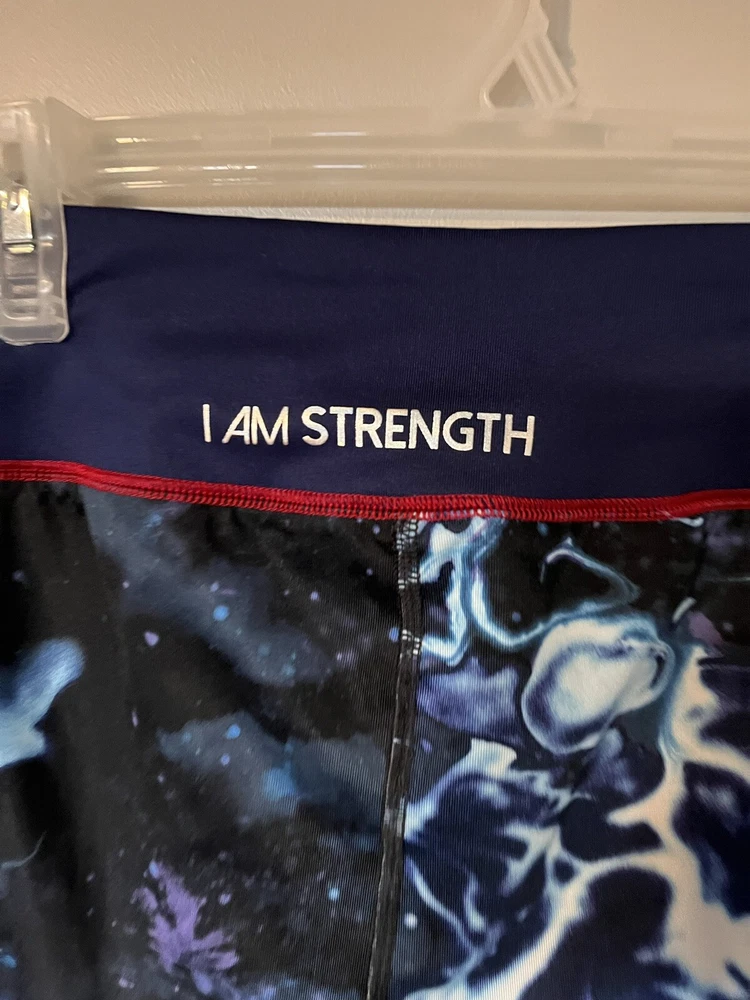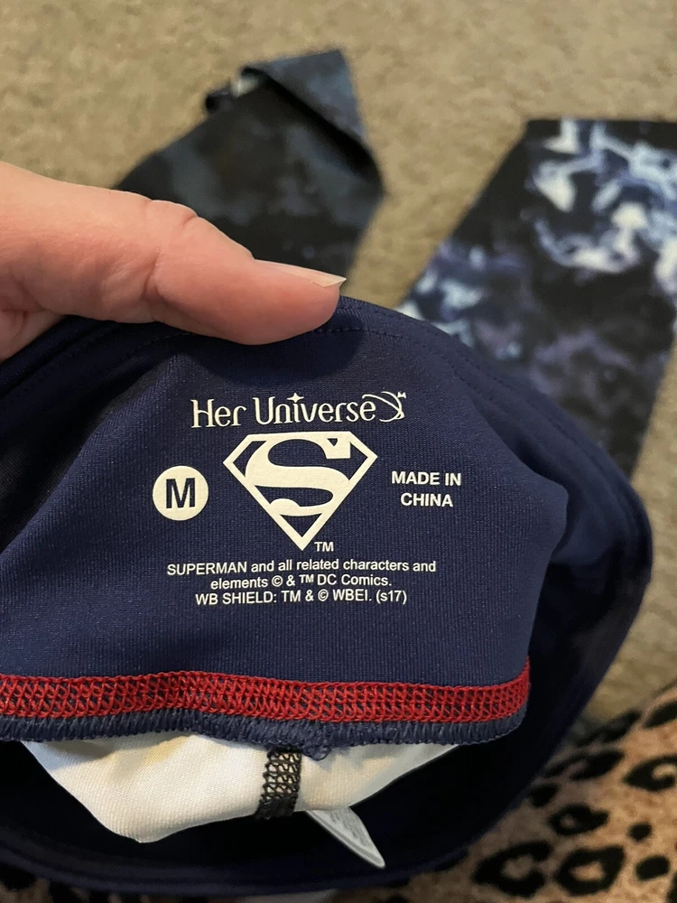Her universe Size medium, see size chart included in pictures Galaxy print Lightweight windbreaker and cropped leggings Superman theme DC comics Excellent condition, zipper is a little stiff on jacket but not a flaw. Is the way it is made.