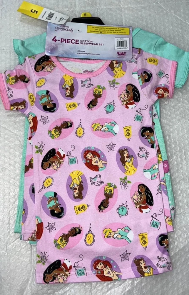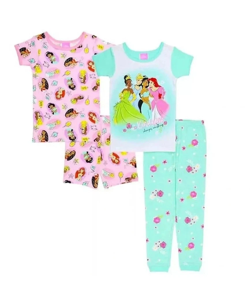 Make your little girl feel like a Disney princess while she sleeps in style with this charming 4-piece sleepwear set. The set includes a short-sleeve top, comfortable shorts, and two coordinating accessories, all featuring her favorite characters Belle and Cinderella. The blended fabric is soft and breathable, ensuring a cozy and comfortable night's sleep. The set comes in size 5 and is perfect for girls who love the magic of Disney and dressing up in their favorite characters.
