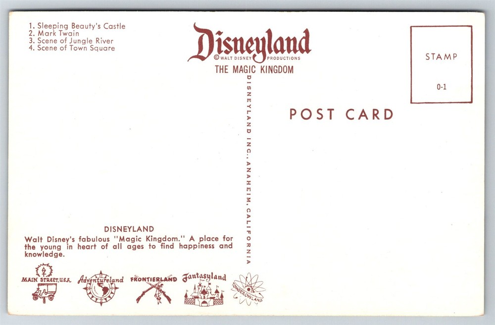 Disneyland 4 Views Castle Mark Twain Jungle River Town Square CA Postcard Y3 Thank you for visiting! This is a standard size postcard, 3.5" X 5.5". In stock, usually ships within 24 hours of your purchase. Please ask questions if you are unsure about anything. Our goal is for your complete satisfaction with the postcard and your experience. Check all my other listings in my store. RETIREDWITHBOOKS Powered by SixBit's eCommerce Solution