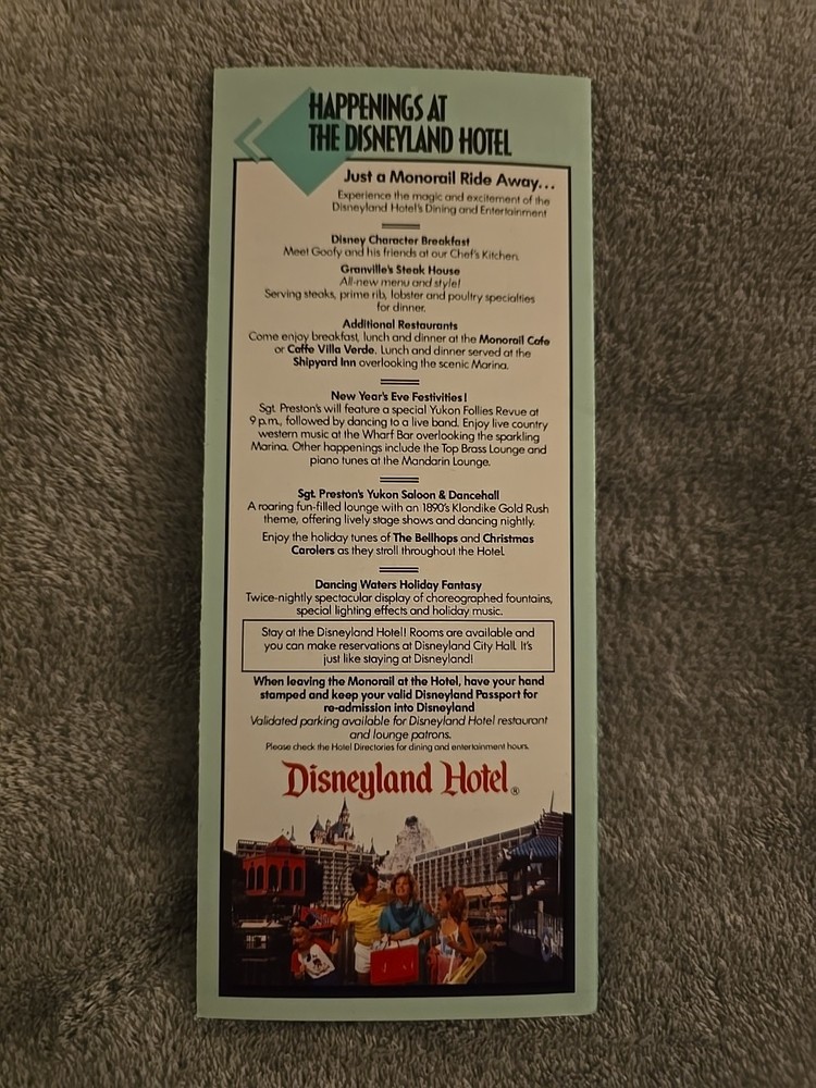 Today at Disneyland Brochures Lot of 1 from December 1989 - dates in photo. Features New Years Eve activities. Features a list of all entertainment at the park for the time period noted above and a map of the parade route. Guides are in near-mint to mint condition (see pictures) and will be shipped in firm packaging to protect them. I have a bunch of other guides available. Check out my other listings!