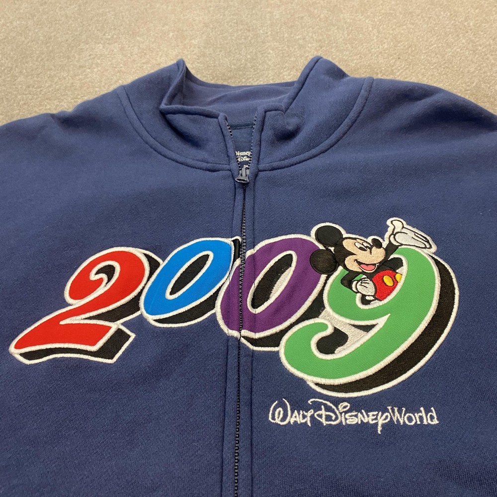 Disneyland Walt Disney World Jacket Mens XL Blue 2009 Mickey Mouse Full Zip Sweater Condition: Gently worn, no visible flaws, excellent preowned condition Features full zip front, side pockets, and vibrant 2009 Mickey Mouse graphic on front and upper back Material: 80% cotton, 20% polyester (exclusive of decoration), made in Thailand Color: Blue with gray striped ribbed cuffs and hem Official Disneyland and Walt Disney World tag inside, size XL Classic Disney park souvenir jacket—great collectible or everyday casual wear