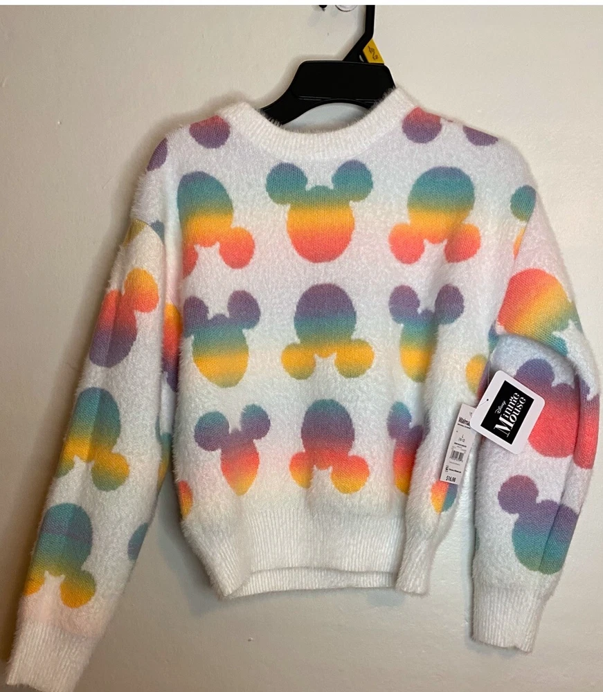 I offer combined shipping. Ask for details before ordering 😊 Thank you! This is a Disney Minnie Mouse sweater in girls size L (10/12), featuring Minnie Mouse ears pattern on a multicolor polyester blend fabric. The sweater has long sleeves, a crew neck, and a pullover closure. It is machine washable and super soft, suitable for casual wear in winter, fall, and spring. The design includes cartoon character themes from Disney's Mickey & Friends.